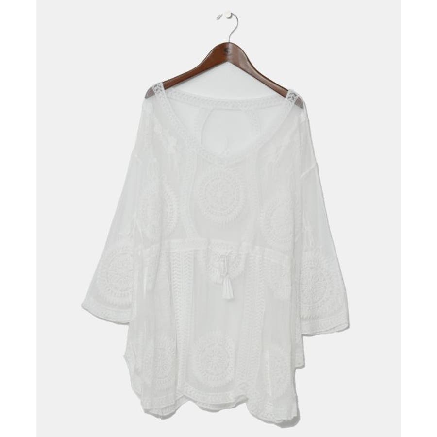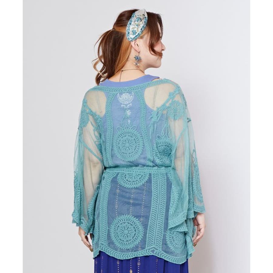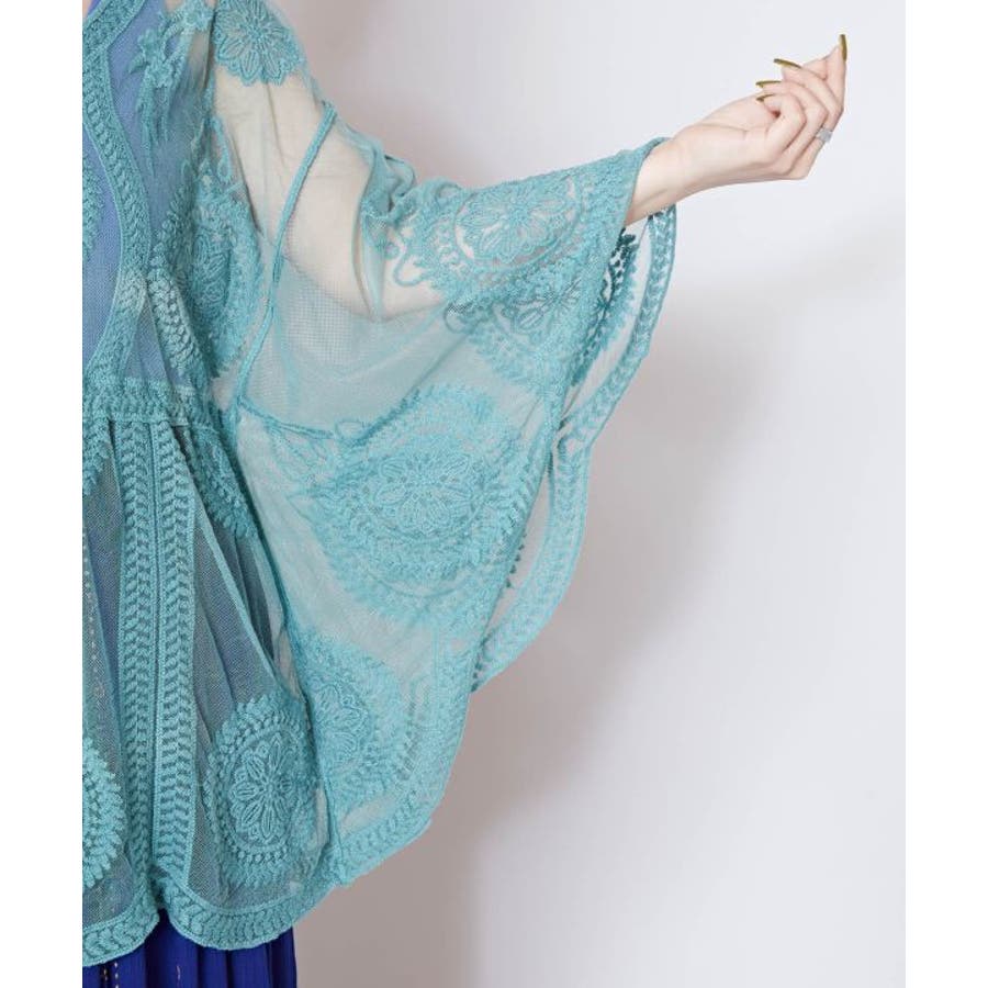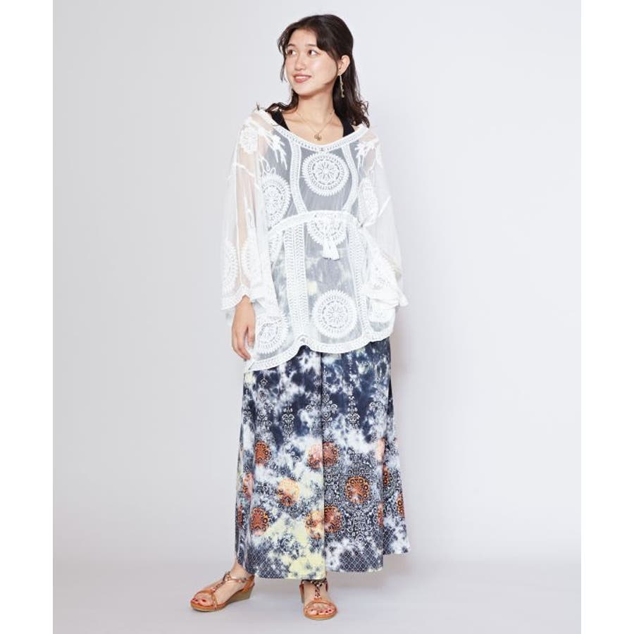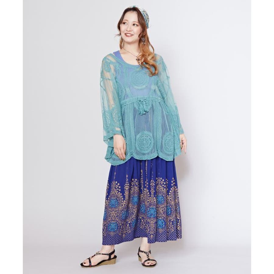 レースの素材が涼し気なトップス。ウエストマークで変形トップスとしても。大胆な刺しゅう模様と鮮やかなカラーバリエーションが魅力的。