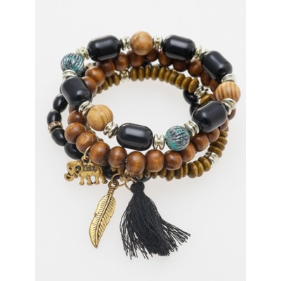ウッド、ビーズ、メタルとフリンジを組み合わせたセットブレス。メタルのチャームたちが存在感を発揮します。ナチュラルテイストだけどエキゾチックに決まる、エスニック初心者から上級者まで幅広くおすすめな商品です。