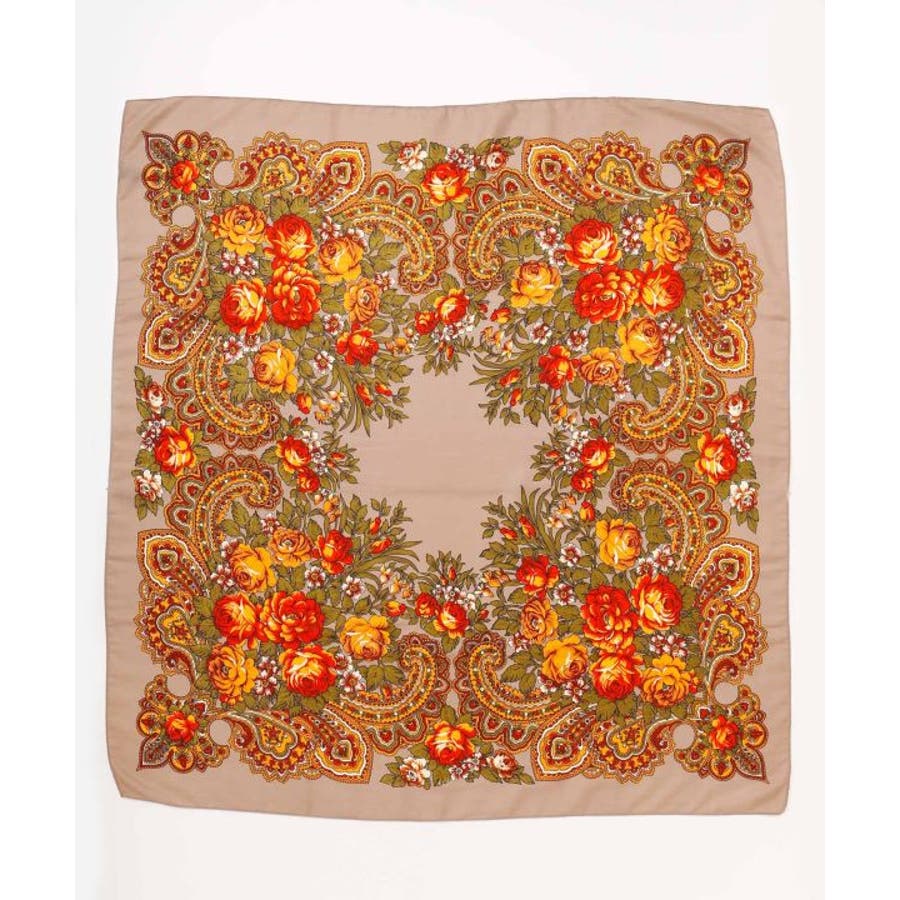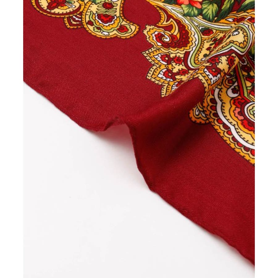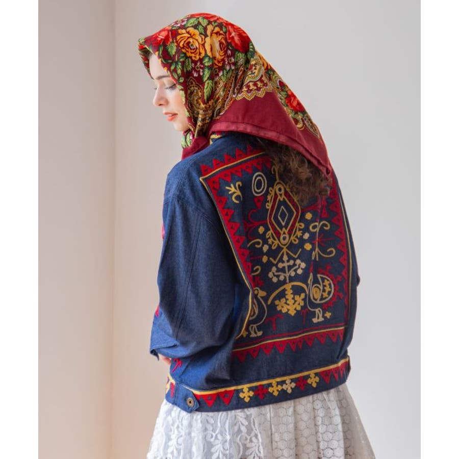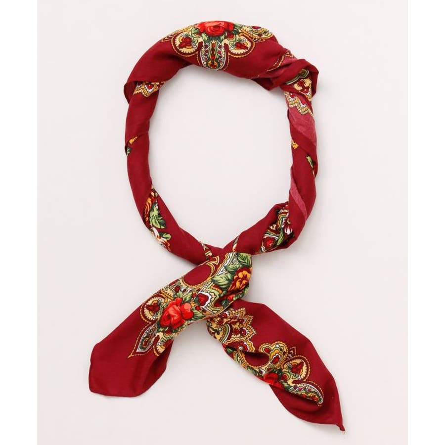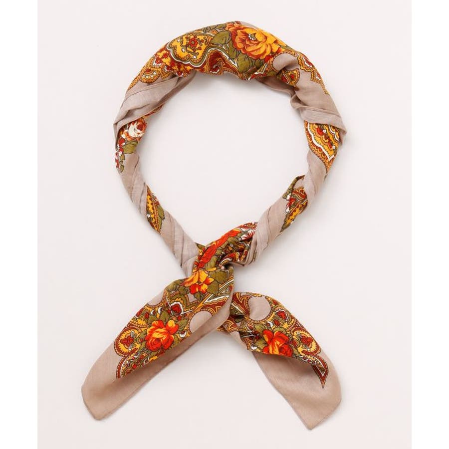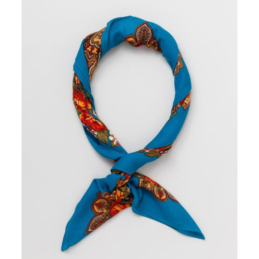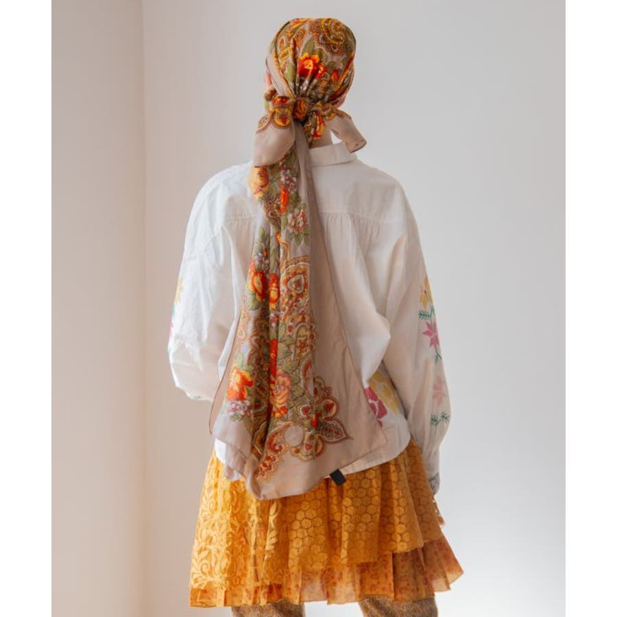 全体に施された鮮やかな花柄が、上品さを際立たせるスカーフ。使い方次第でいろいろな見せ方ができる万能アイテムです。
