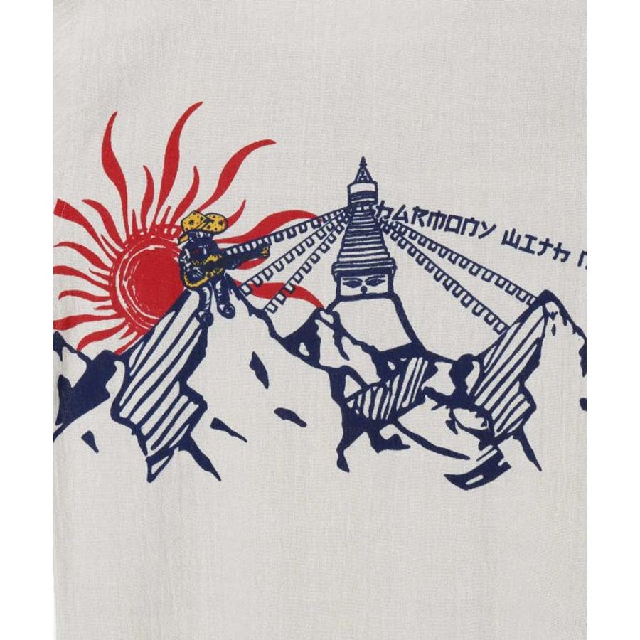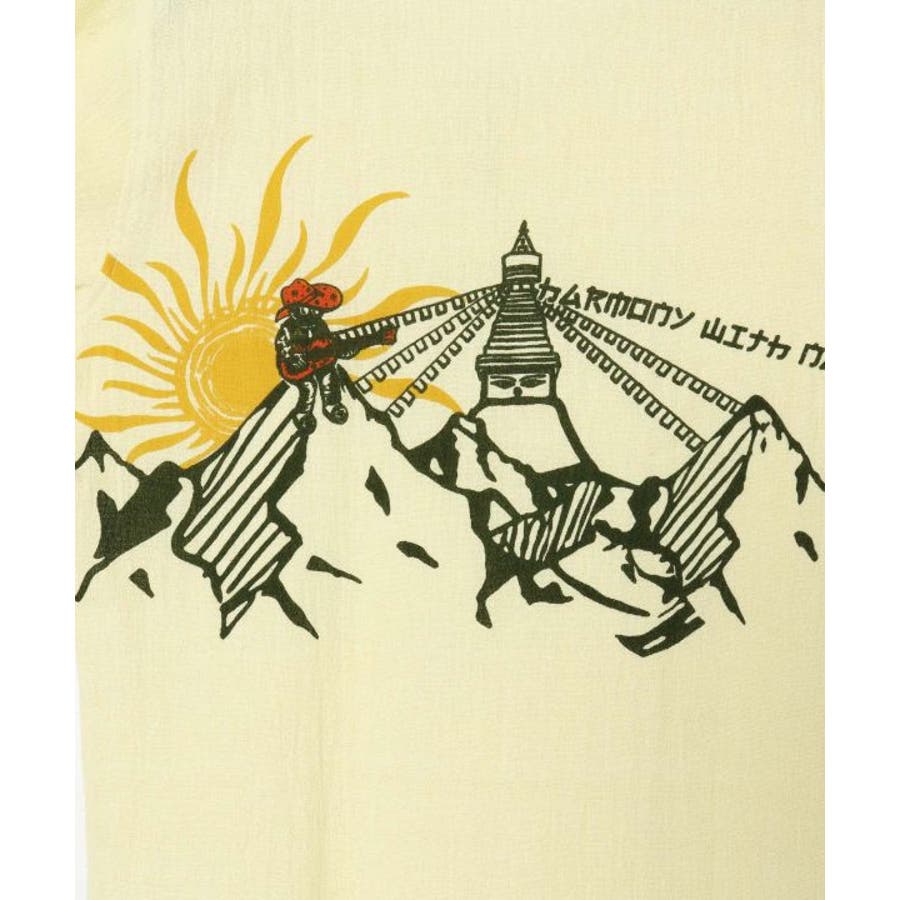 【Amina×洋輔】肌触りの良いインド綿のメンズトップス。旅するミニキャラがチベットの山に登場。大きな太陽の光を浴びながら、山頂でギターを奏でているシーンで自然との調和を表現しました。袖のコンパスは、自然に感謝し、一体化することで、太陽が正しい道に導いてくれることをイメージし、デザインに落とし込みました。