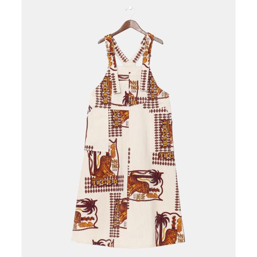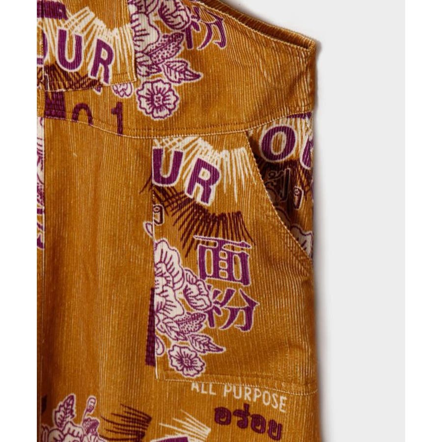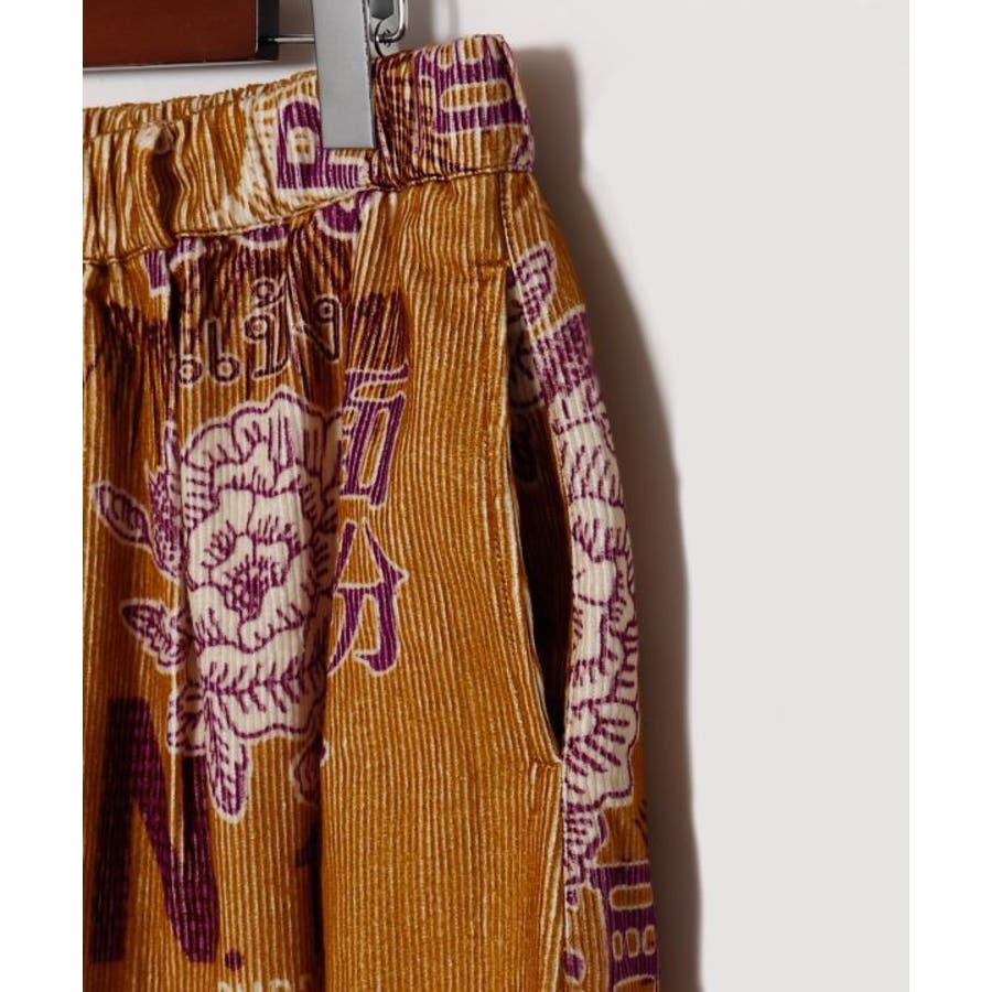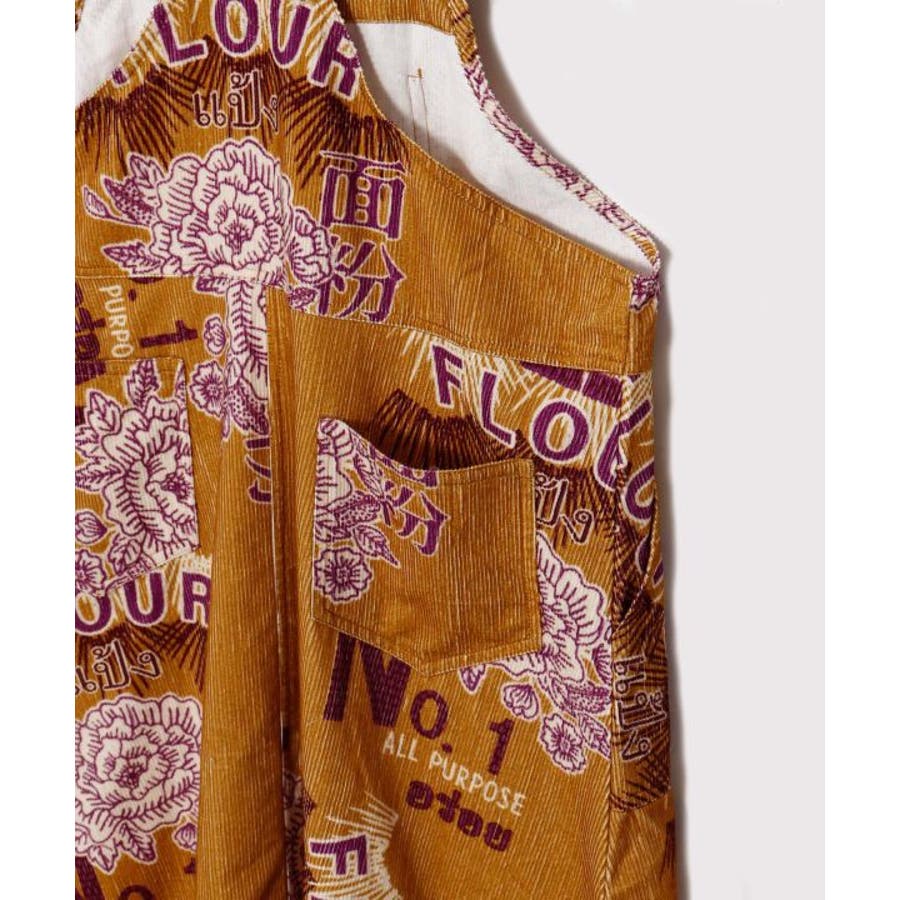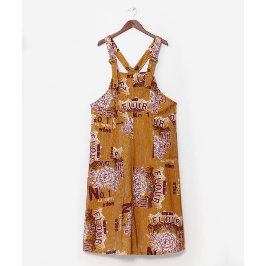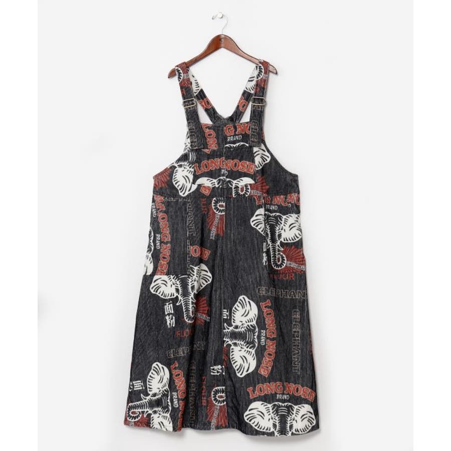 あたたかみのある地厚コーデュロイ生地のサロペットスカート。一味違うカジュアルコーディネートに大活躍。胸元にポケットあり。文明開化を題材に、海外と日本の文化を織り交ぜたレトロでオリエンタルなテキスタイルデザインが魅力の一枚。