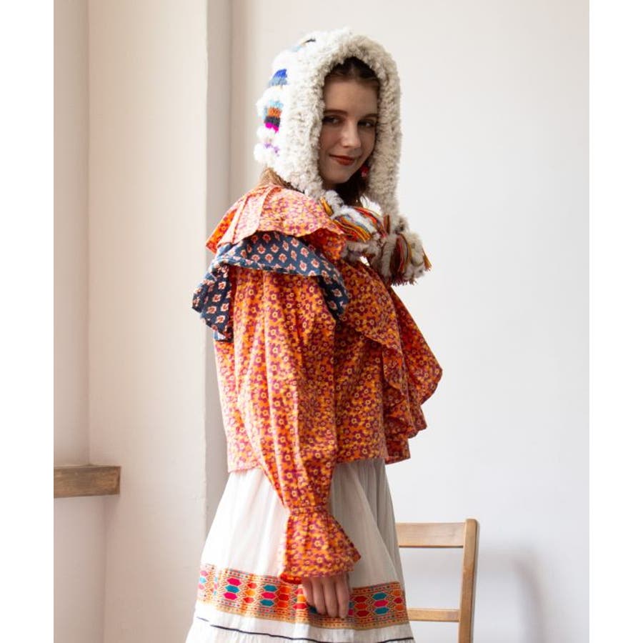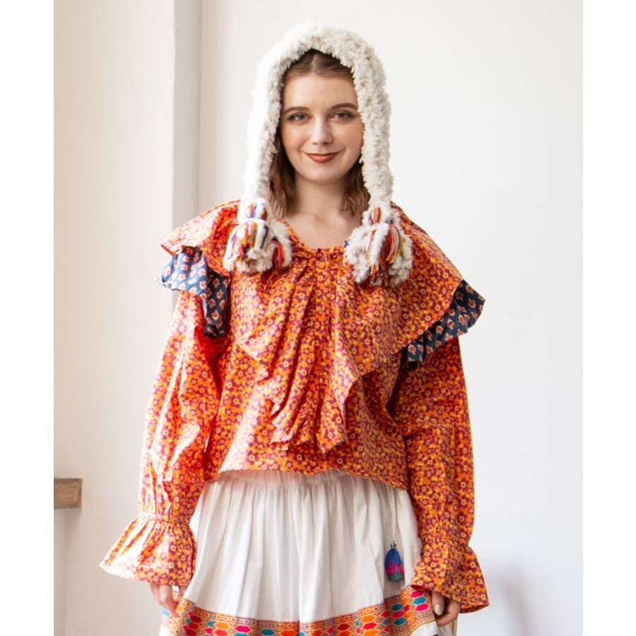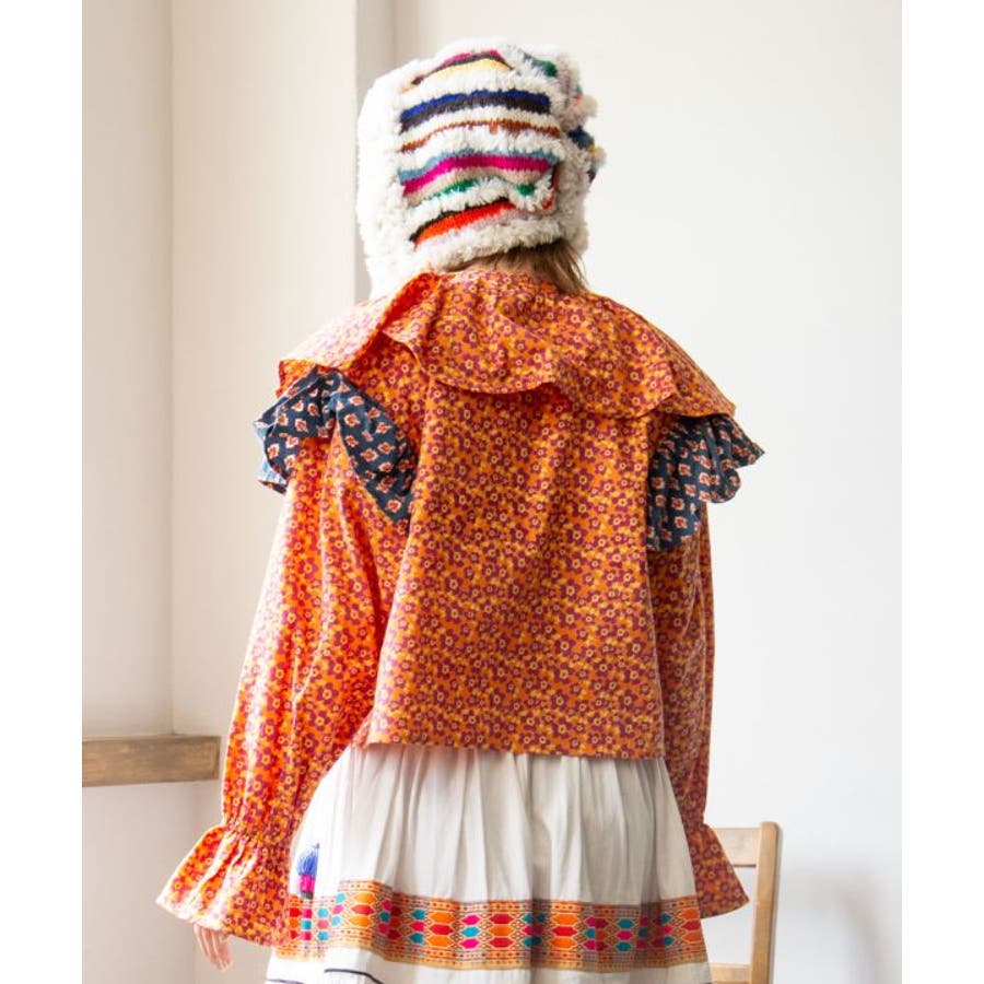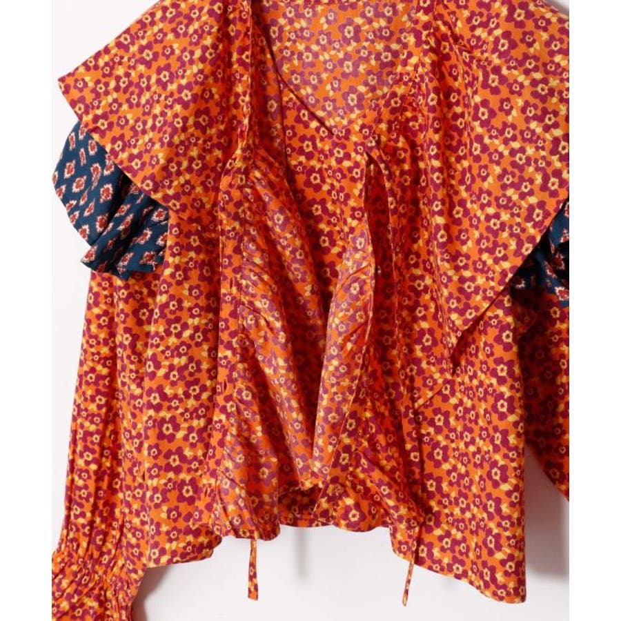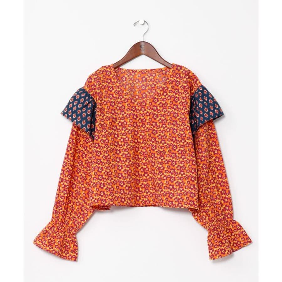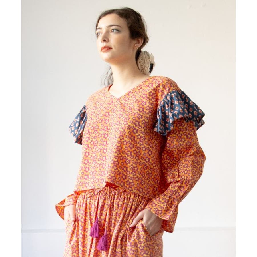 レトロポップな花柄プリントが魅力的な、シーズン問わず着ることができるトップス。しっかりとしたやわらかなコットン素材で、取り外し可能な襟付きの2WAY仕様。ボリュームのある付け襟と袖のフリルが、顔周りを華やかにみせてくれます。