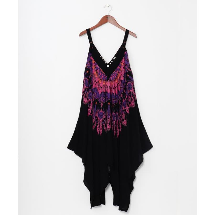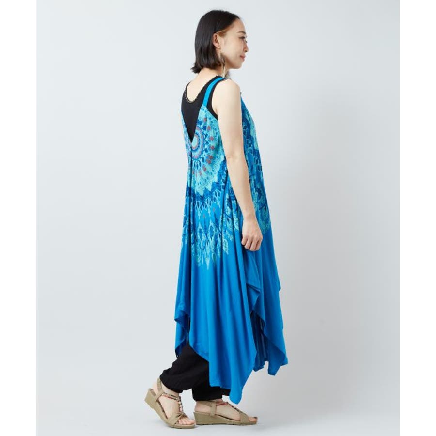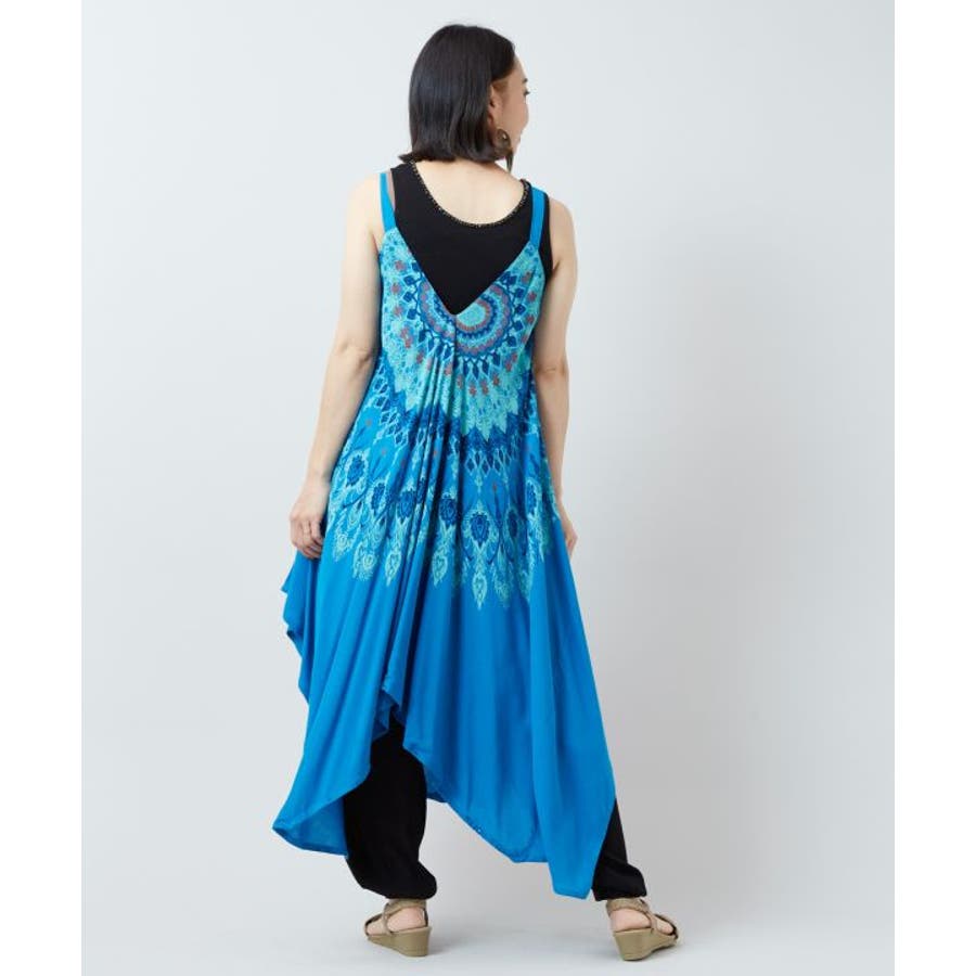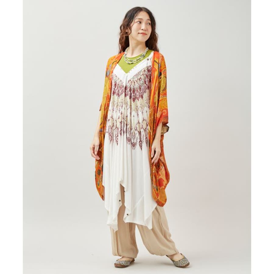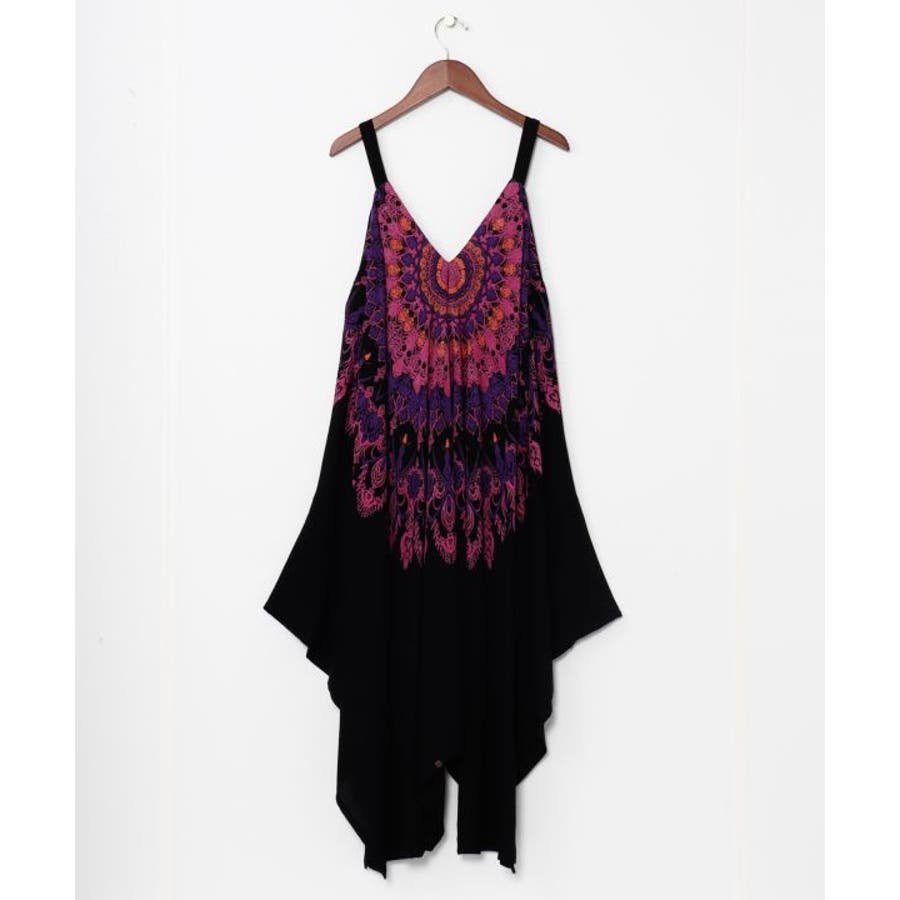 マンダラ柄の2WAYワンピース。裾のボタンでサロペットにも変化。リゾート気分を盛り上げるレーヨン素材の軽やかな着心地。