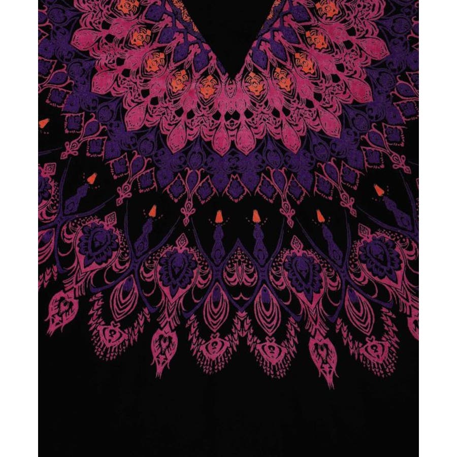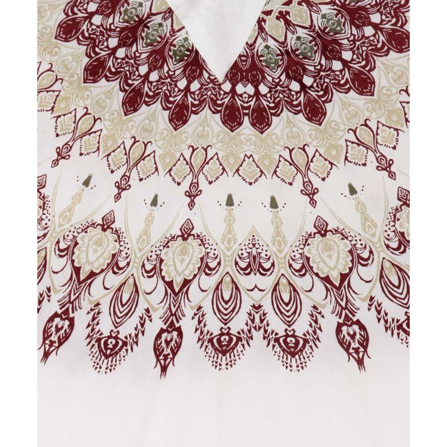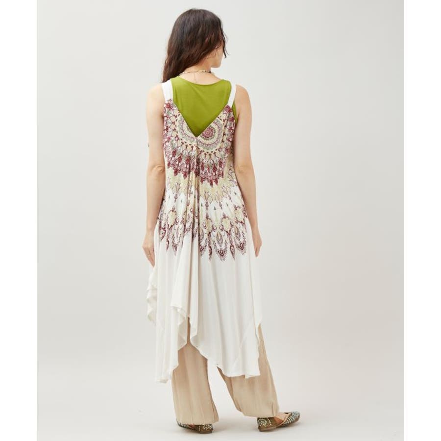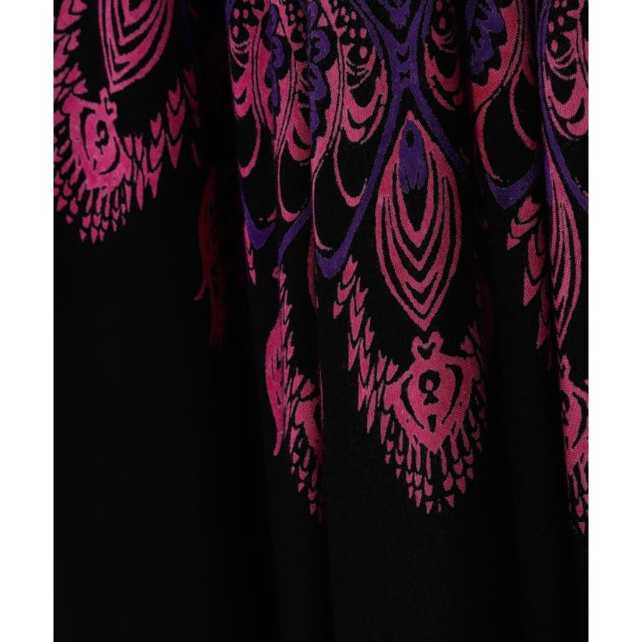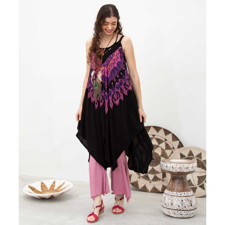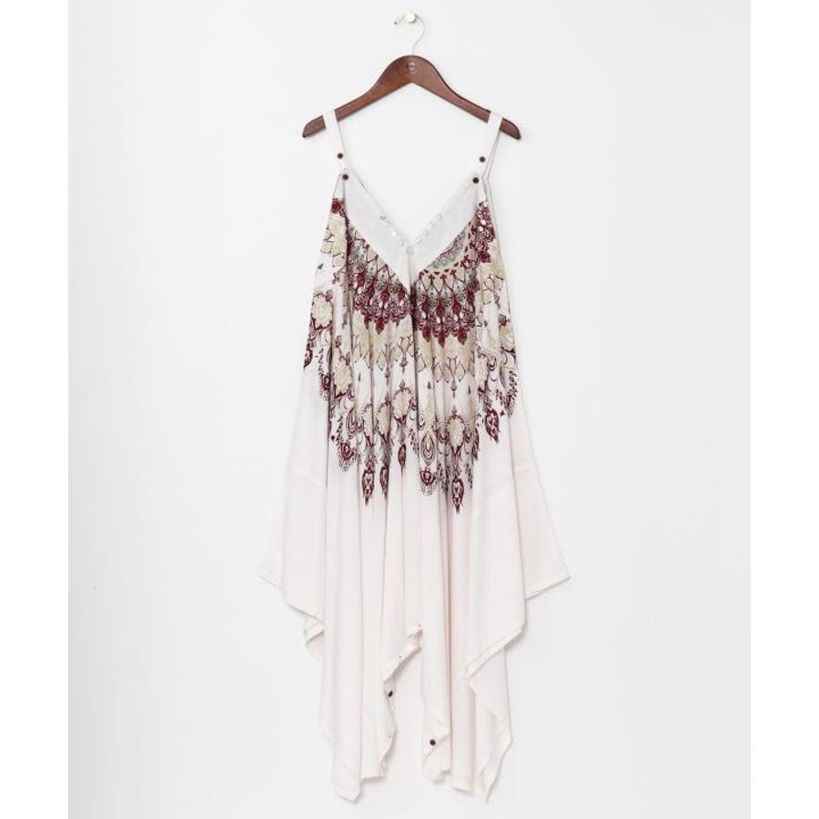 マンダラ柄の2WAYワンピース。裾のボタンでサロペットにも変化。リゾート気分を盛り上げるレーヨン素材の軽やかな着心地。