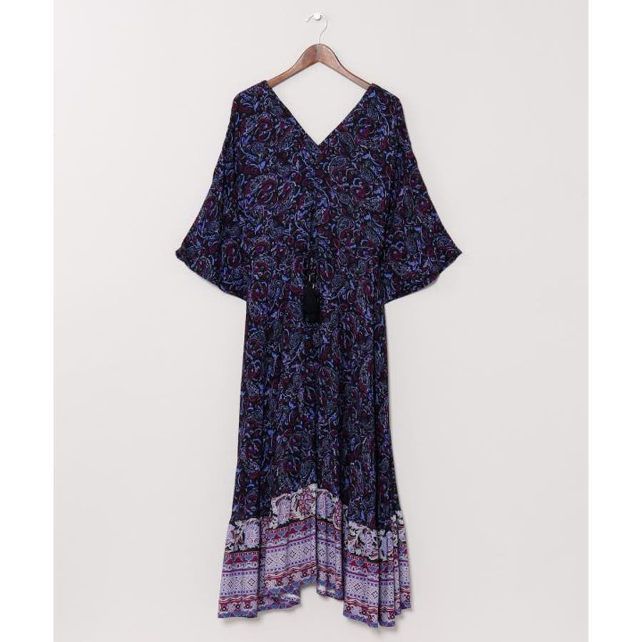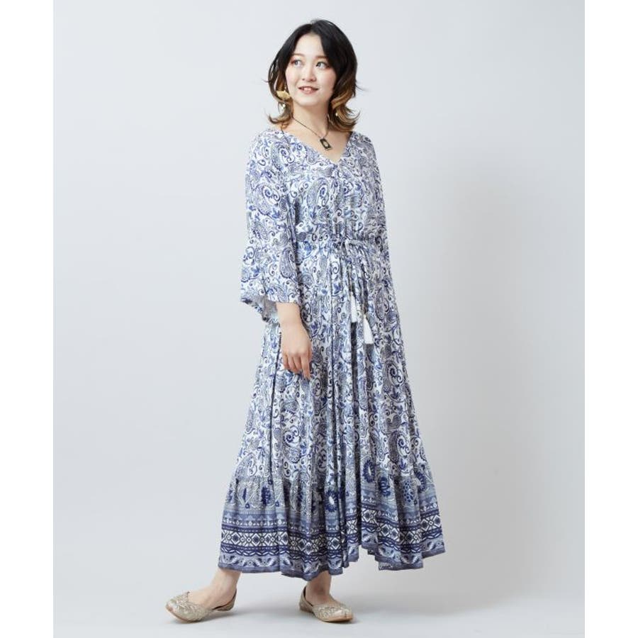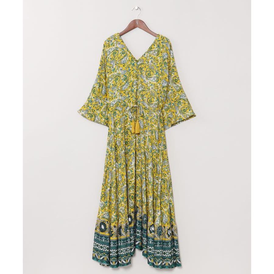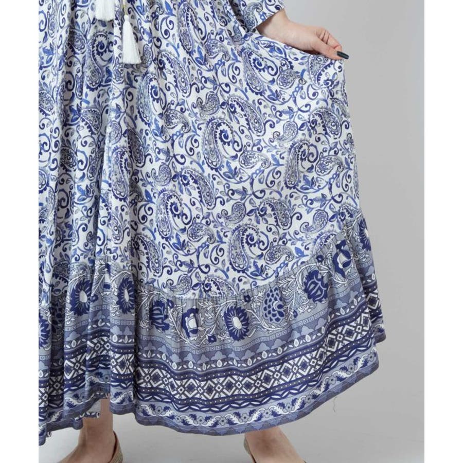 ゆったりと広がるフレアシルエットが美しいワンピース。繊細なペイズリー柄が全体に施され、裾にもエスニック感溢れる模様がプリントされています。ウエストの紐とタッセルがアクセントになり、シルエットを変えることで着こなしの幅も広がります。軽やかな素材感で普段使いはもちろん、旅やおでかけにもおすすめです。