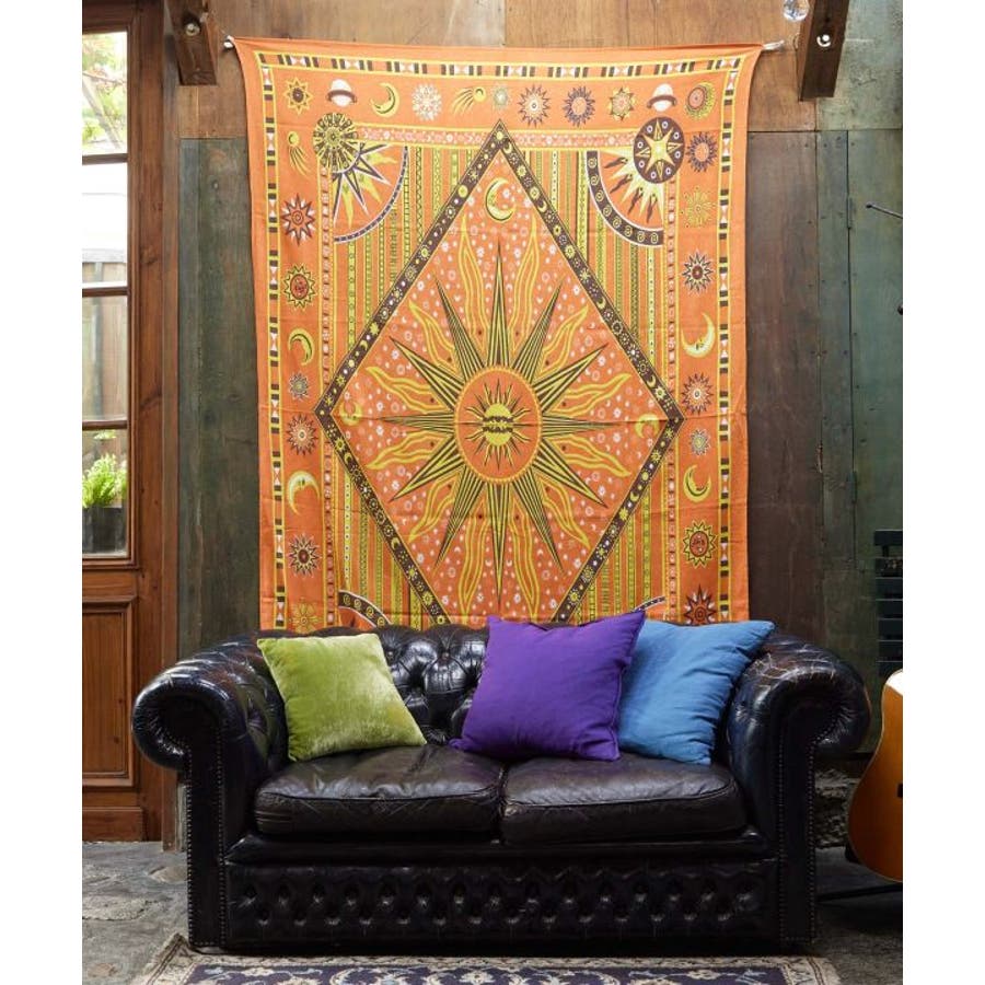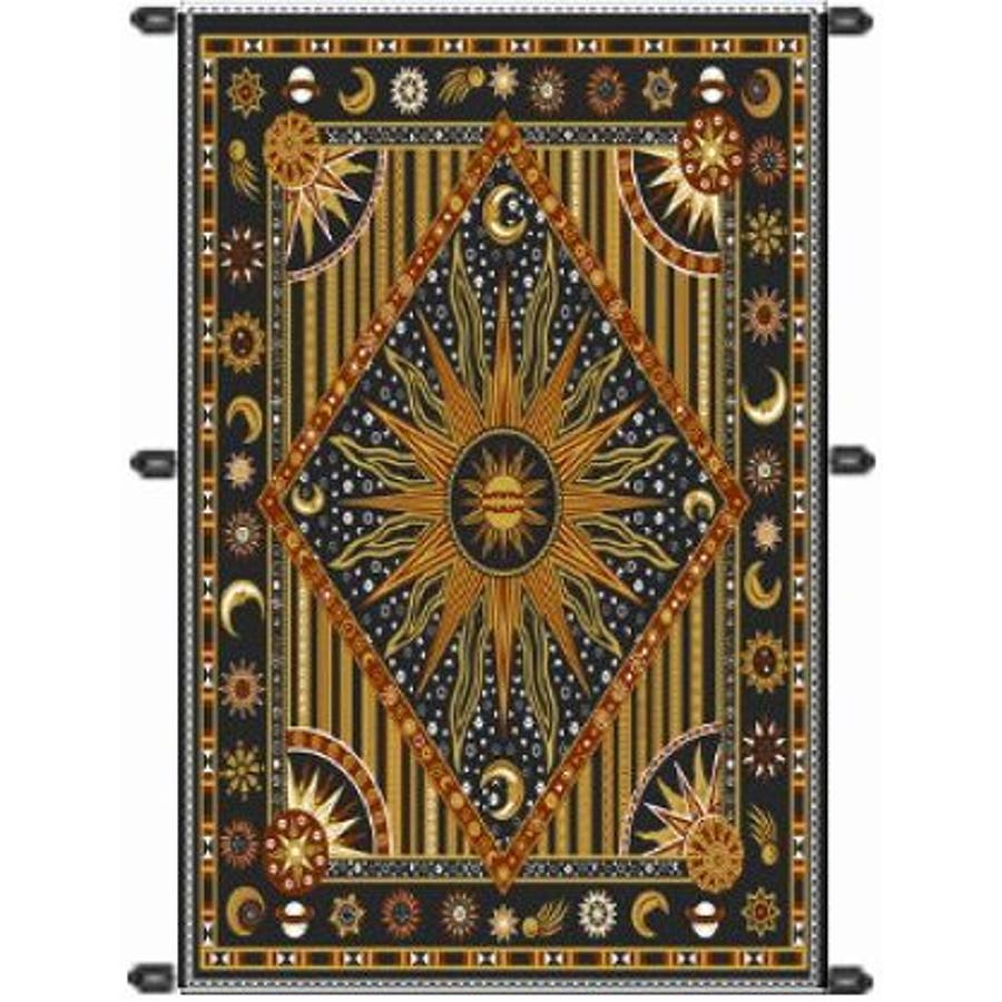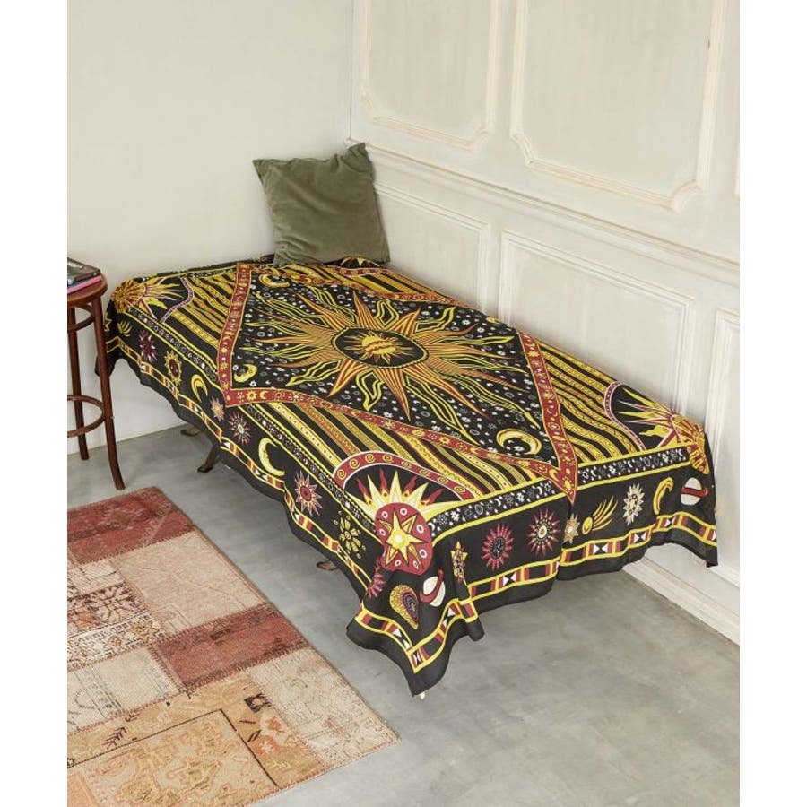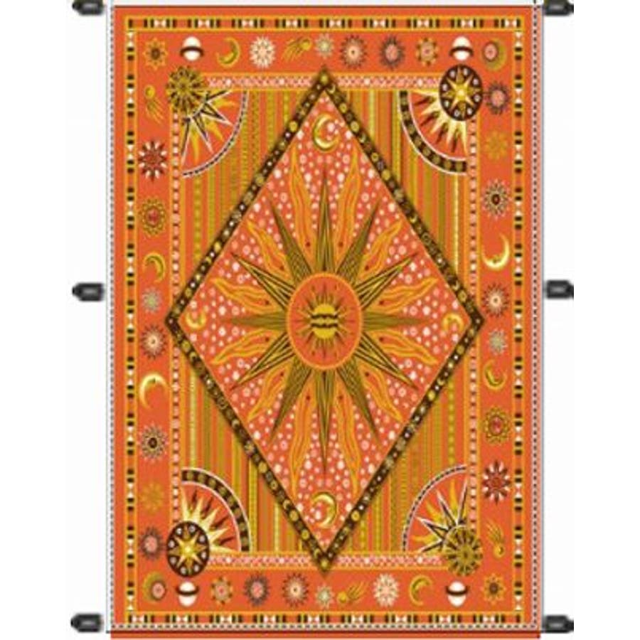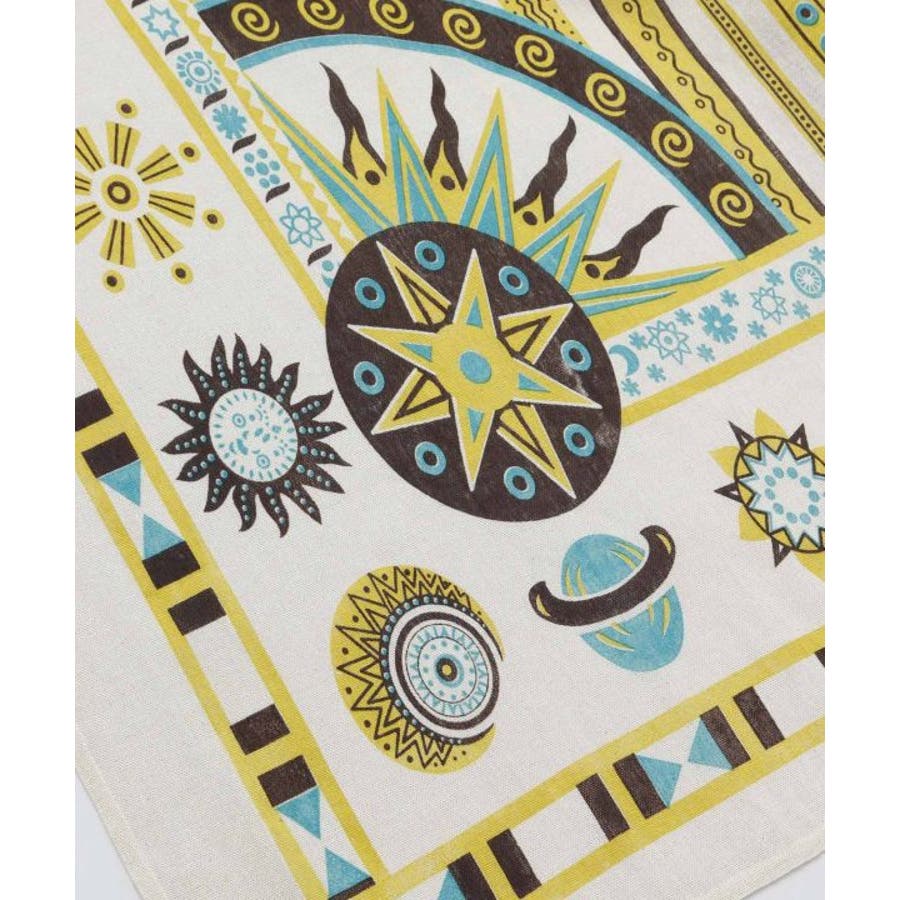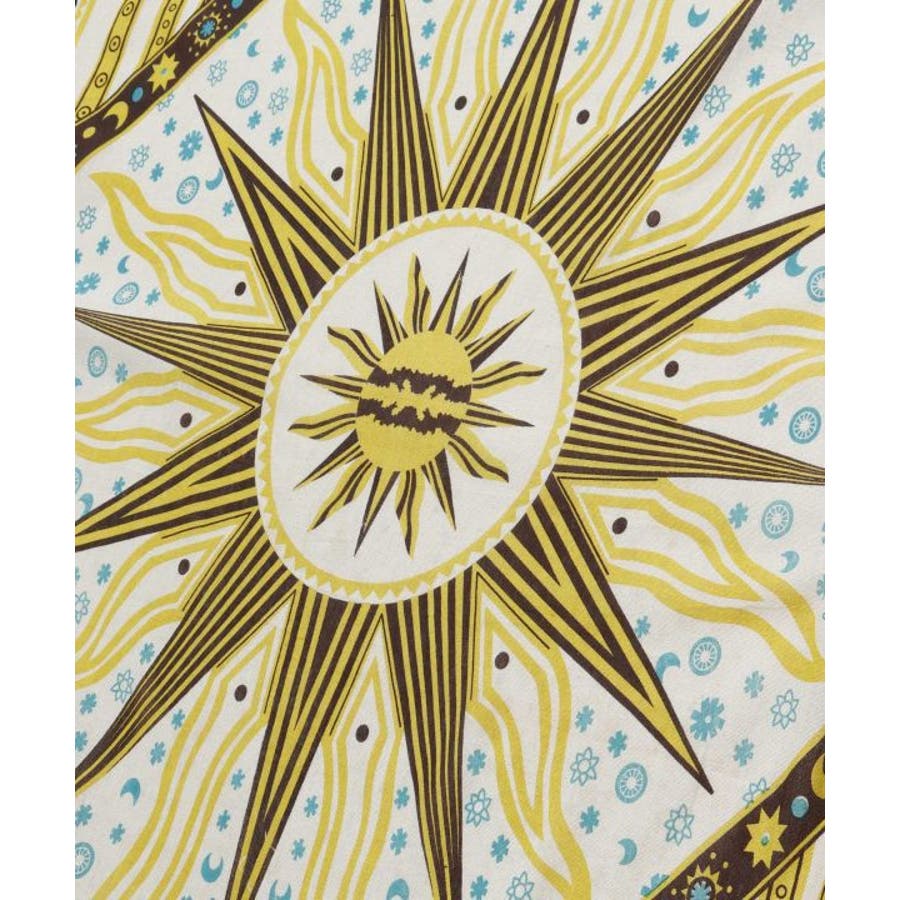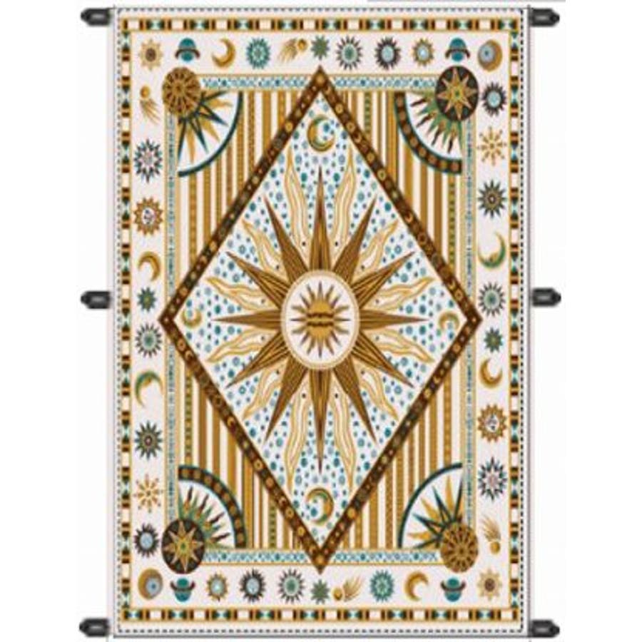 様々な月と太陽がふんだんにでデザインされたマルチクロス。どこかヴィンテージ感のある色合いが魅力。ベッドやソファにはもちろん、お部屋の目隠しやキャンプシーンにもおすすめ。6箇所のループ付きで、タープクロスとして大活躍。