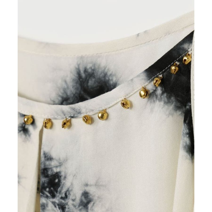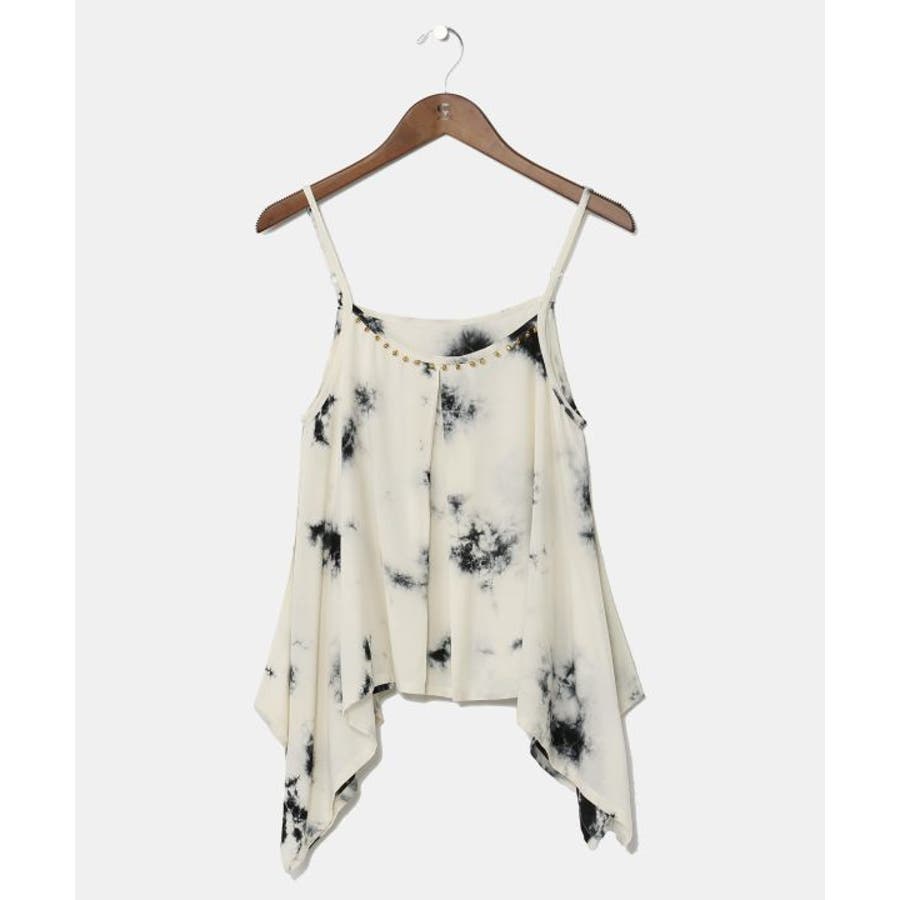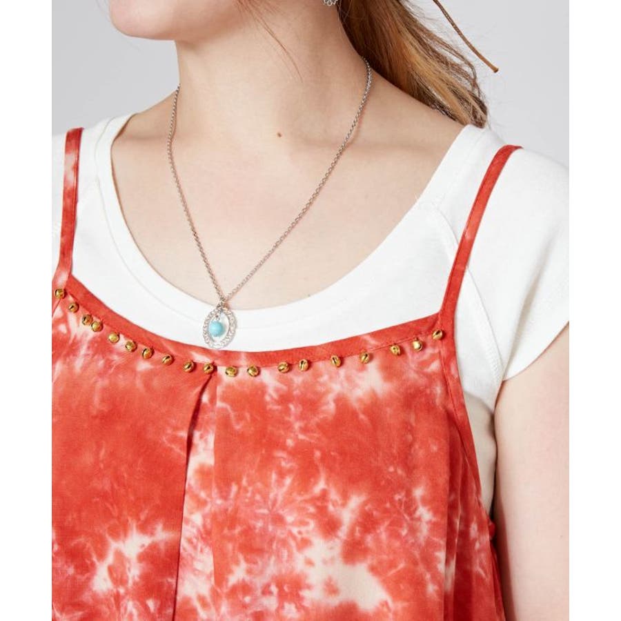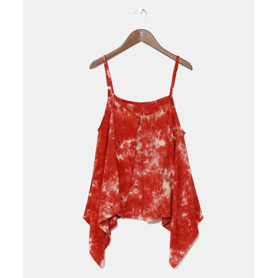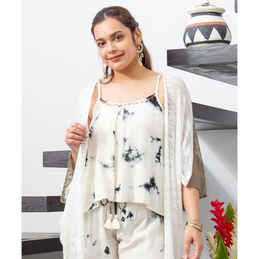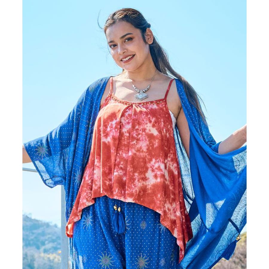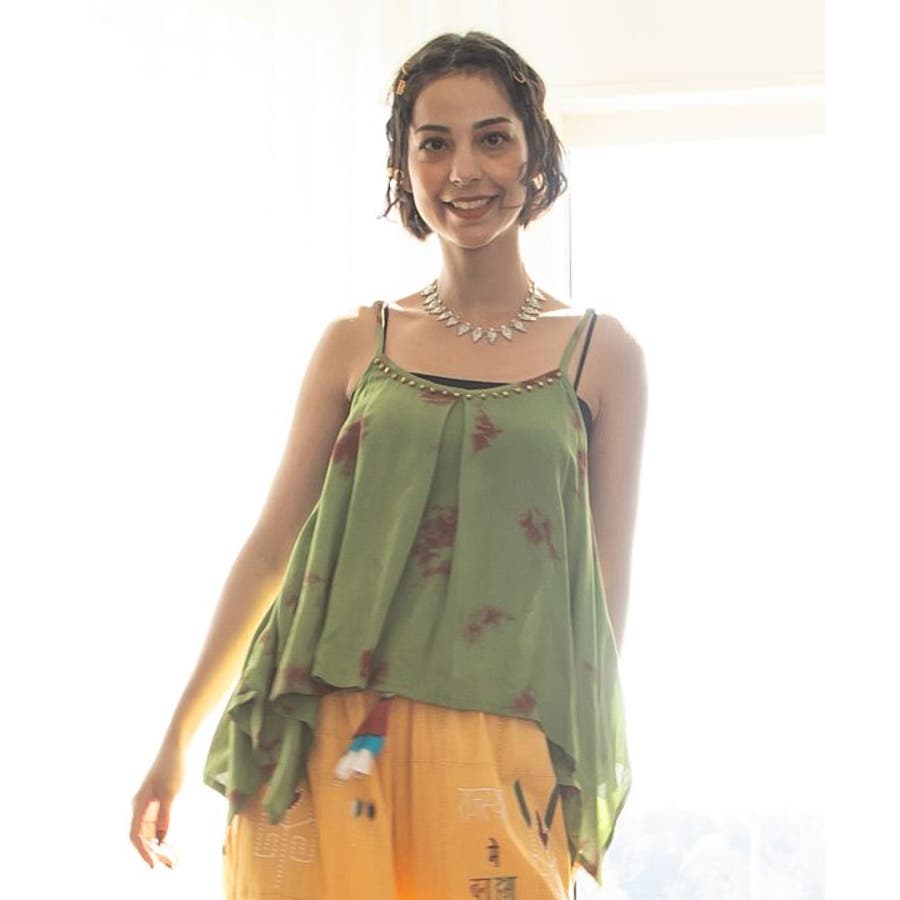 インドのタイダイ柄が映えるキャミソール。肩紐は調節可能で、胸元にはインド舞踊「カタックダンス」で足につける鈴「グングル」がアクセントとしてあしらわれている。個性的な変形デザインが、動きにあわせて揺れるシルエットを楽しませてくれる。
