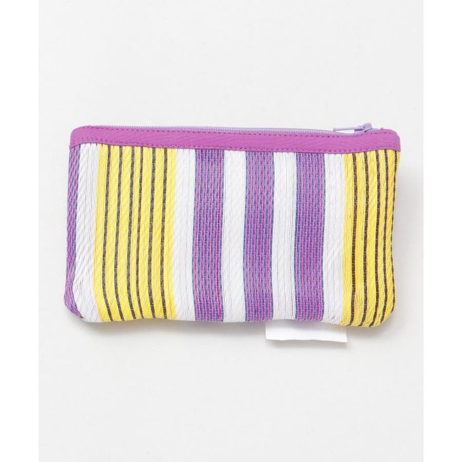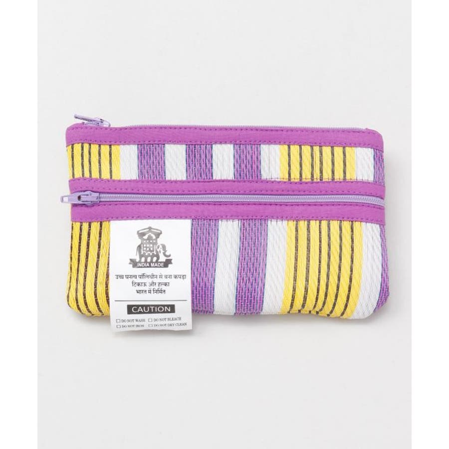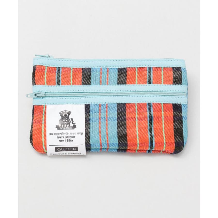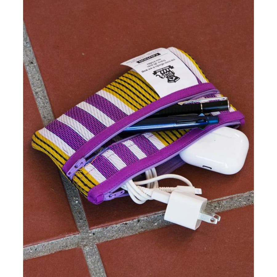 カラフルなストライプ生地が目を惹く。張りのある生地感に丈夫で超軽量。内側と外側にファスナーがありペンケースとしても使用する事が可能。