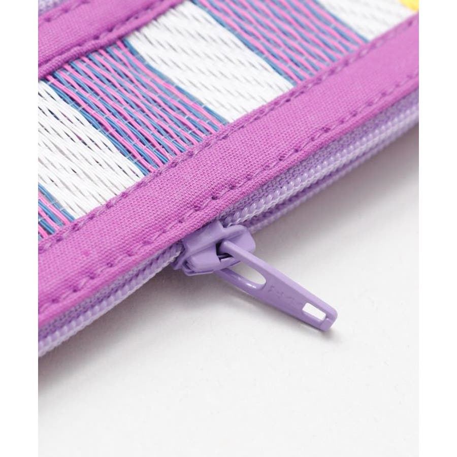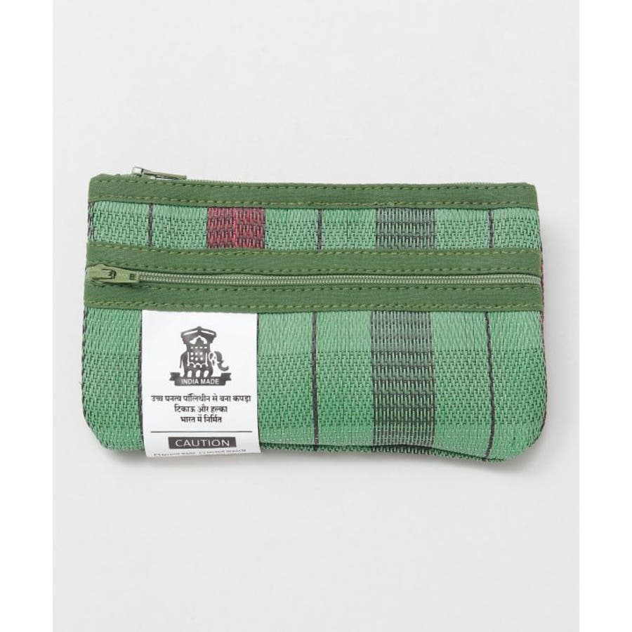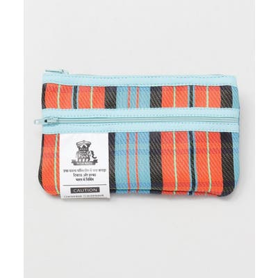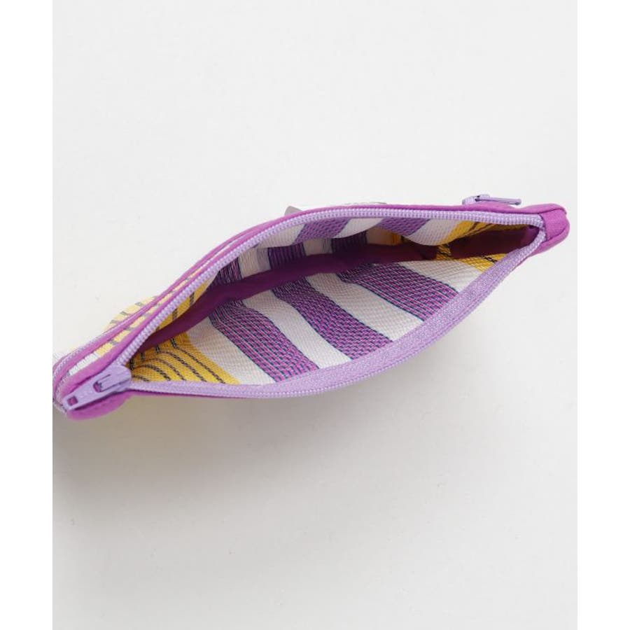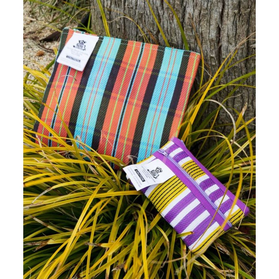 カラフルなストライプ生地が目を惹く。張りのある生地感に丈夫で超軽量。内側と外側にファスナーがありペンケースとしても使用する事が可能。