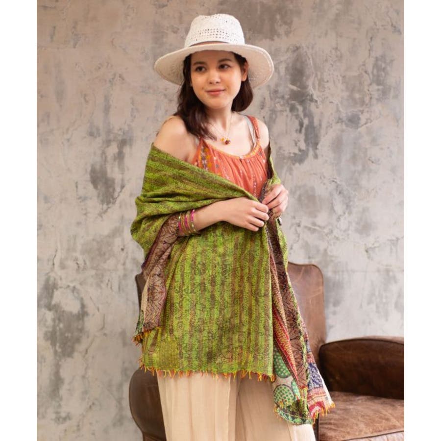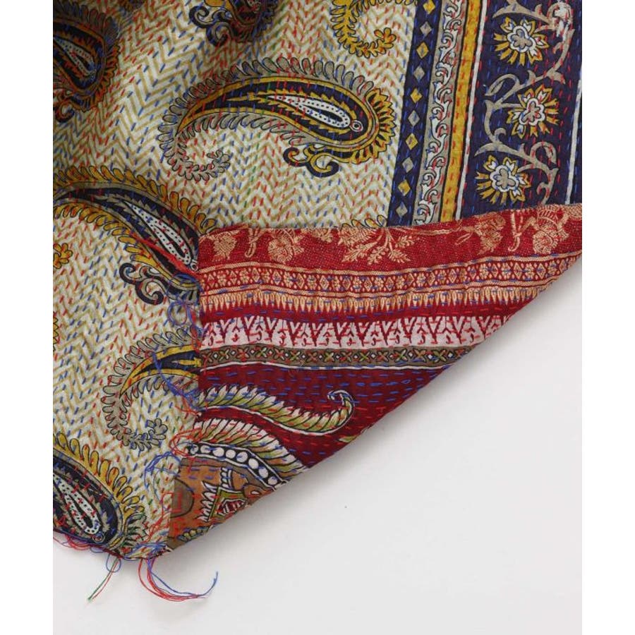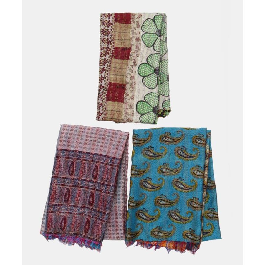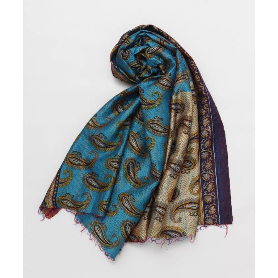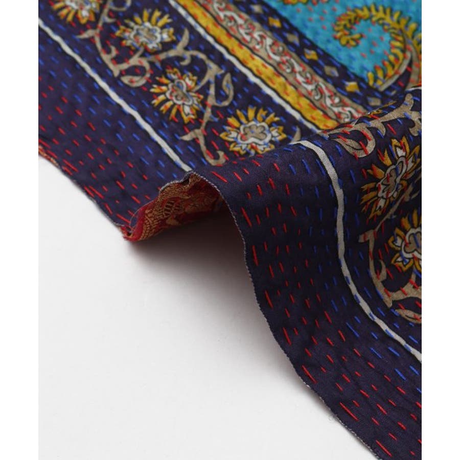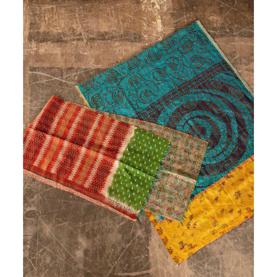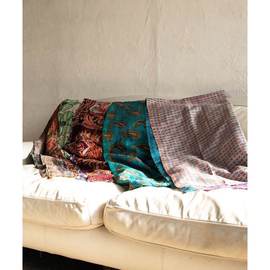 インドの民族衣装サリーに使われるシルクをリサイクルし、数枚の布を継ぎ合せ手刺しゅうして組み合わせ完成される魅力的な大判ストール。自分のお気に入りと出会えるのも楽しみの一つ。