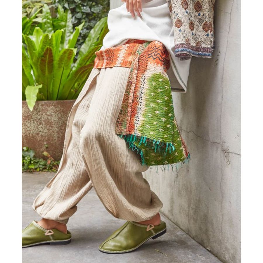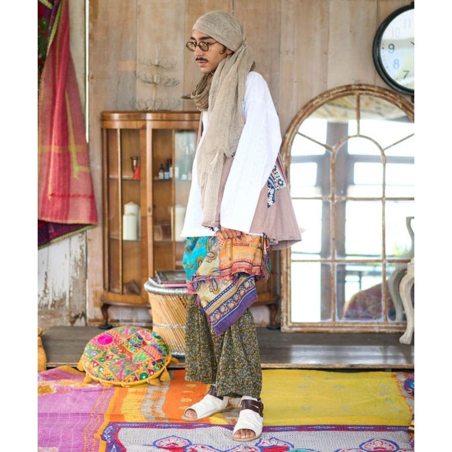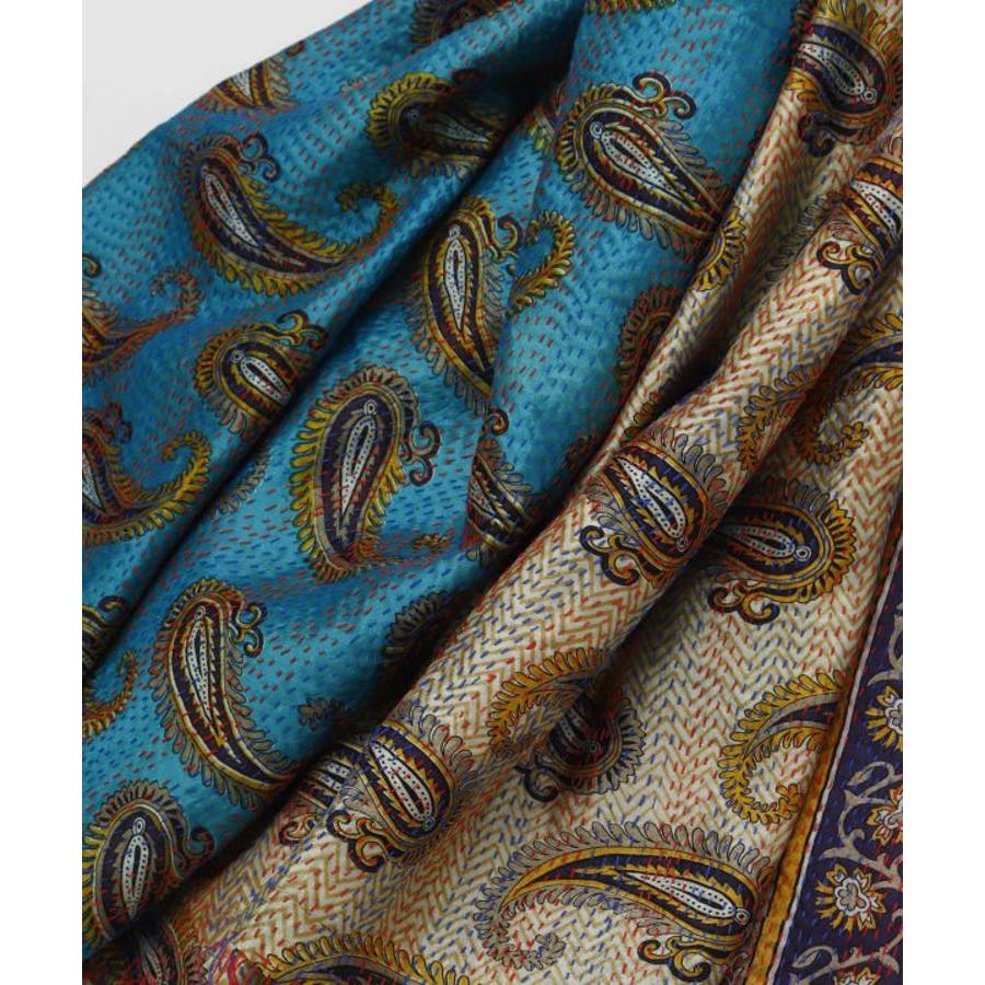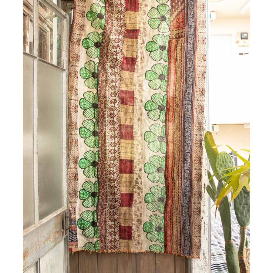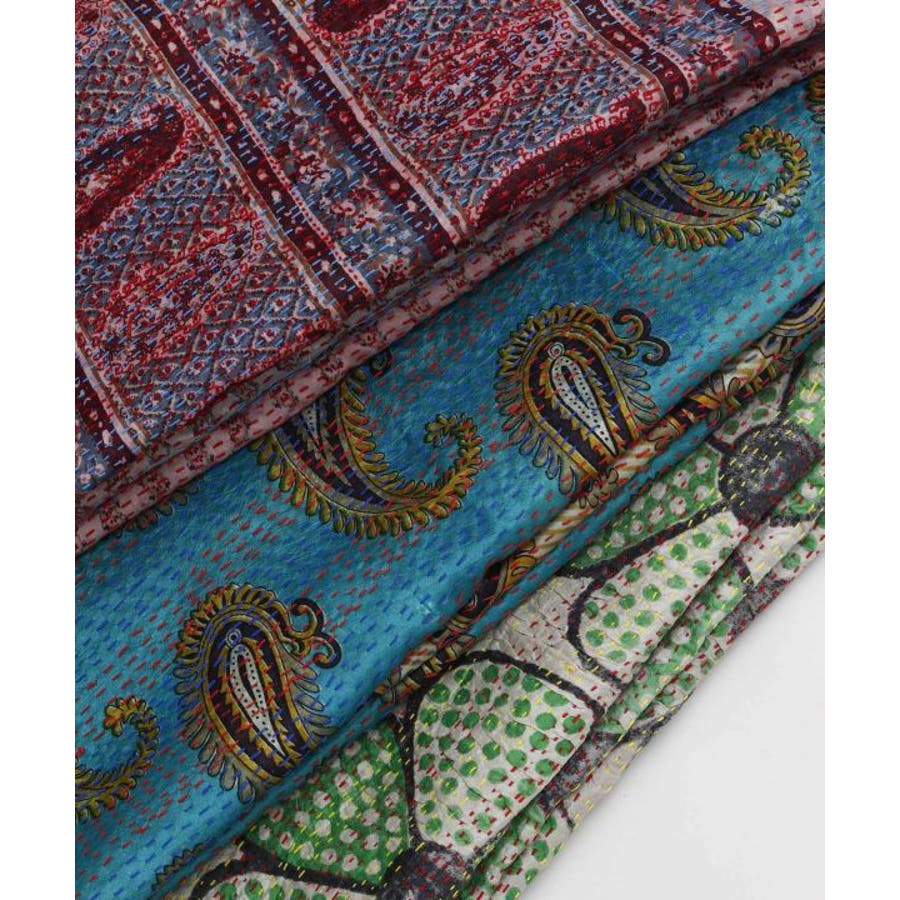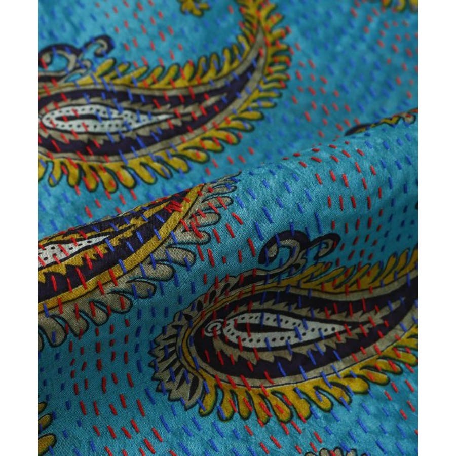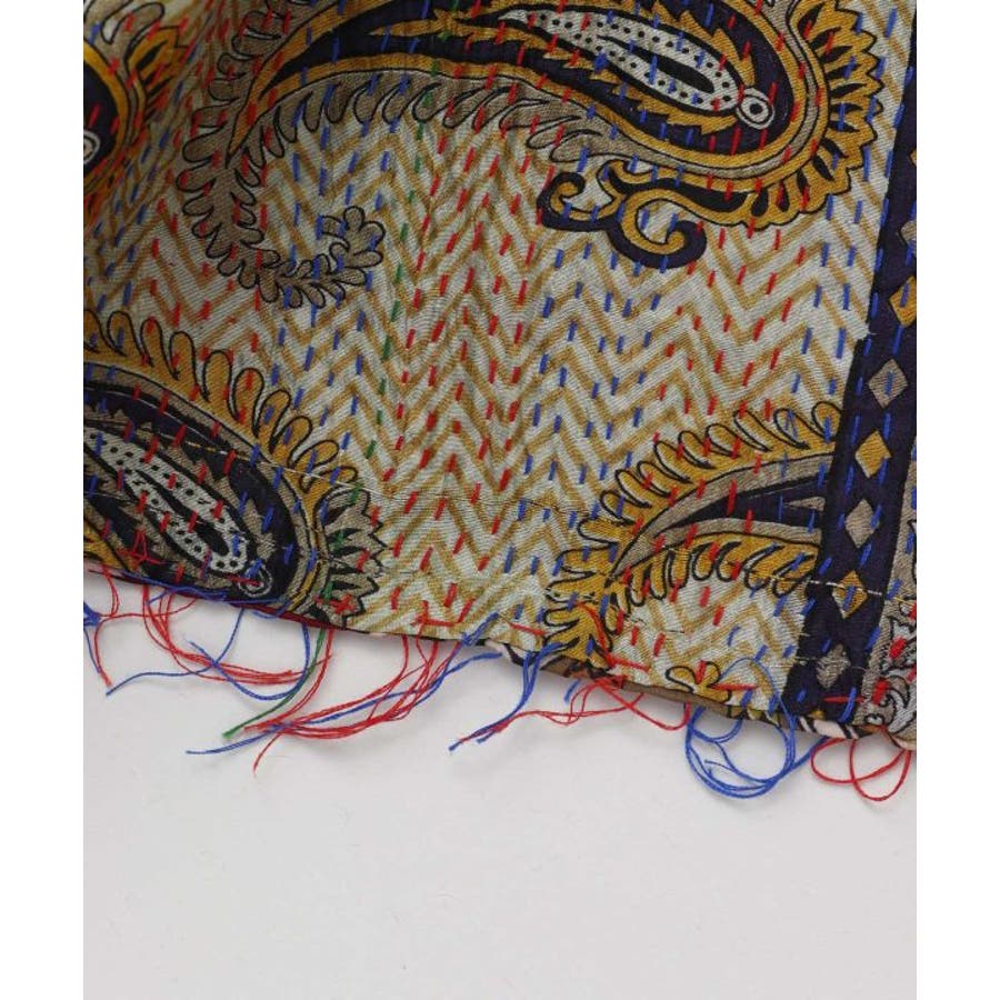 インドの民族衣装サリーに使われるシルクをリサイクルし、数枚の布を継ぎ合せ手刺しゅうして組み合わせ完成される魅力的な大判ストール。自分のお気に入りと出会えるのも楽しみの一つ。