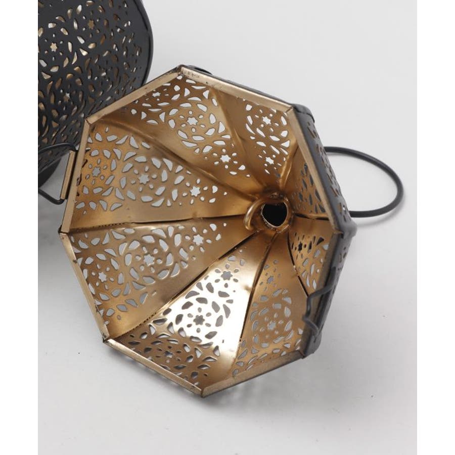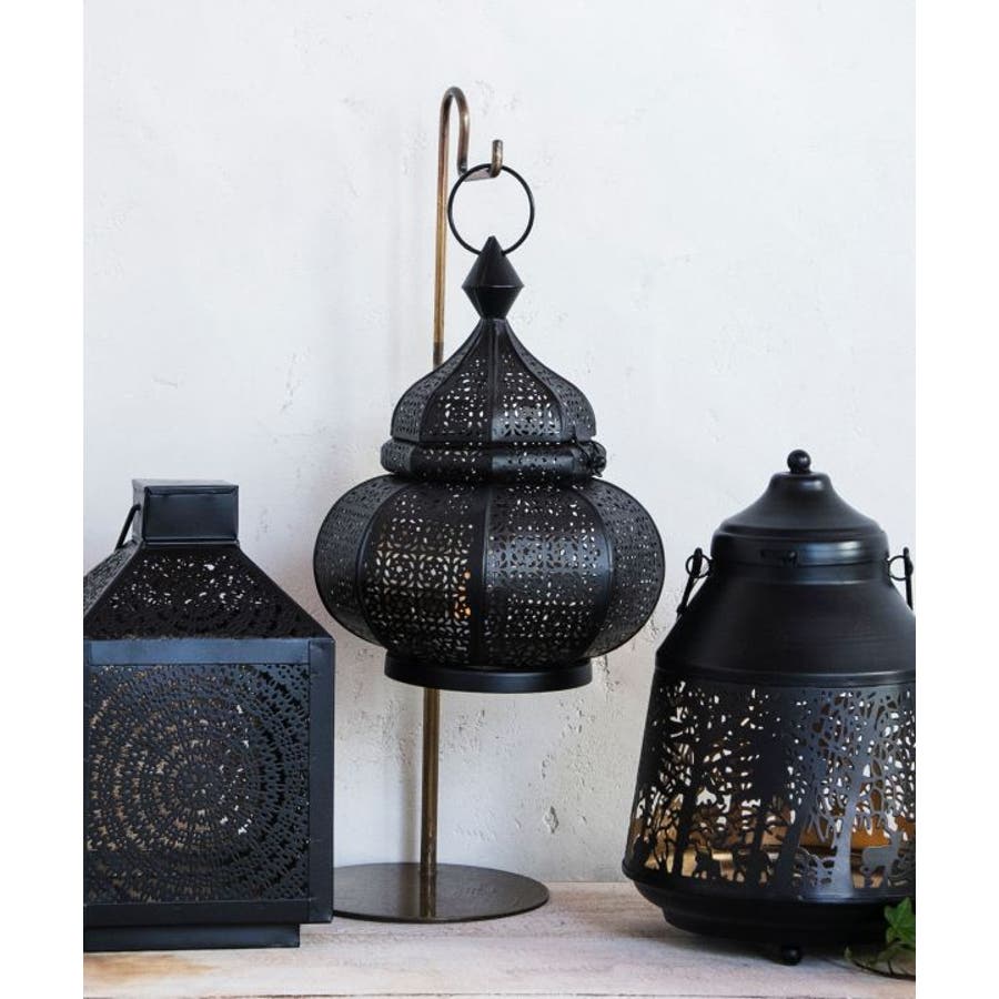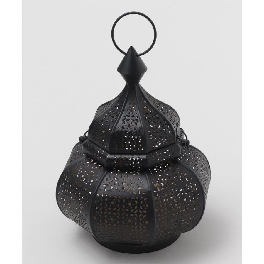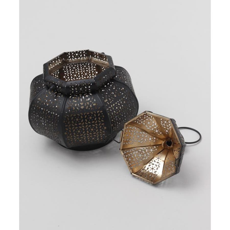 アイアンの細かい透かしデザインのオニオン型ランタンケース。外側はシックなブラック、内側は金色で光をよく反射します。LEDランタン用のフックが内側についています。