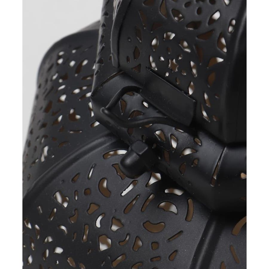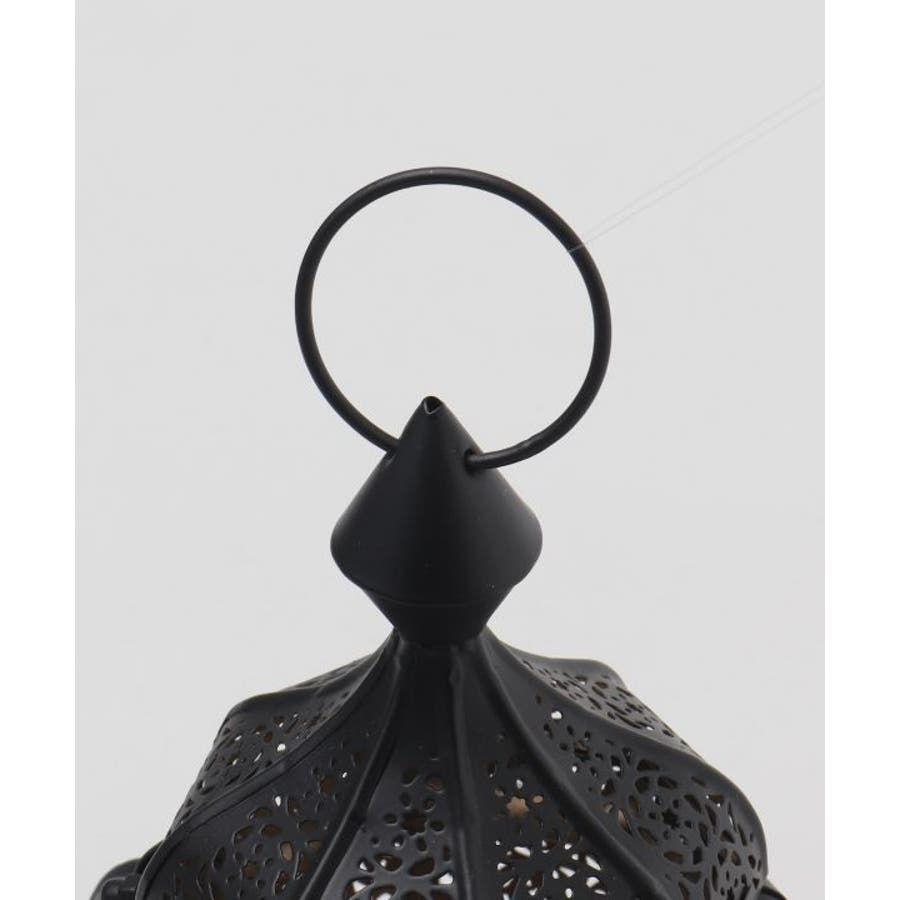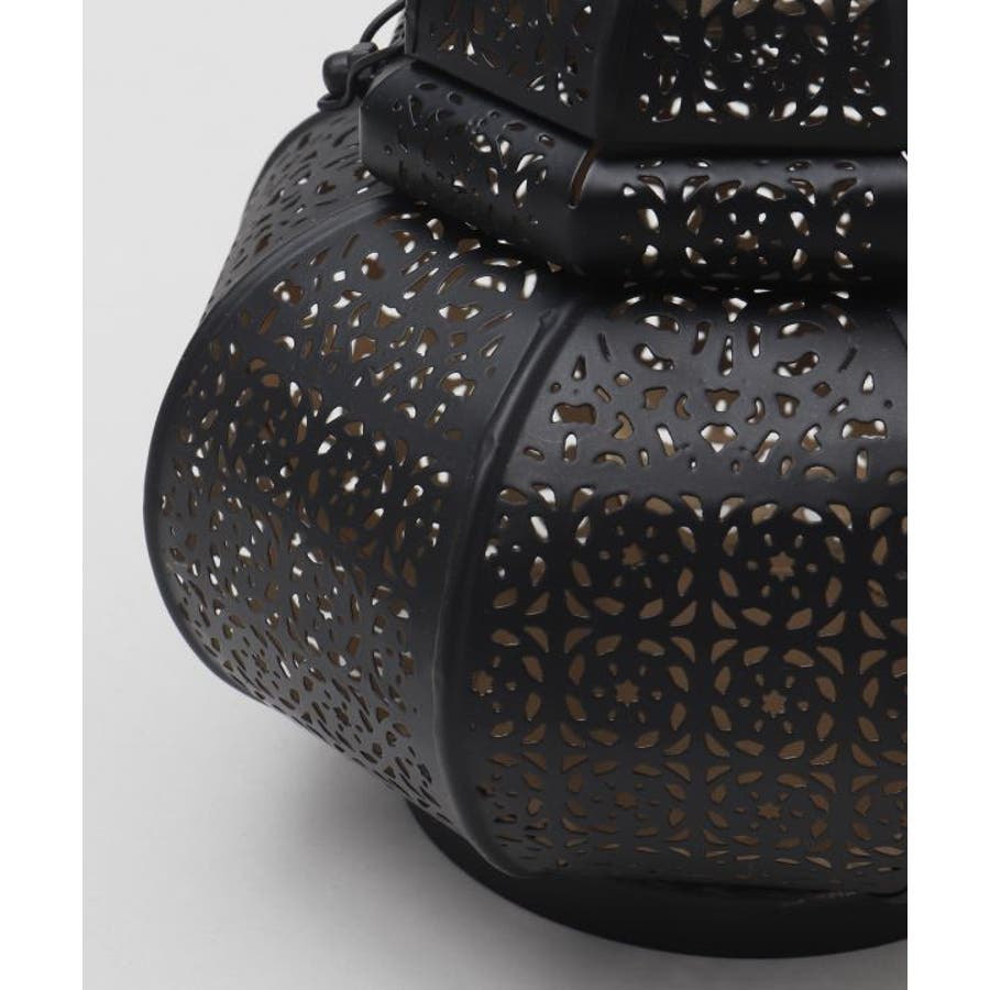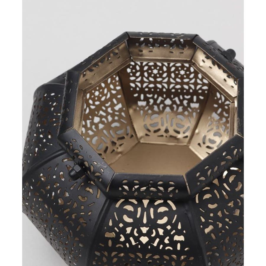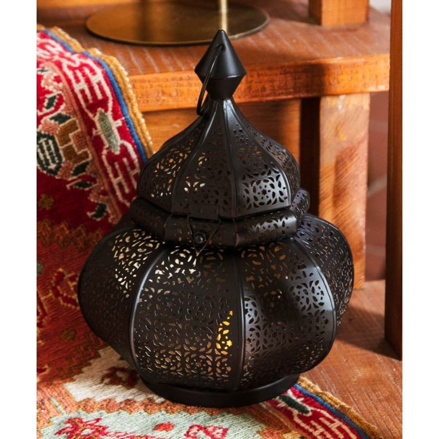 アイアンの細かい透かしデザインのオニオン型ランタンケース。外側はシックなブラック、内側は金色で光をよく反射します。LEDランタン用のフックが内側についています。