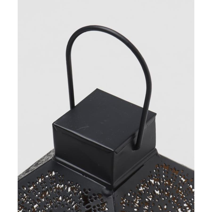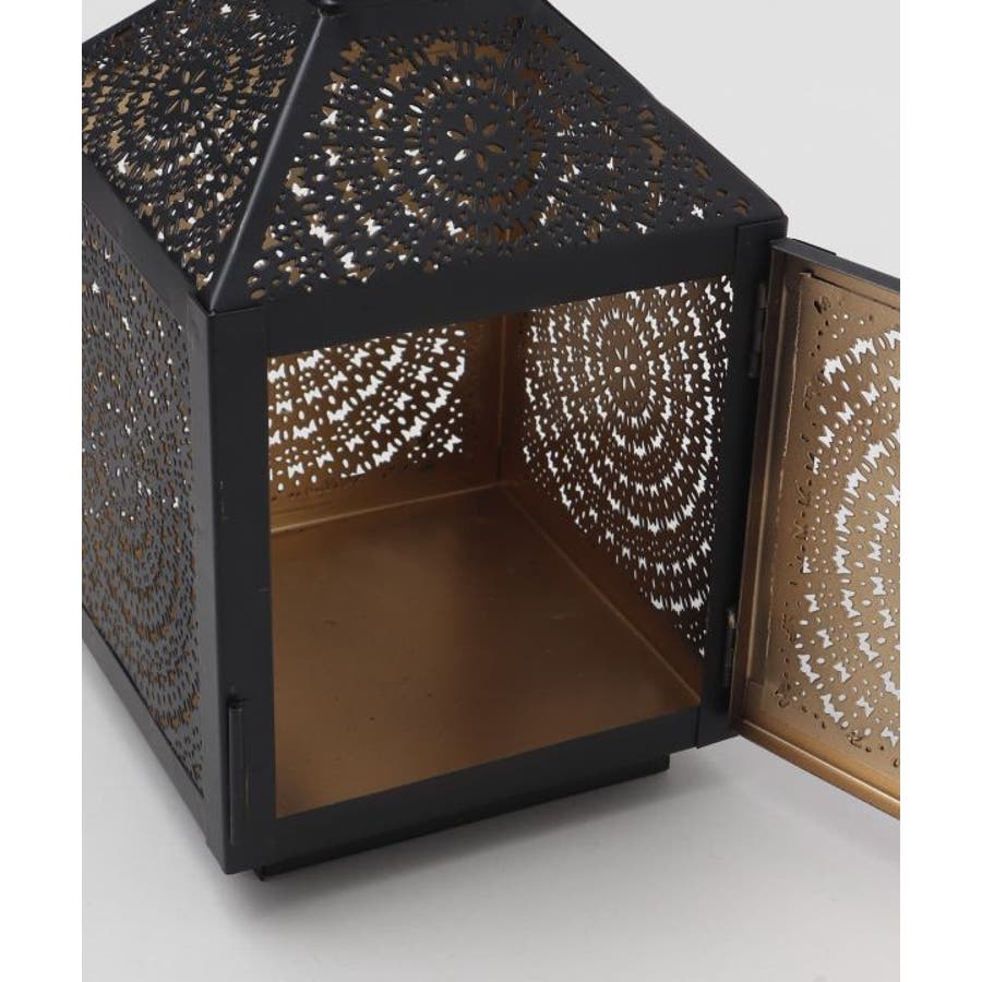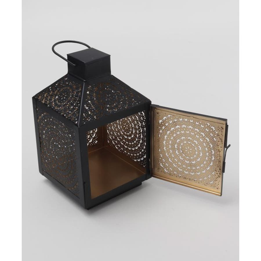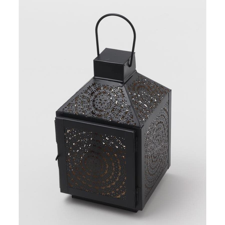 アイアンの細かい透かしデザインのスクエア型ランタンケース。外側はシックなブラック、内側は金色で光をよく反射します。LEDランタン用のフックが内側についています。
