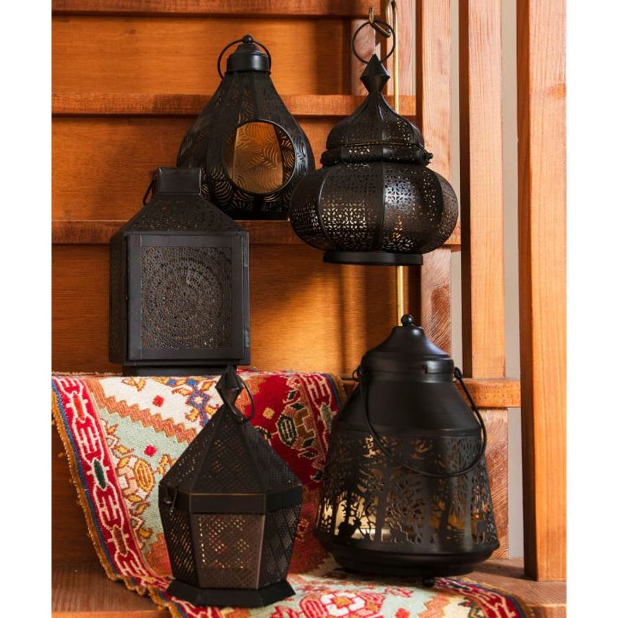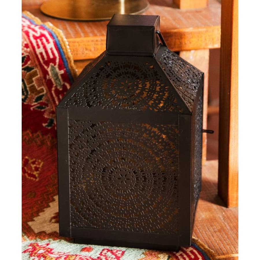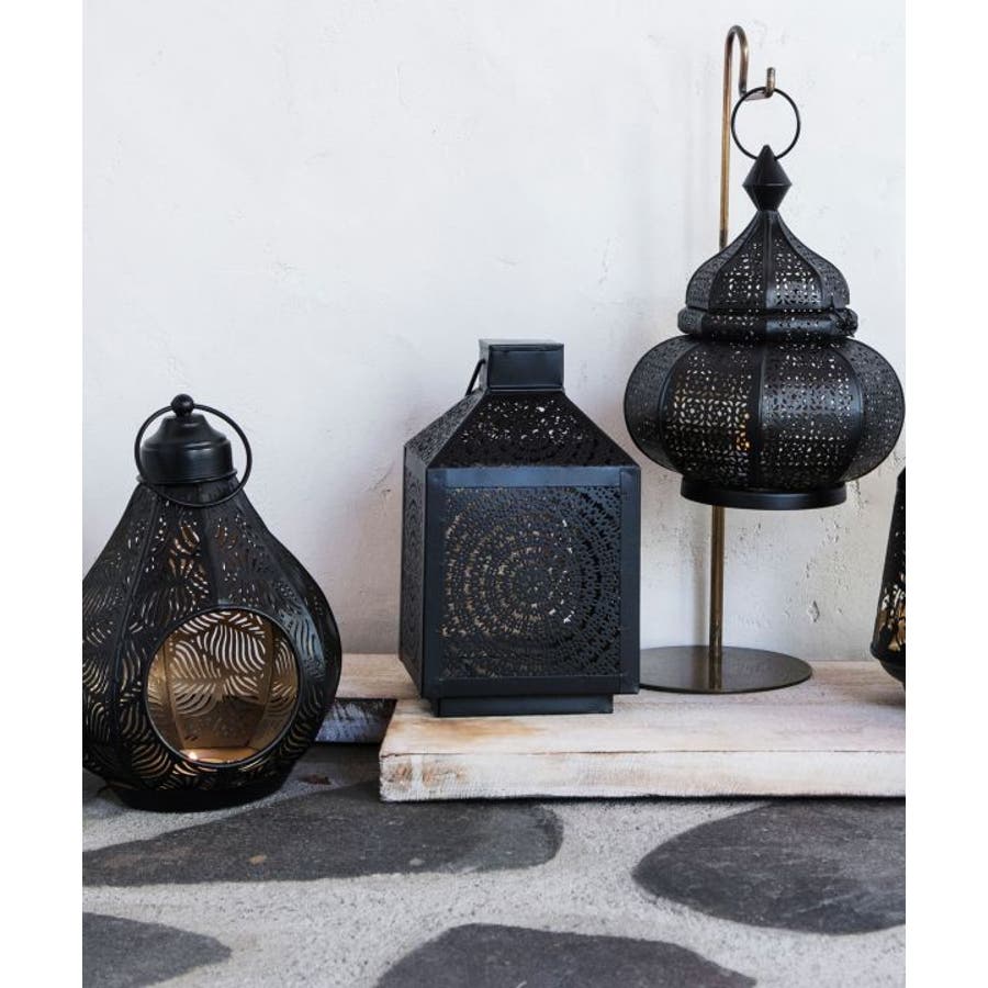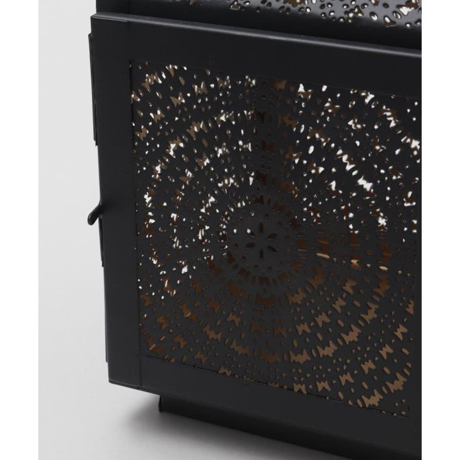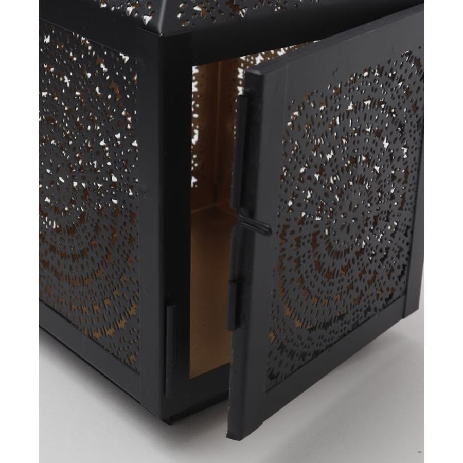 アイアンの細かい透かしデザインのスクエア型ランタンケース。外側はシックなブラック、内側は金色で光をよく反射します。LEDランタン用のフックが内側についています。
