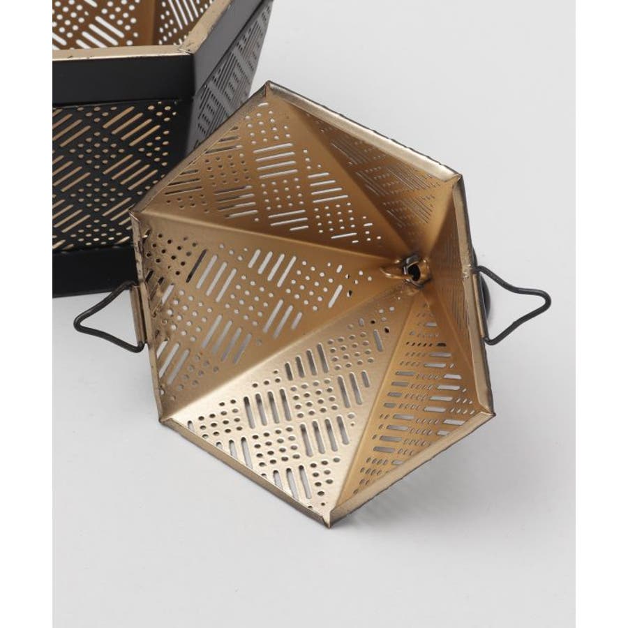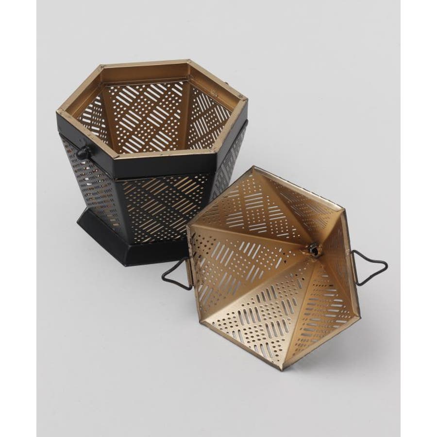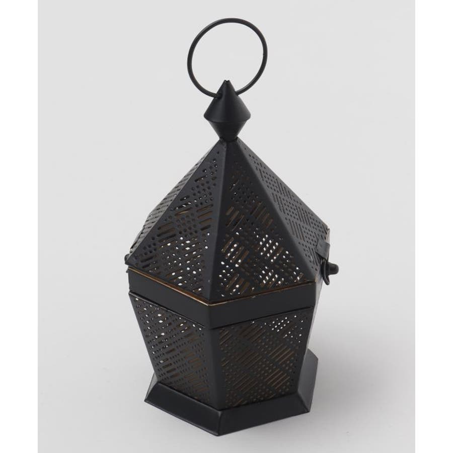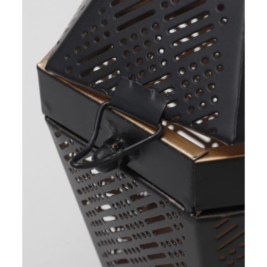 アイアンの細かい透かしデザインの六角形型ランタンケース。外側はシックなブラック、内側は金色で光をよく反射します。LEDランタン用のフックが内側についています。