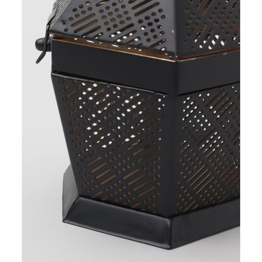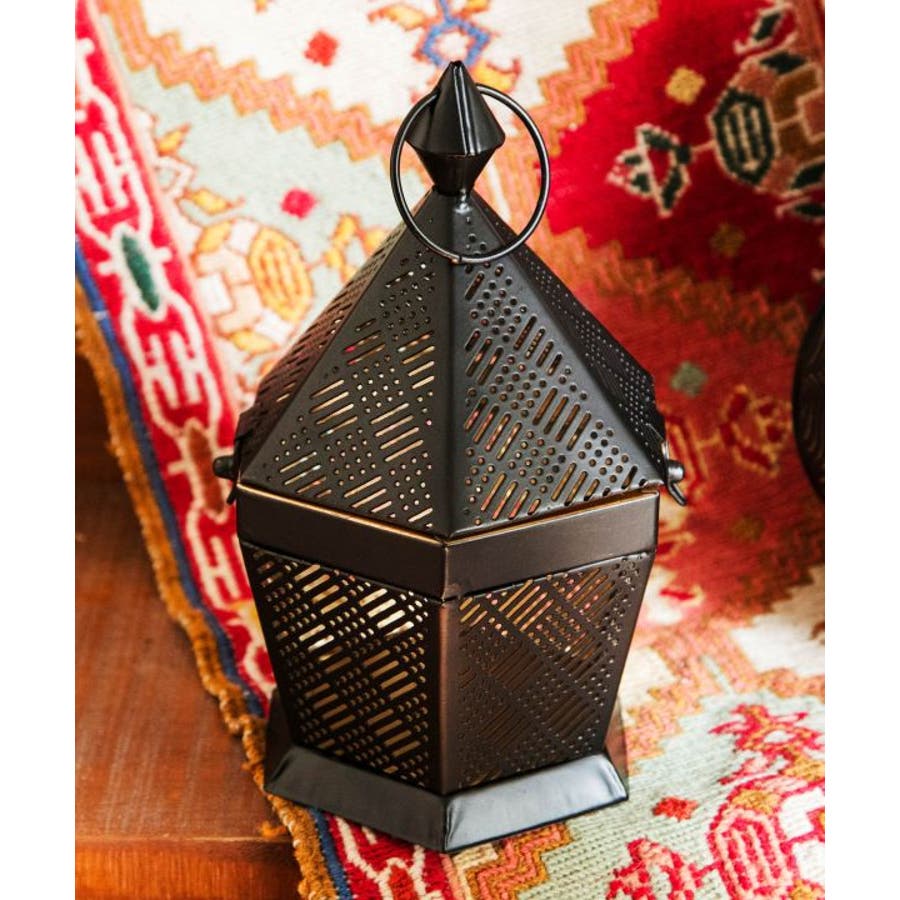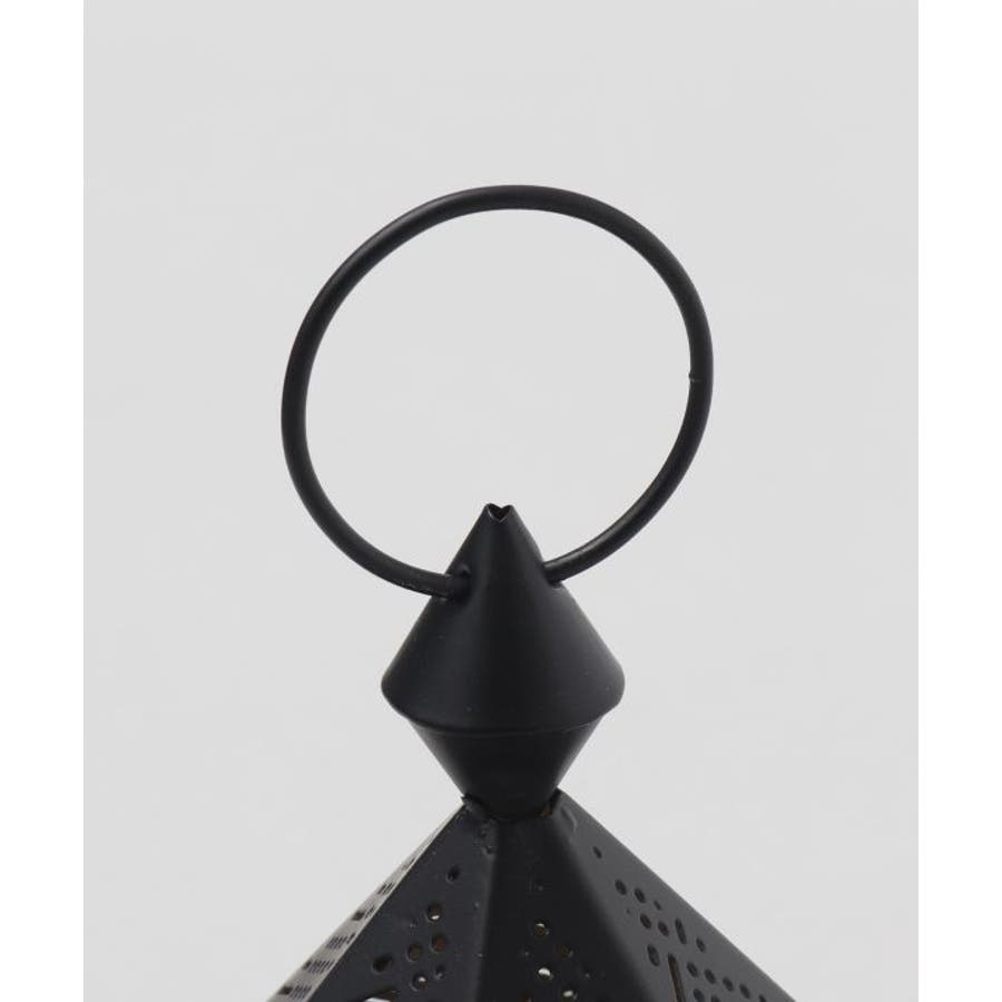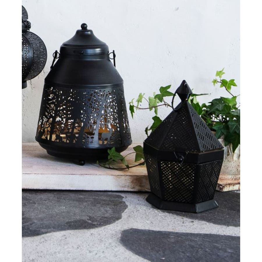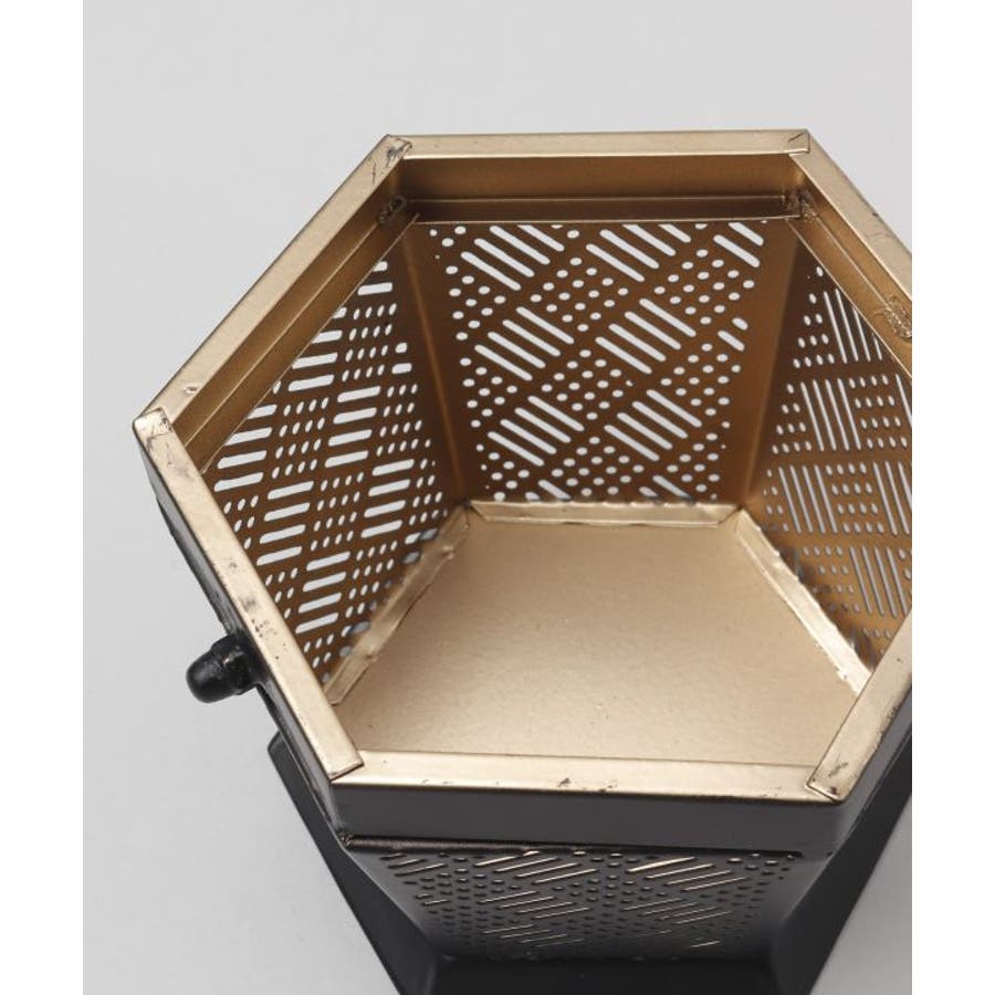 アイアンの細かい透かしデザインの六角形型ランタンケース。外側はシックなブラック、内側は金色で光をよく反射します。LEDランタン用のフックが内側についています。