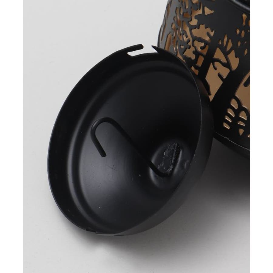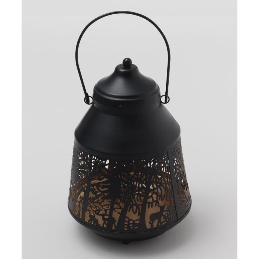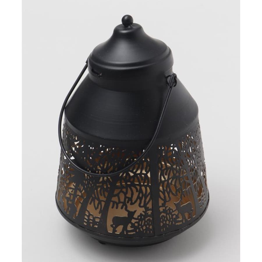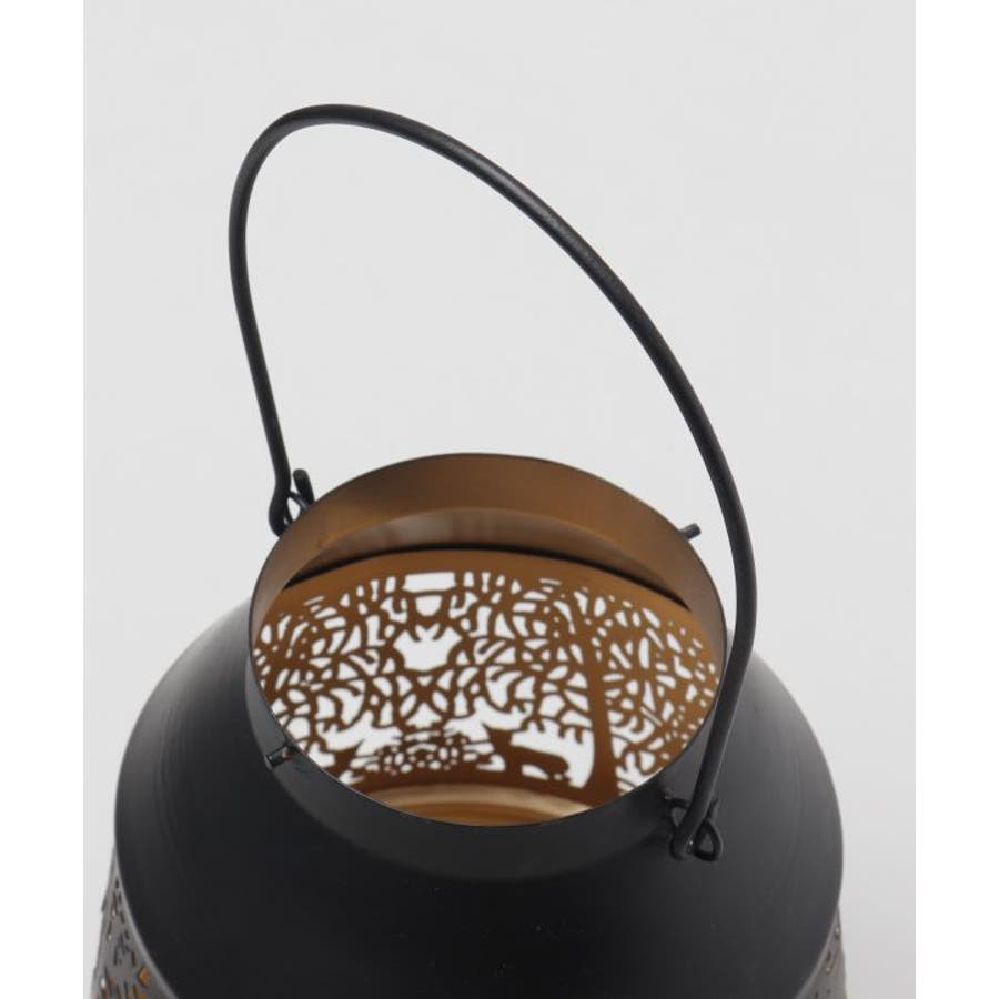 アイアンの細かい透かしデザインのランタンケース。森の景色が表現されていて、灯りの持つ力が感じられます。外側はシックなブラック、内側は金色で光をよく反射。LEDランタン用のフックが内側についています。