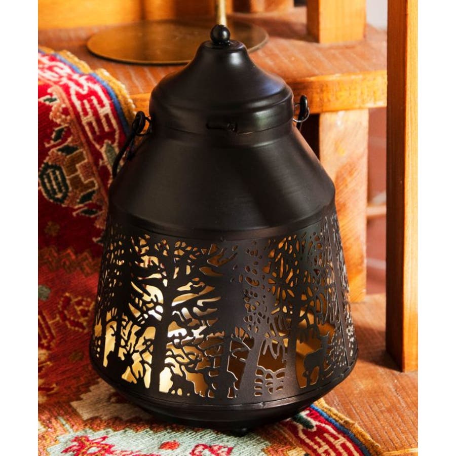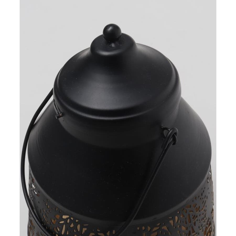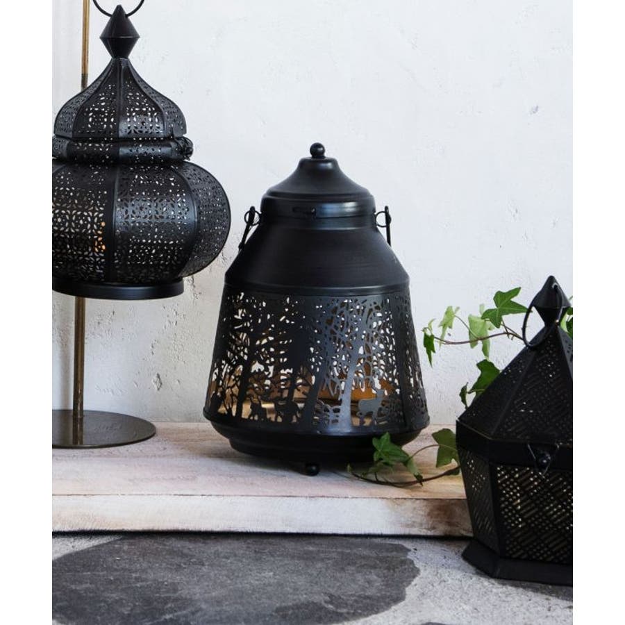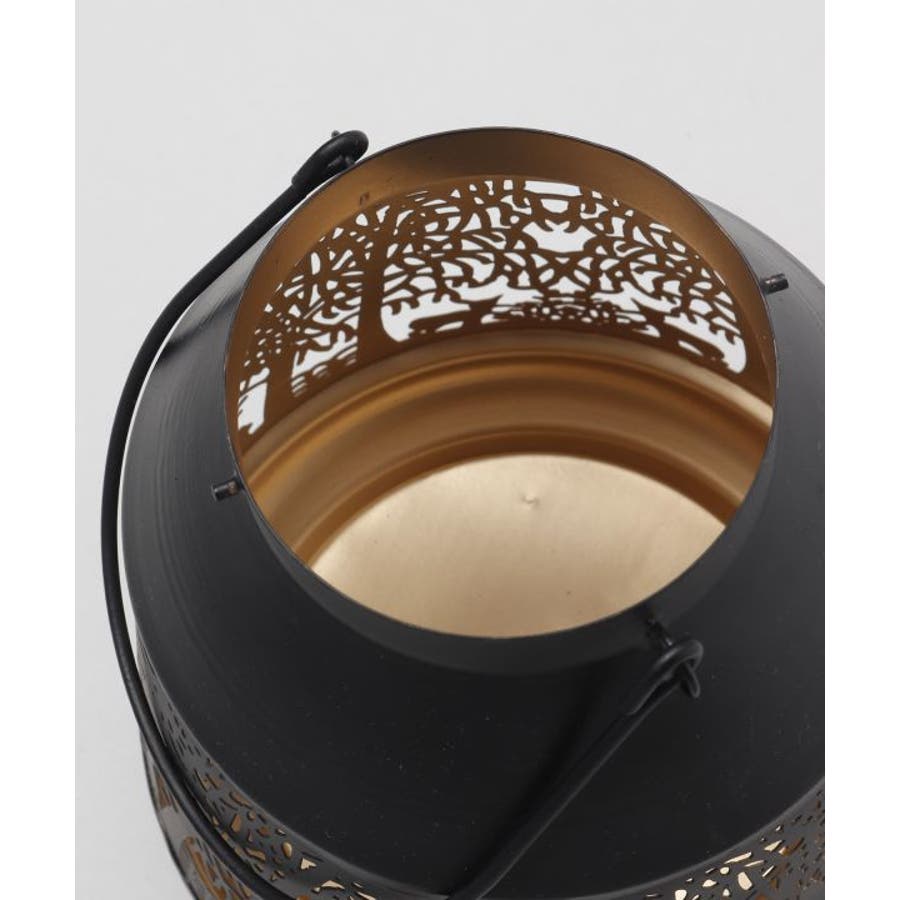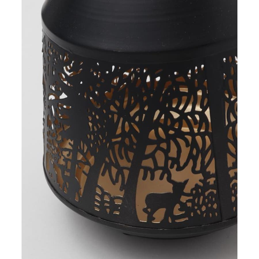 アイアンの細かい透かしデザインのランタンケース。森の景色が表現されていて、灯りの持つ力が感じられます。外側はシックなブラック、内側は金色で光をよく反射。LEDランタン用のフックが内側についています。