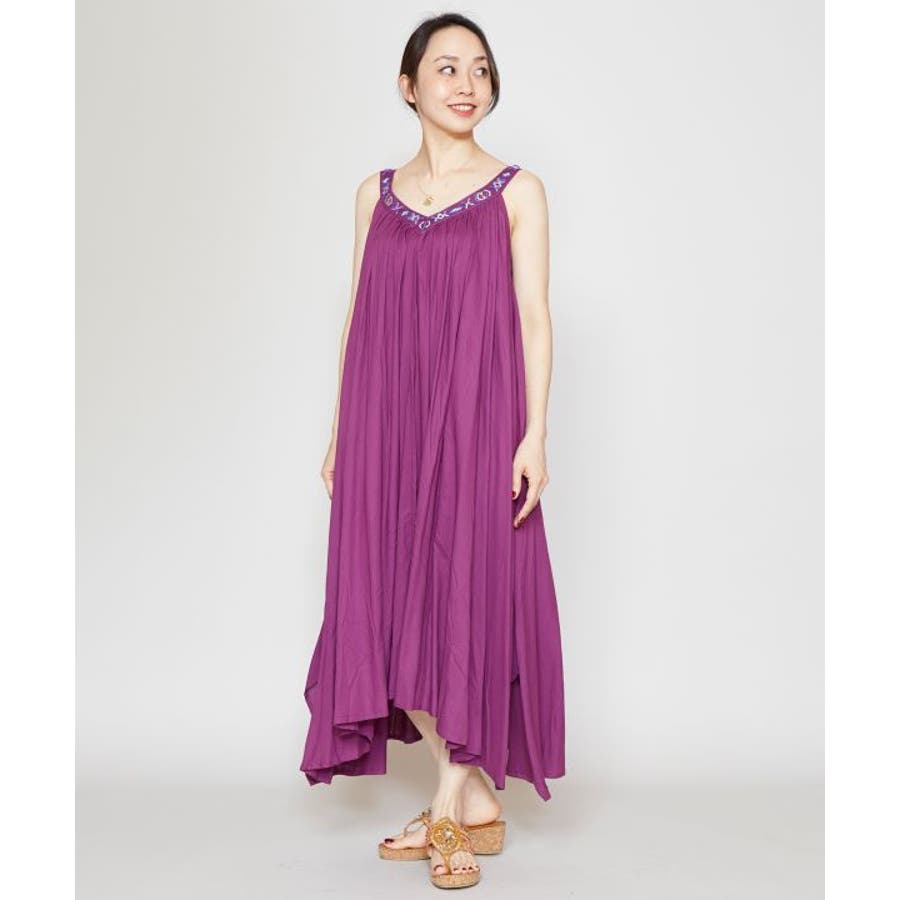夏にぴったりなキャミワンピース。エスニックテイストな襟ぐりの幾何学模様と繊細なビーズ刺繍がポイント。なめらかで落ち感のあるレーヨン素材をたっぷりと使い、ボリューミーなフレアシルエット。歩くたびにひらりと揺れて女性らしさを引きたてます。鮮やかな夏カラーでリゾート気分に♪