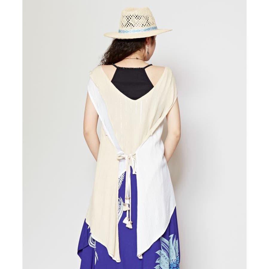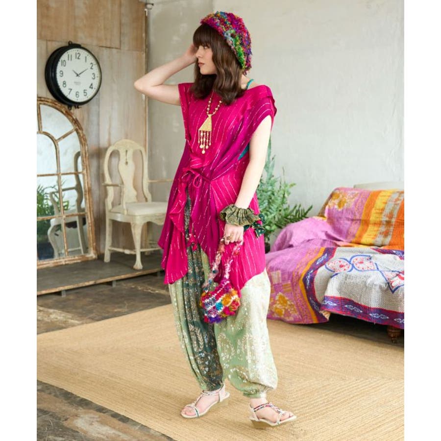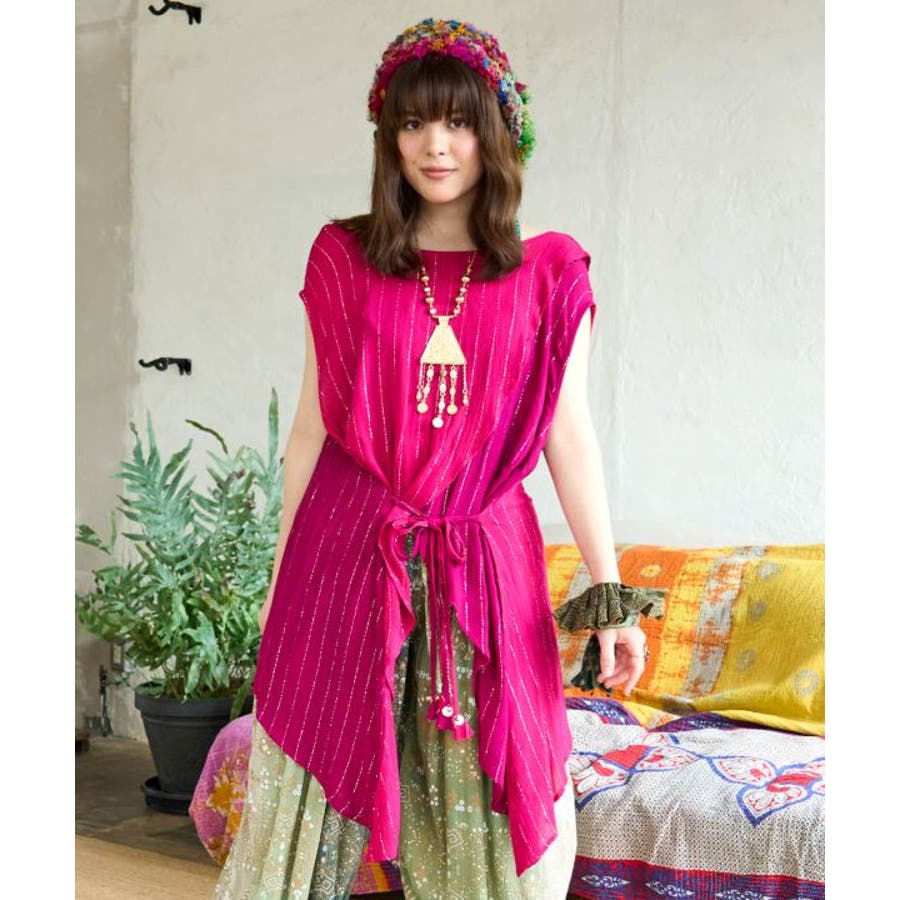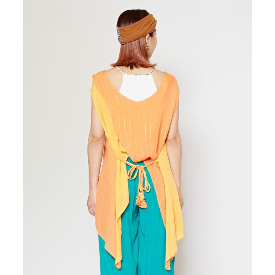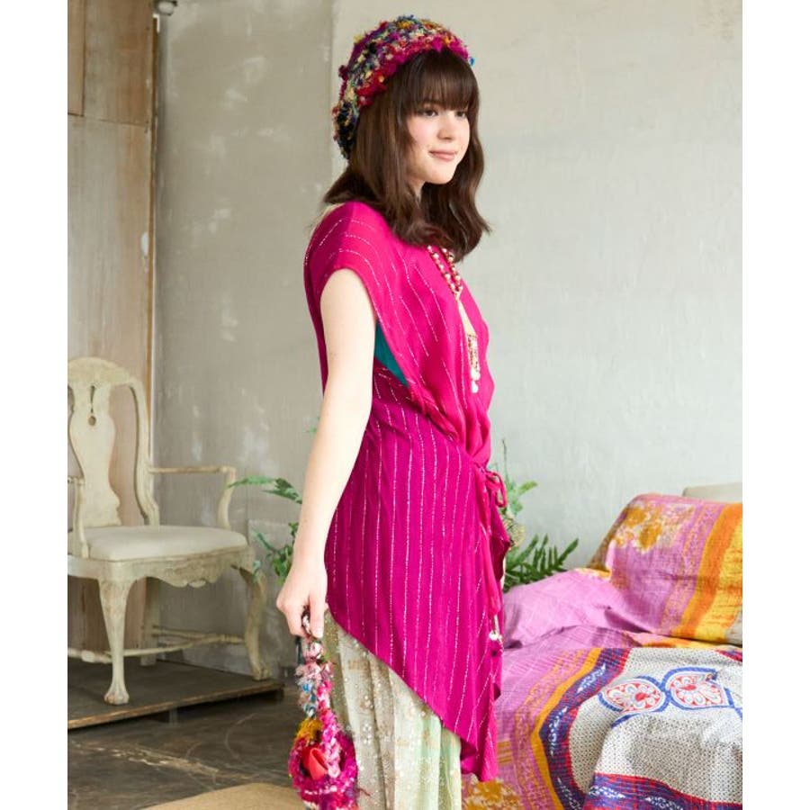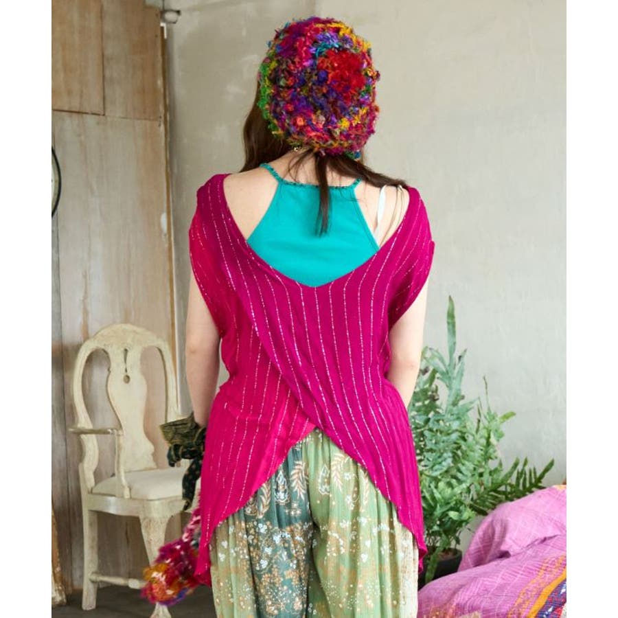 色鮮やかなサリーの色彩から色を組み合わせた前後2WAY仕様のタンクトップ。ウエストの紐を結べばスタイルアップ効果もあり、結ばずに着てもさらりとした揺れ感が楽しめる一枚。