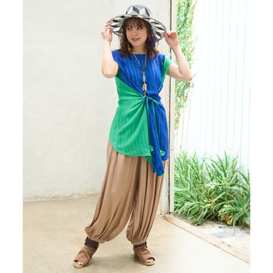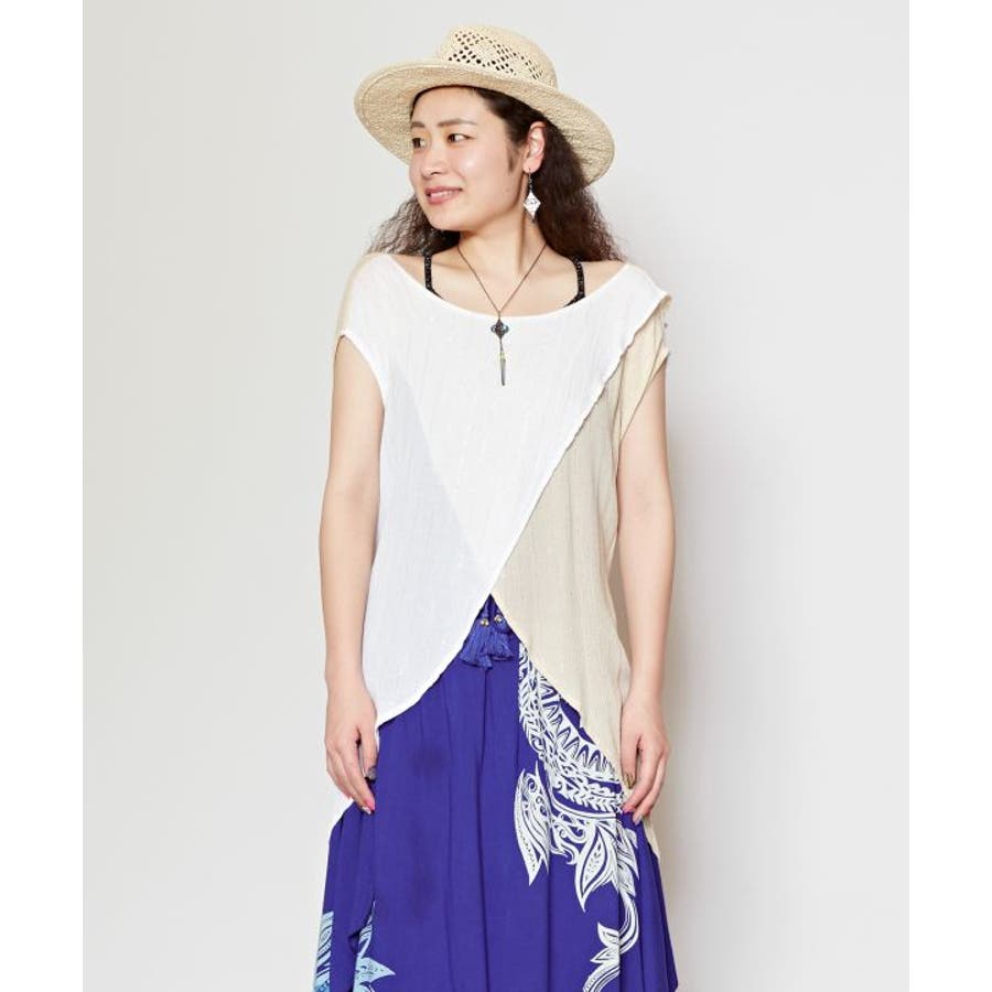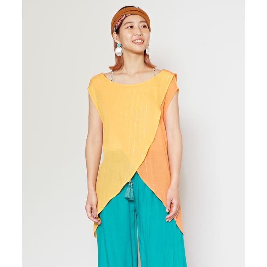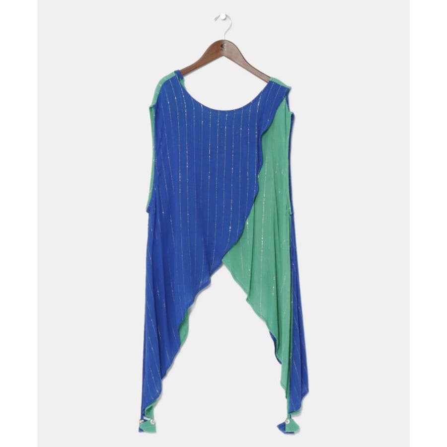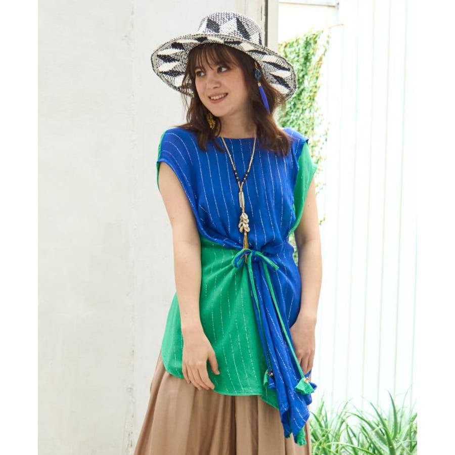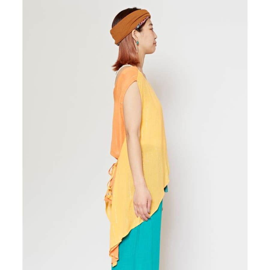 色鮮やかなサリーの色彩から色を組み合わせた前後2WAY仕様のタンクトップ。ウエストの紐を結べばスタイルアップ効果もあり、結ばずに着てもさらりとした揺れ感が楽しめる一枚。