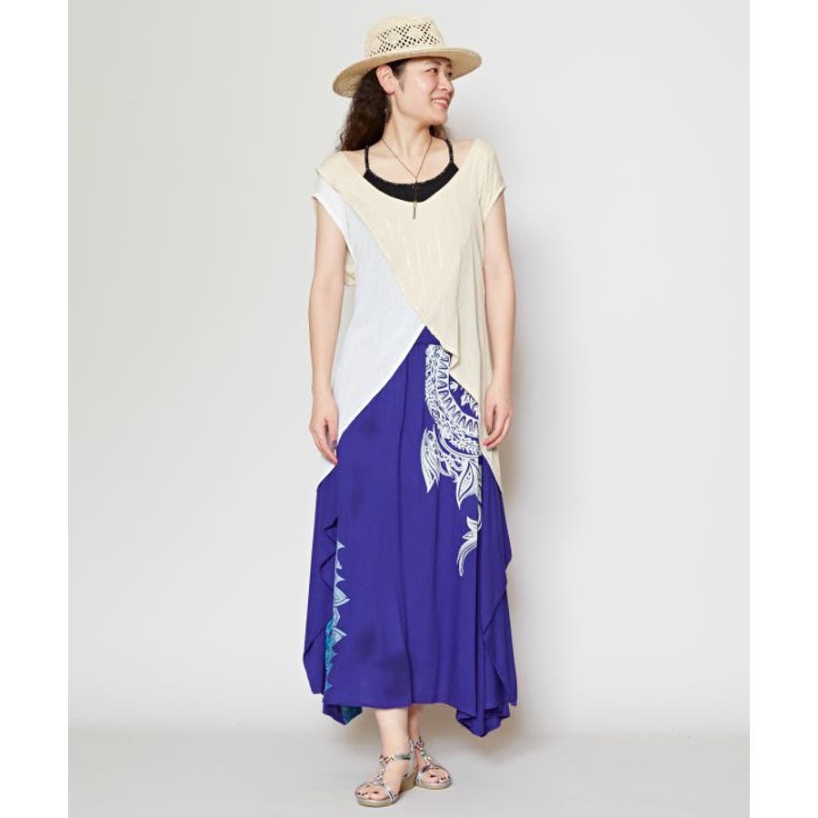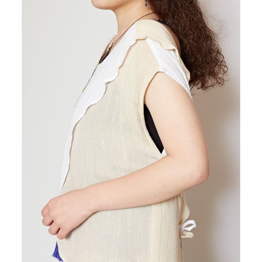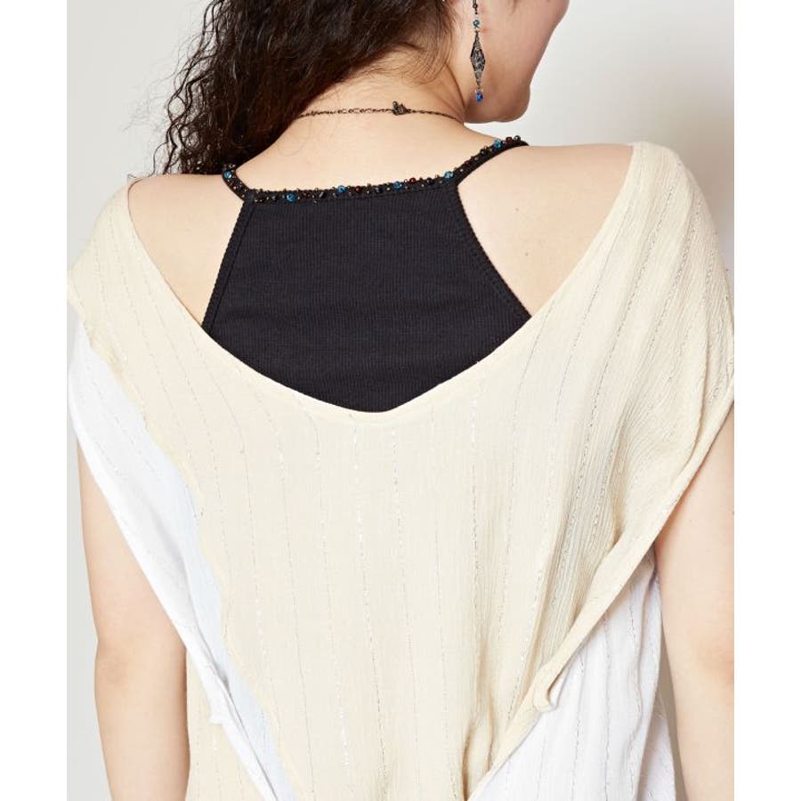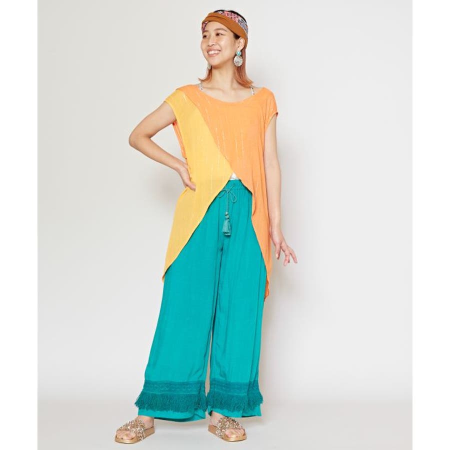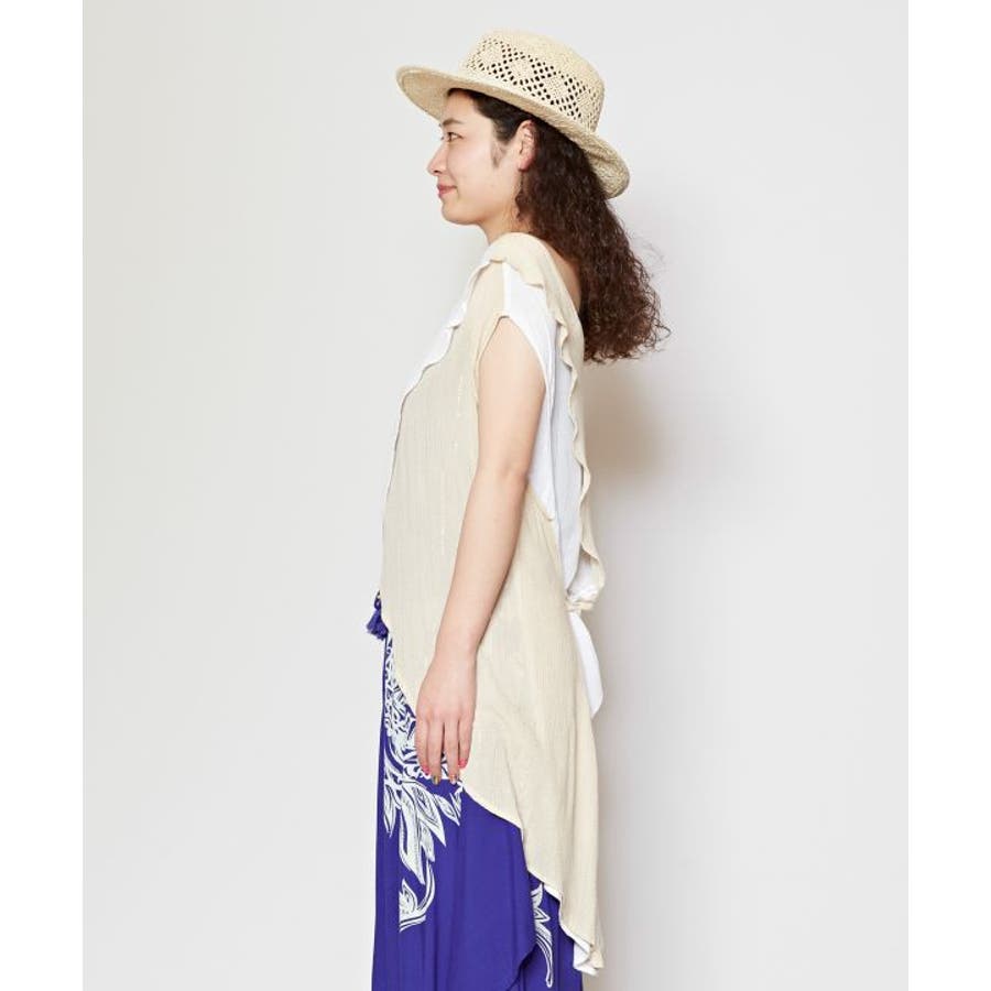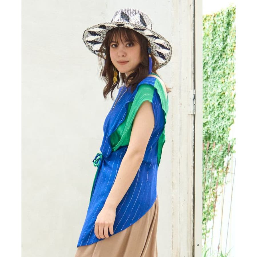 色鮮やかなサリーの色彩から色を組み合わせた前後2WAY仕様のタンクトップ。ウエストの紐を結べばスタイルアップ効果もあり、結ばずに着てもさらりとした揺れ感が楽しめる一枚。