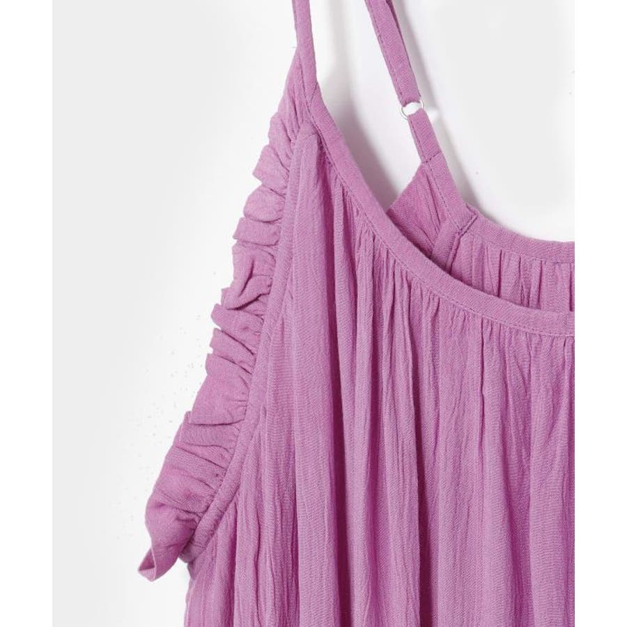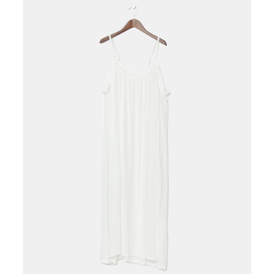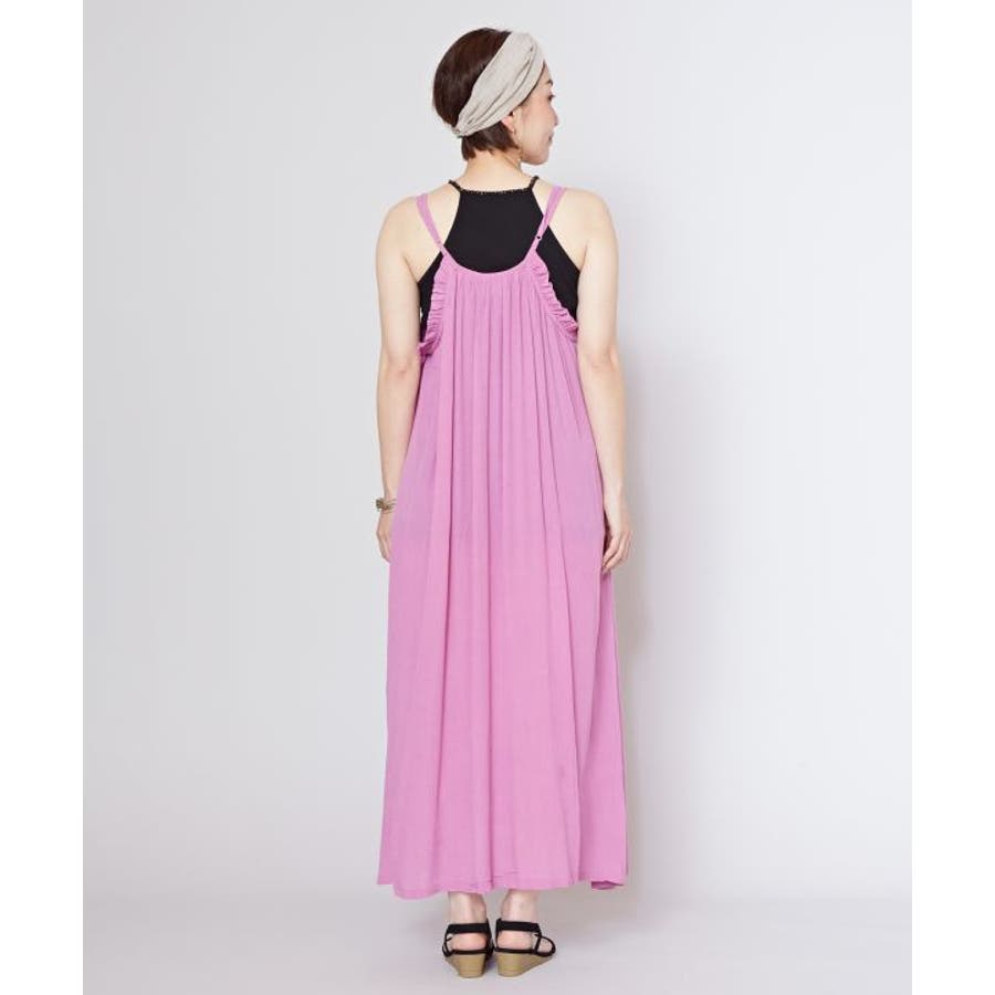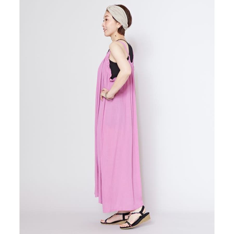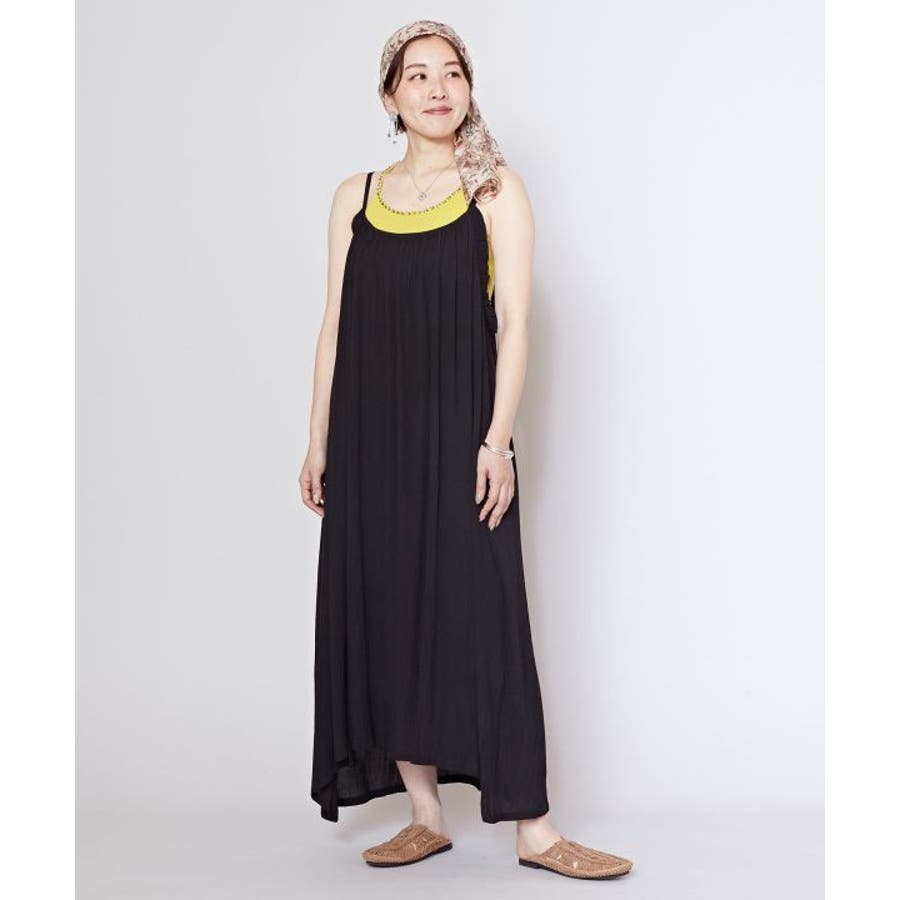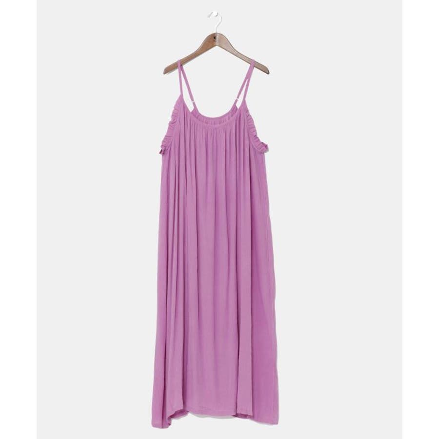 涼しく着られるレーヨンクレープ素材のキャミソールワンピース。アームホールのさりげないフリルがポイント。肩紐は長さ調節が可能。ゆったりとした風になびくシルエットが綺麗なアイテム。ニュアンシーなカラーで大人かわいいコーデが楽しめる一枚。