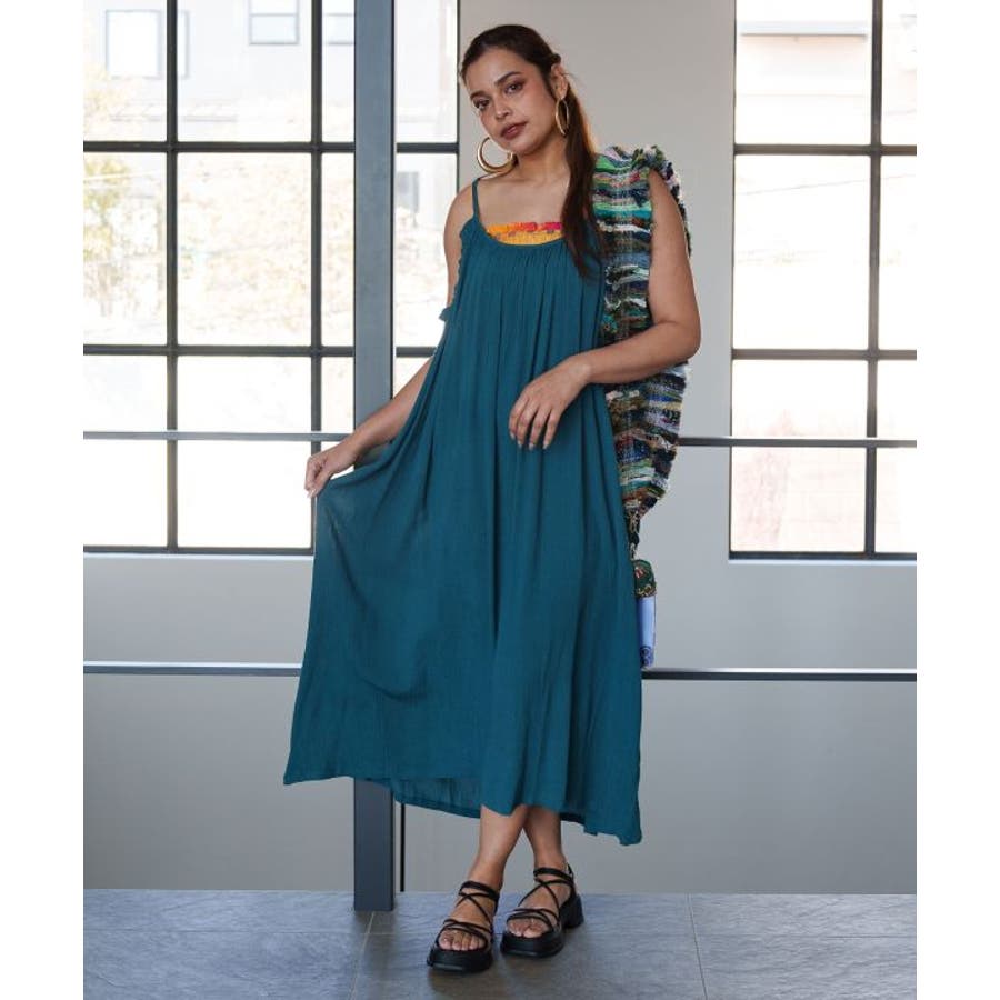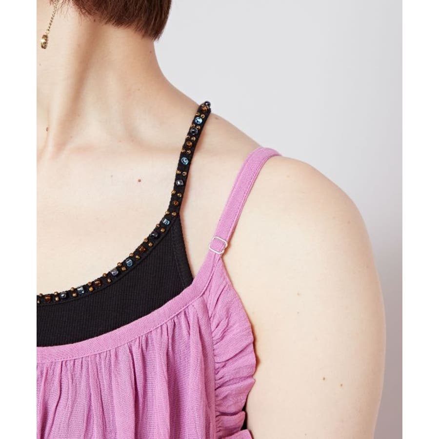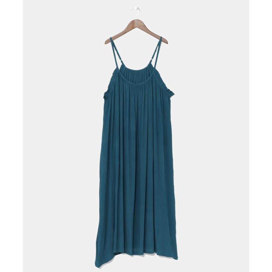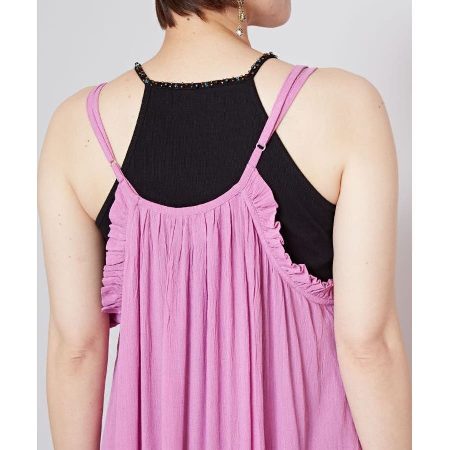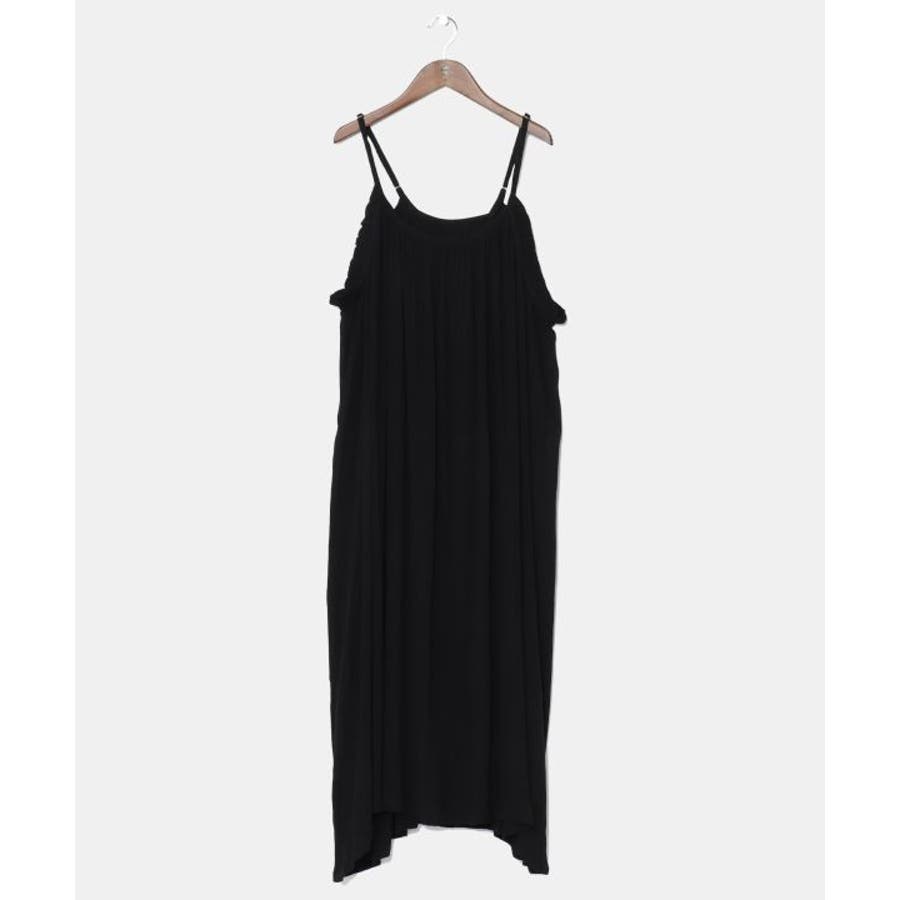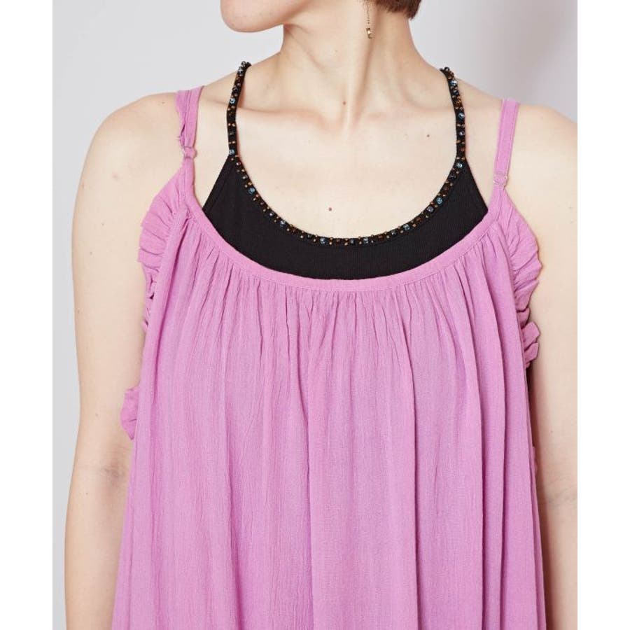 涼しく着られるレーヨンクレープ素材のキャミソールワンピース。アームホールのさりげないフリルがポイント。肩紐は長さ調節が可能。ゆったりとした風になびくシルエットが綺麗なアイテム。ニュアンシーなカラーで大人かわいいコーデが楽しめる一枚。