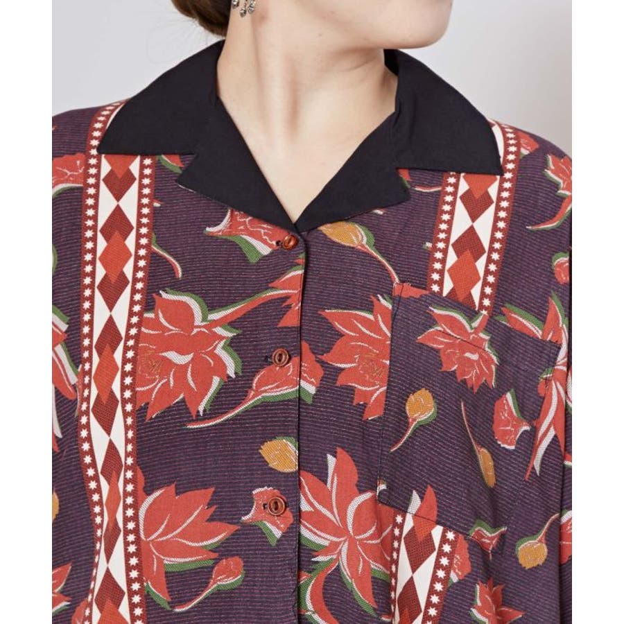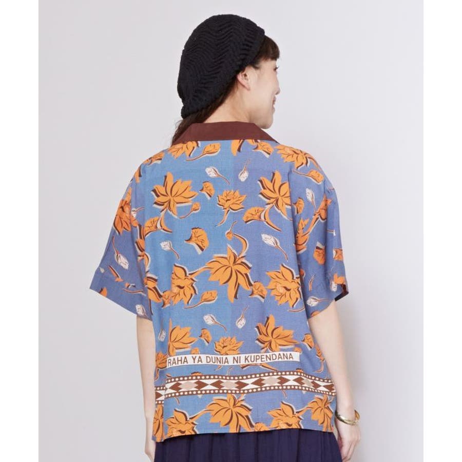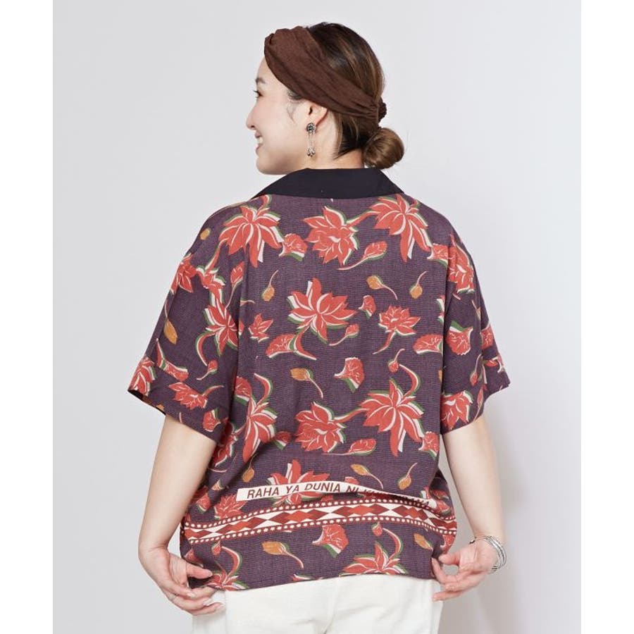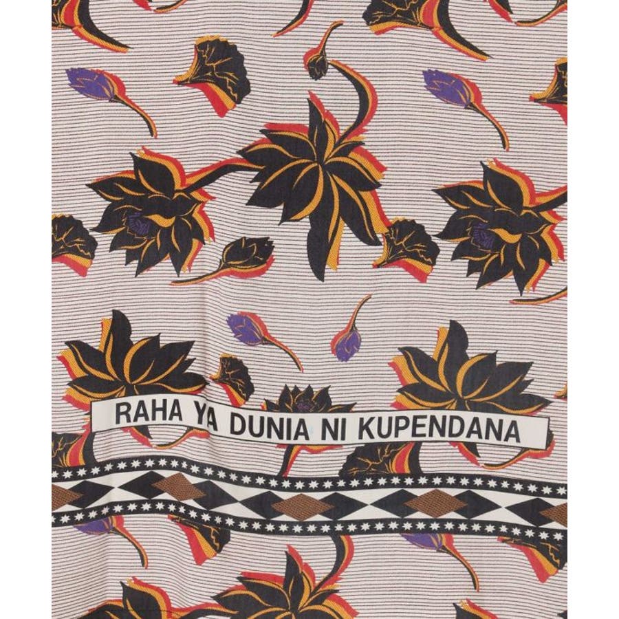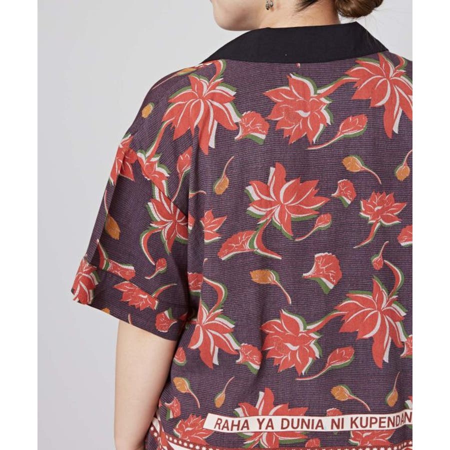 アフリカのカンガからインスパイアを受け、ロータス柄をアフリカンな雰囲気にリデザインしたシャツ。ヴィンテージ感溢れるシックな色合いと、ボウリングシャツとアロハシャツをミックスさせた一着。短めの着丈は、脚長効果あり。描かれたカンガセイイングの意味は、「この世の幸せは愛し合うこと」