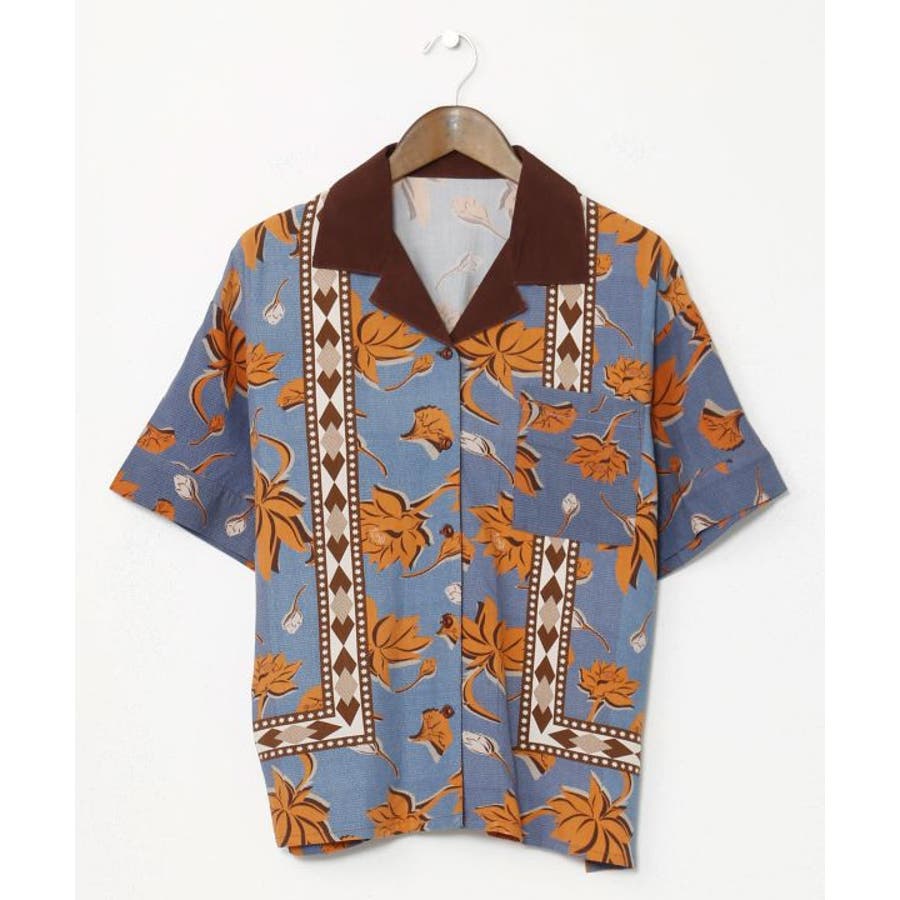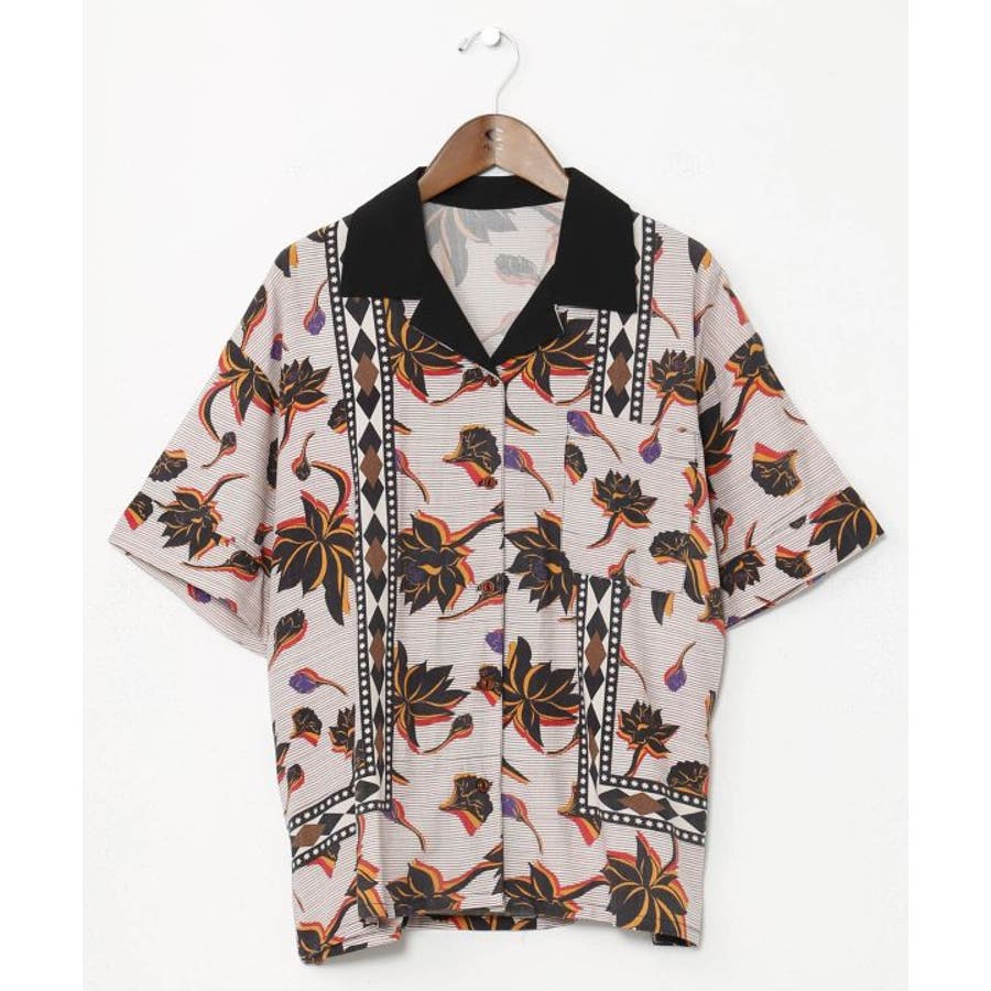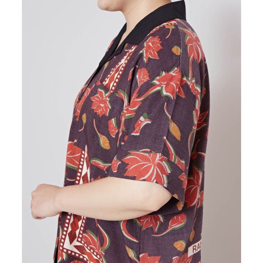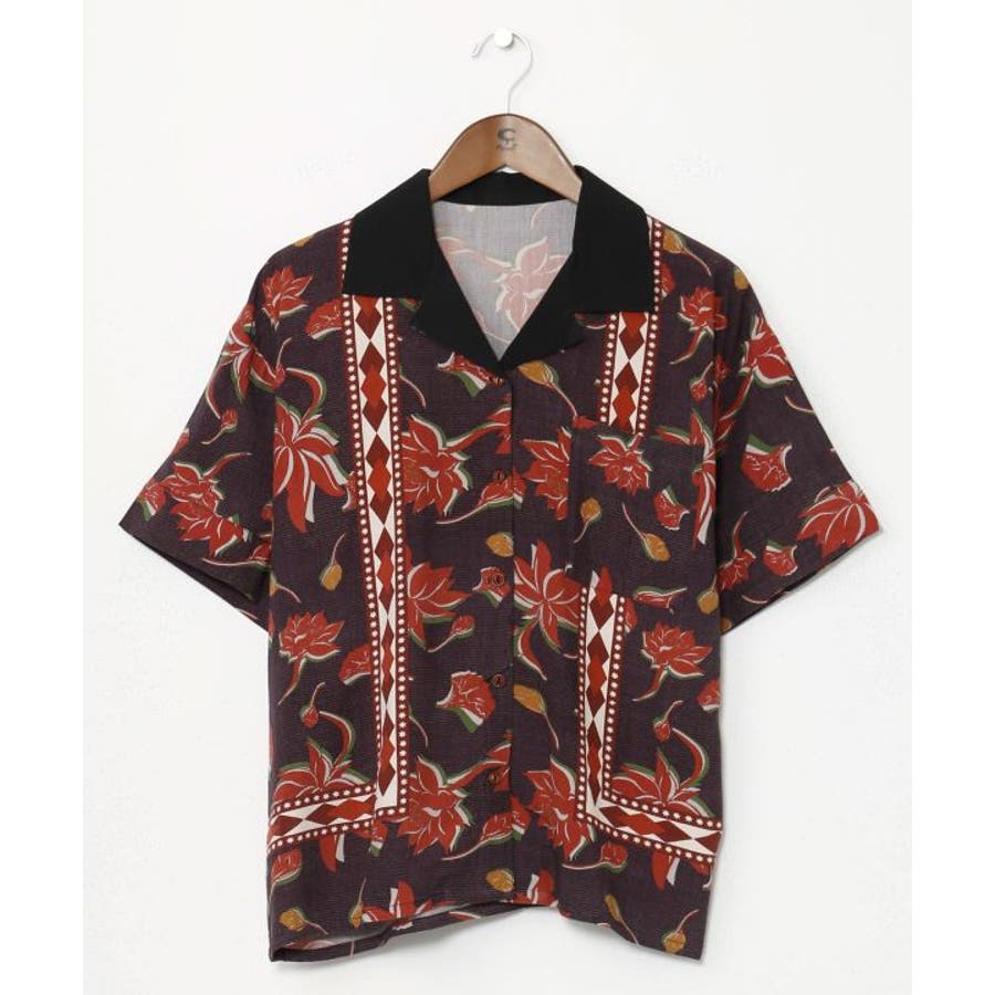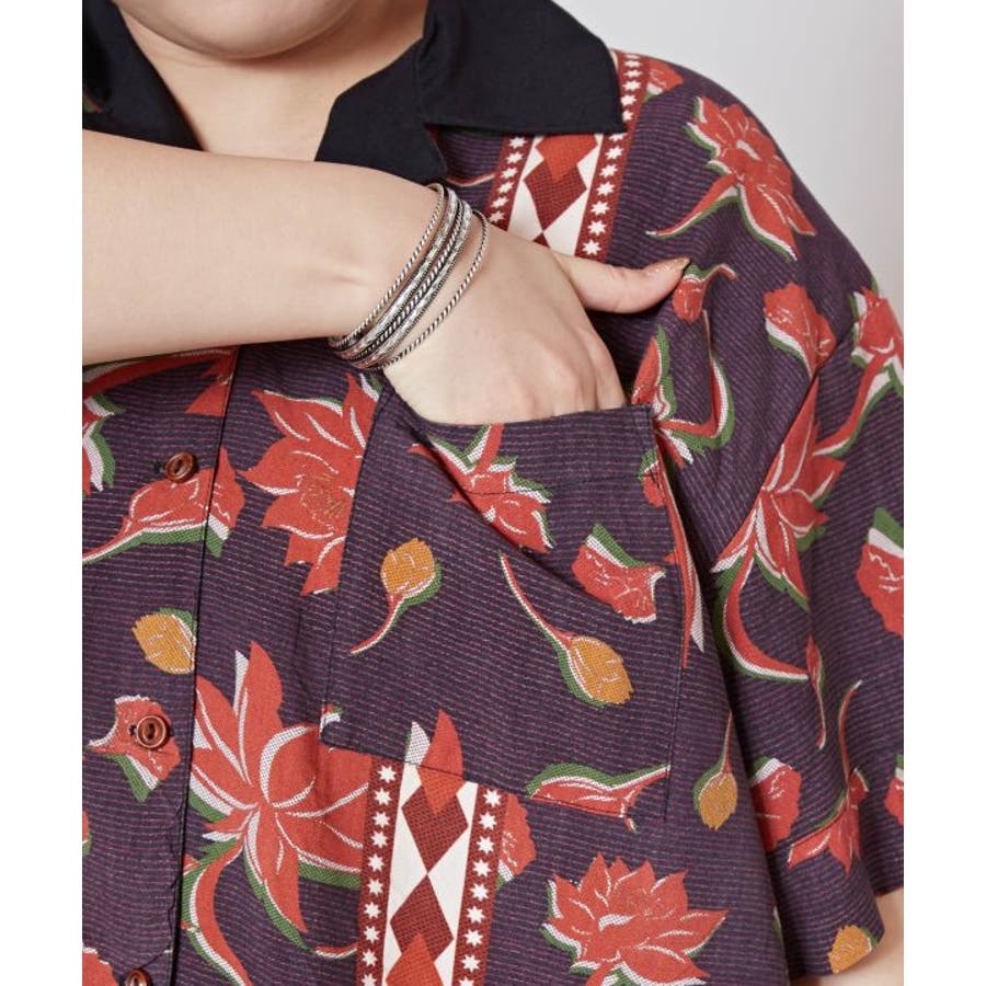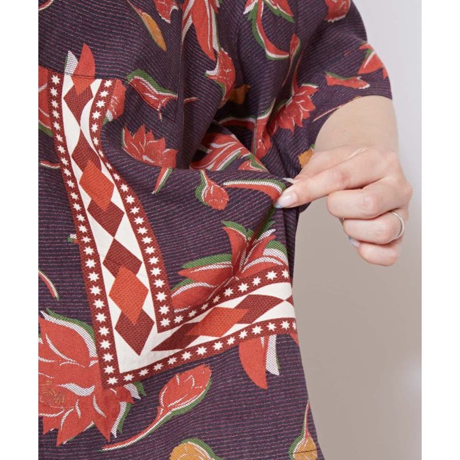 アフリカのカンガからインスパイアを受け、ロータス柄をアフリカンな雰囲気にリデザインしたシャツ。ヴィンテージ感溢れるシックな色合いと、ボウリングシャツとアロハシャツをミックスさせた一着。短めの着丈は、脚長効果あり。描かれたカンガセイイングの意味は、「この世の幸せは愛し合うこと」