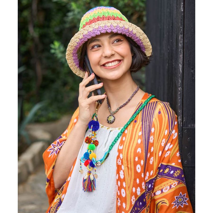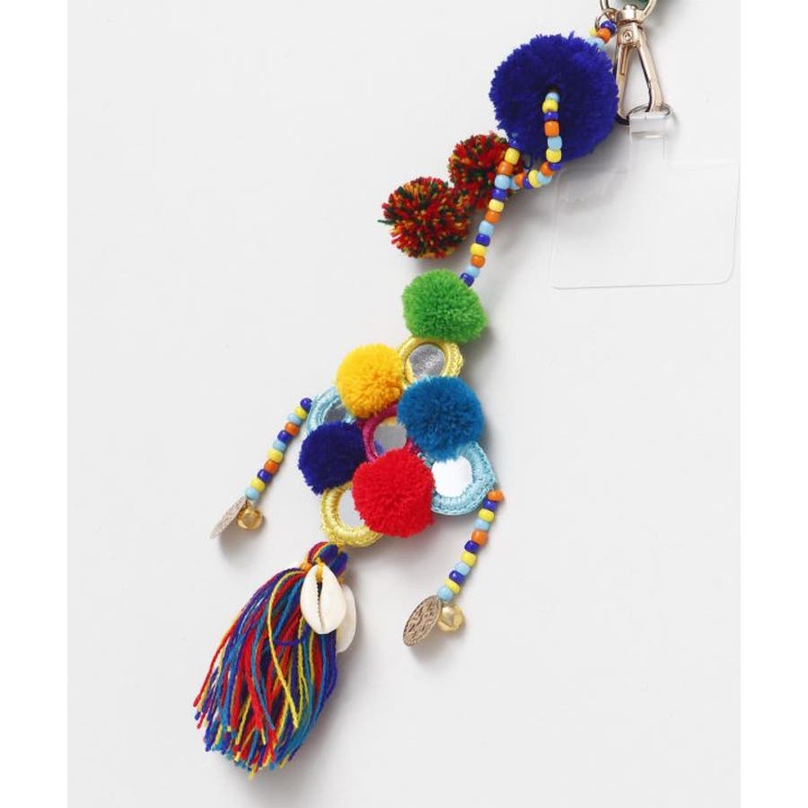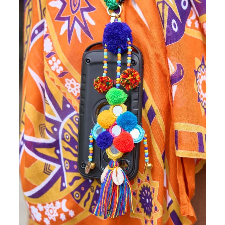 カラフルな素材と、インドならではのミラーチャームやシェル、タッセルを組み合わせてスマートフォンストラップを作りました。付属のカードをお持ちのスマートフォンカバーに挟んで使用してください。