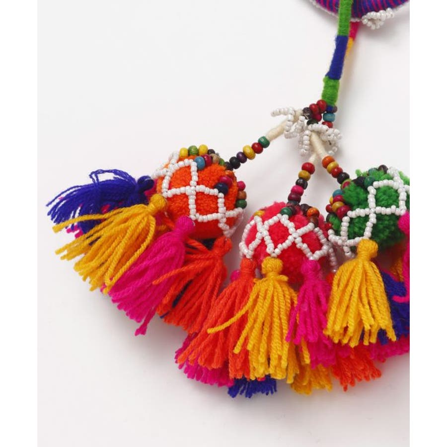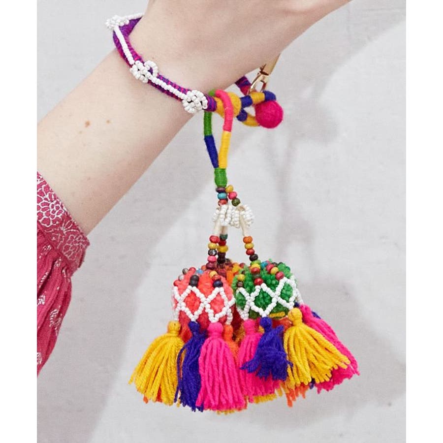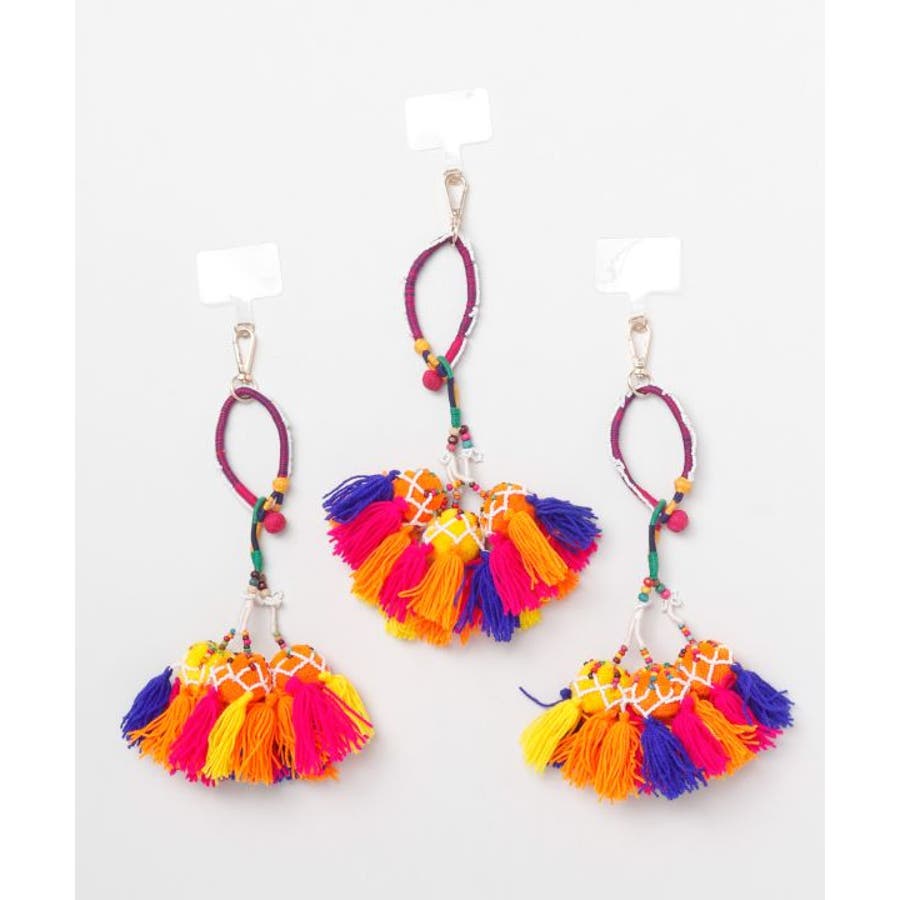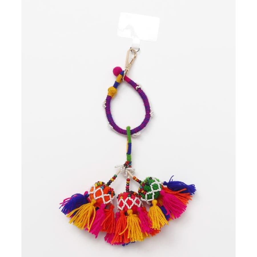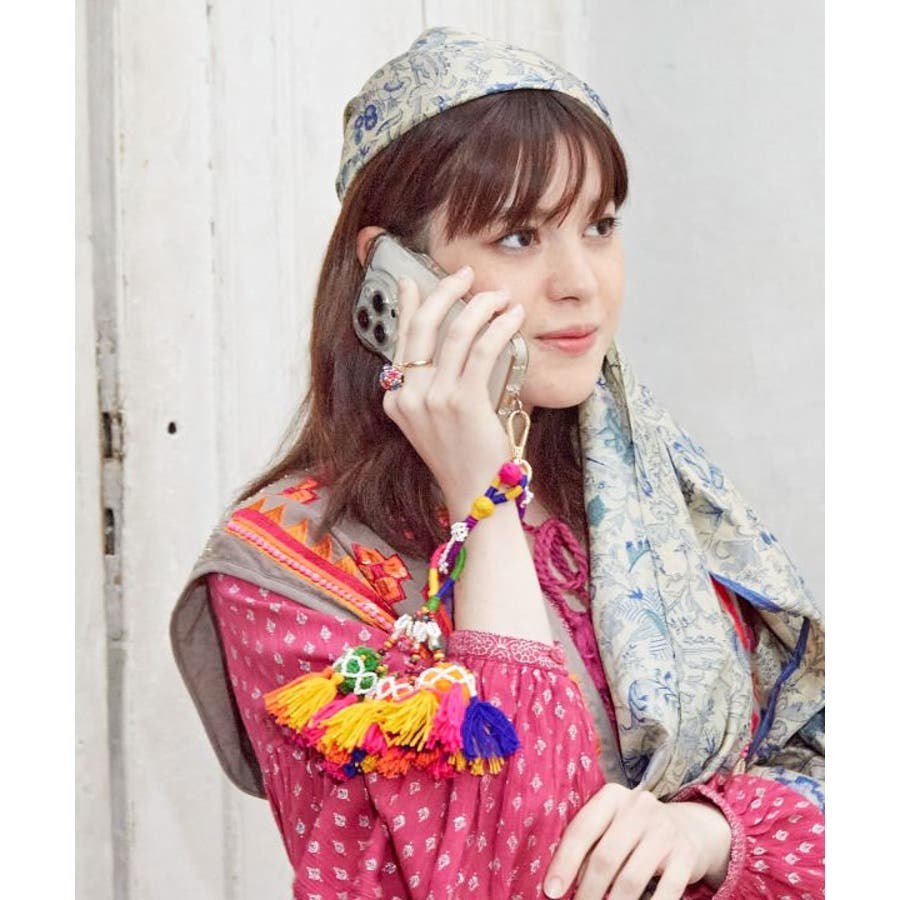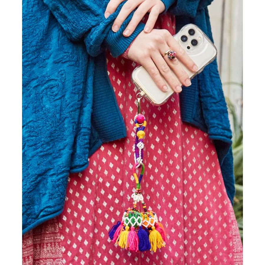 インド・バンジャラ族のハンドワークによく見られるビーズとタッセルワークをモチーフにして、スマートフォンストラップを作りました。付属のカードをお持ちのスマートフォンカバーに挟んで使用してください。