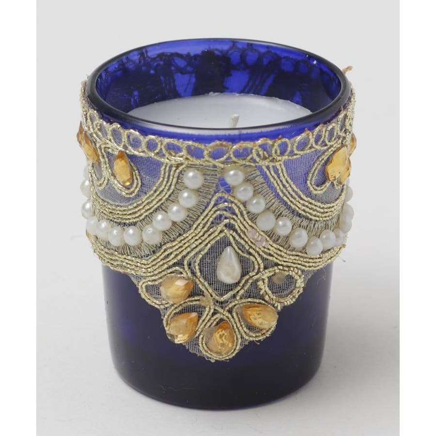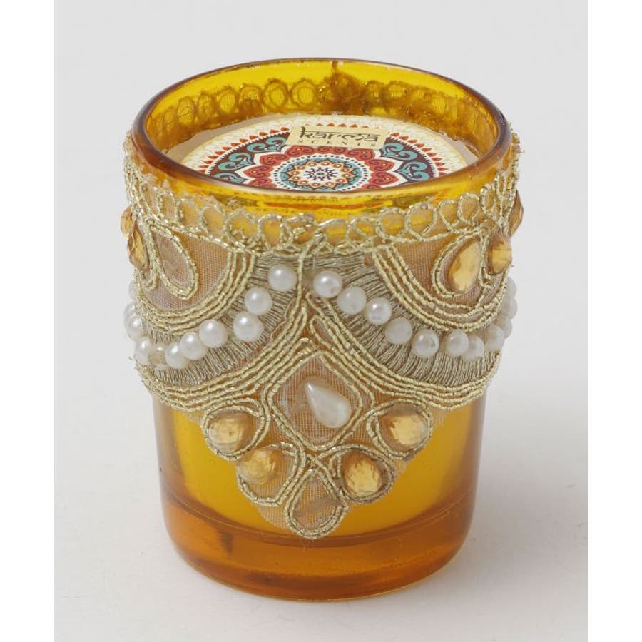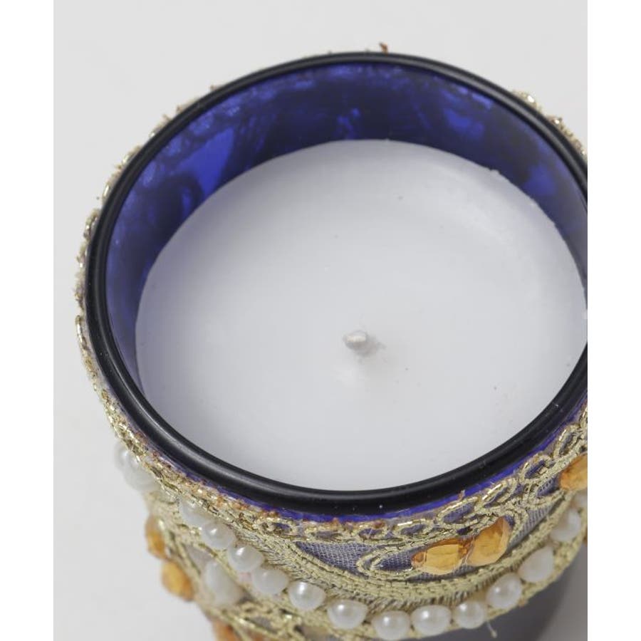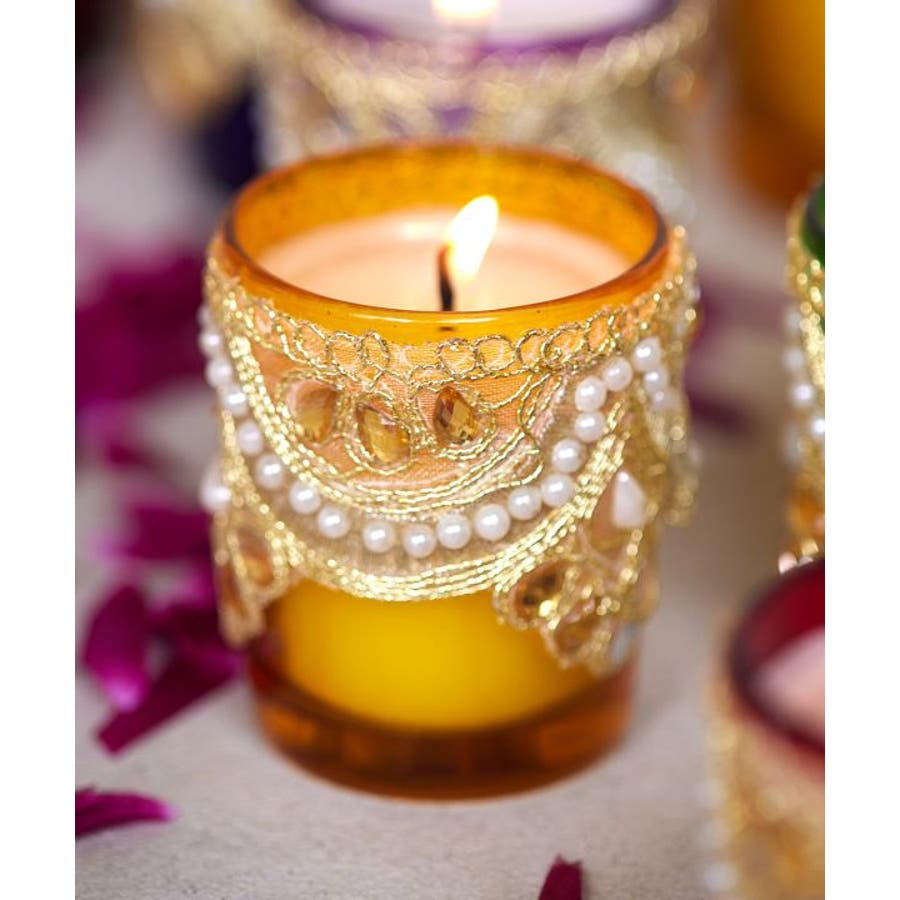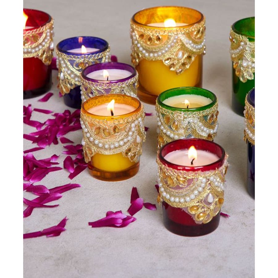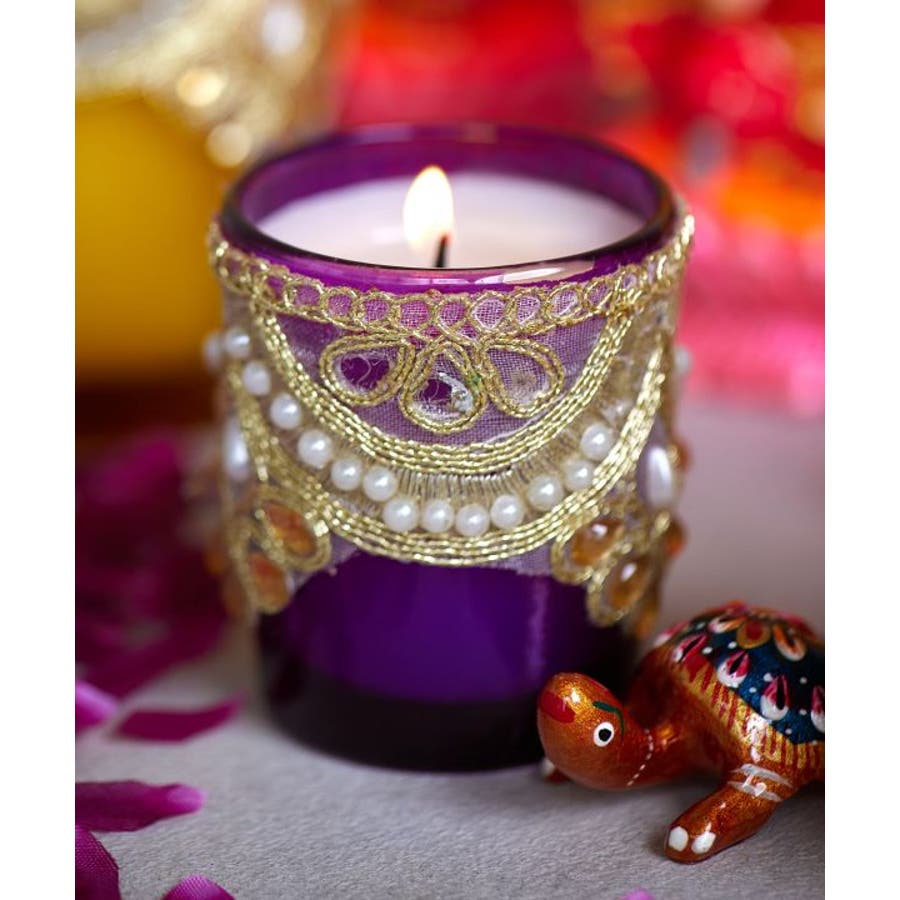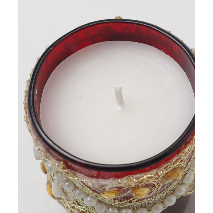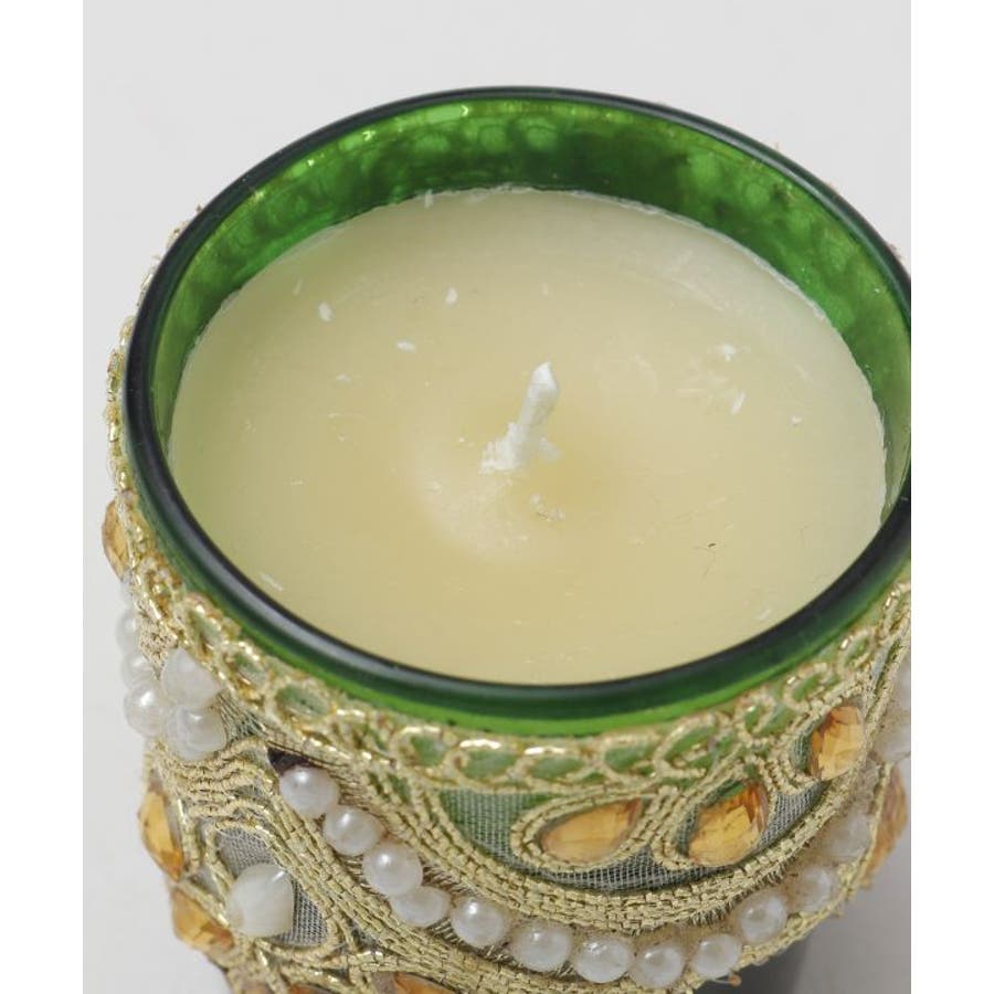 装飾が施されたカラフルなキャンドル 。インドのラジャスタンを感じさせるようなカラーリングで、空間をゴージャスに演出。5種類の香りが選べます。