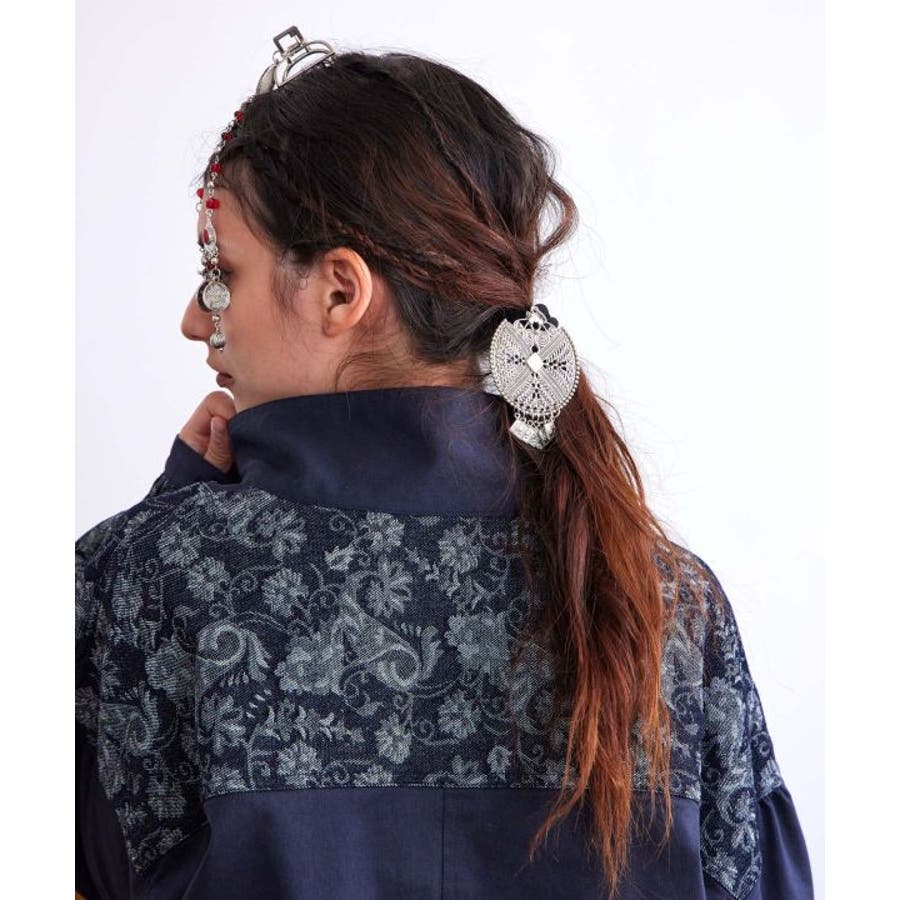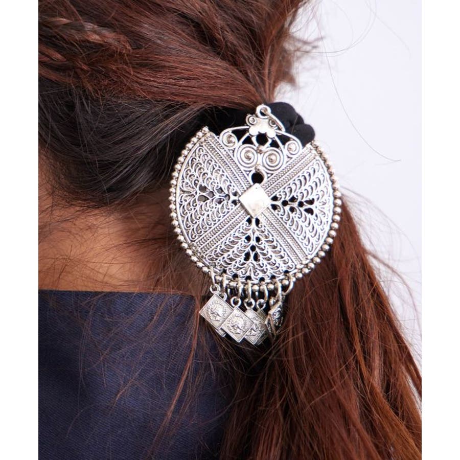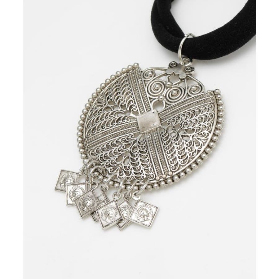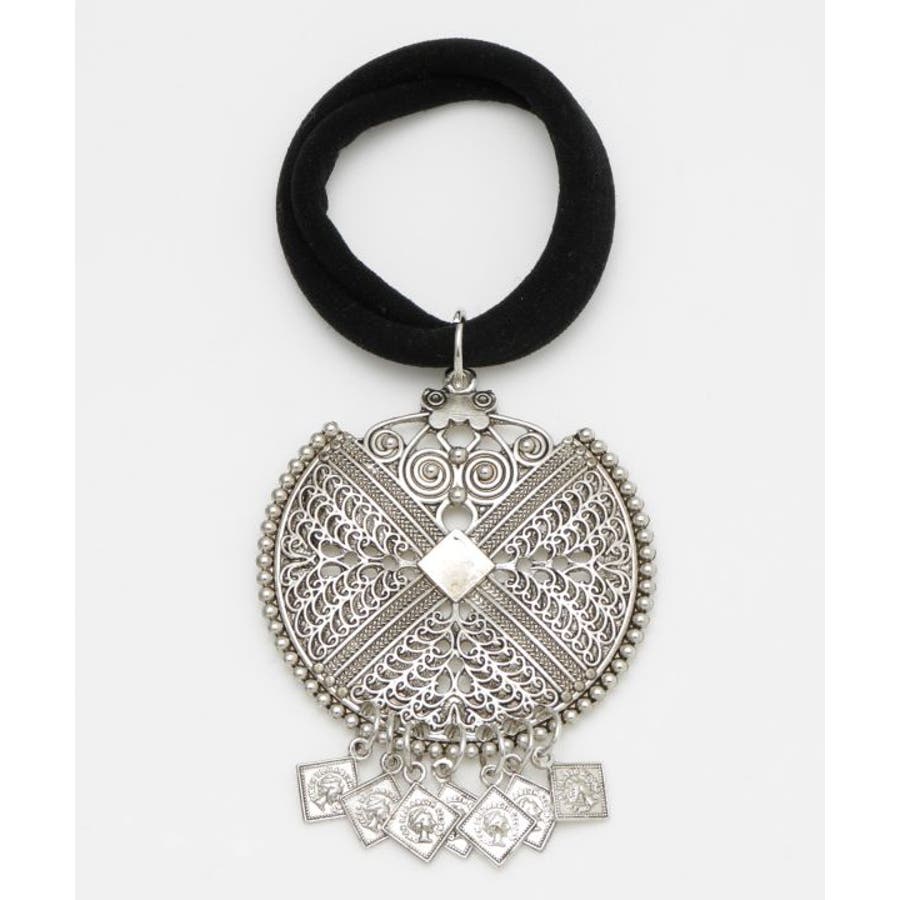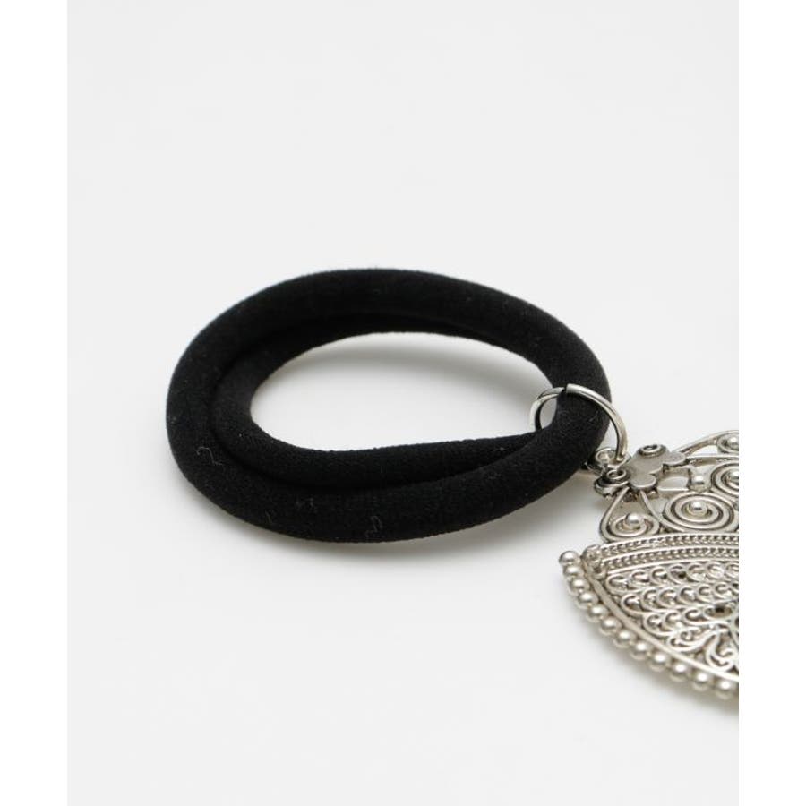 遊牧民の身に着ける飾りからインスピレーションを受けた、贅沢なチャームが目を惹くヘアゴム。ゴムの部分が太いので髪の毛に跡が付きづらくアレンジがしやすいのもポイント。ゆらゆらと揺れ動く装飾がアップスタイルに相性抜群のアイテム。