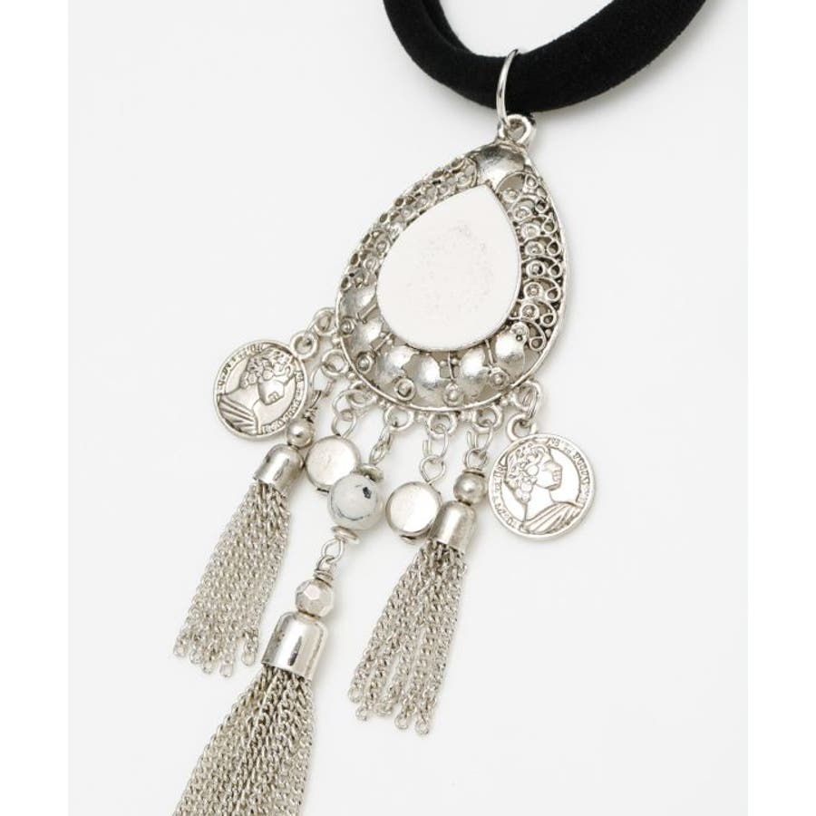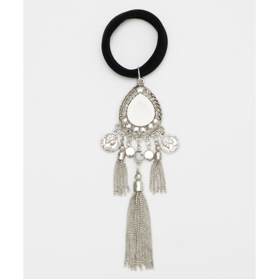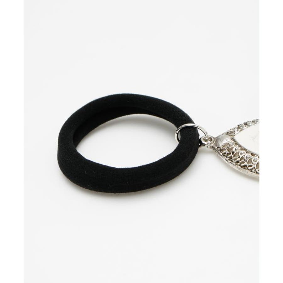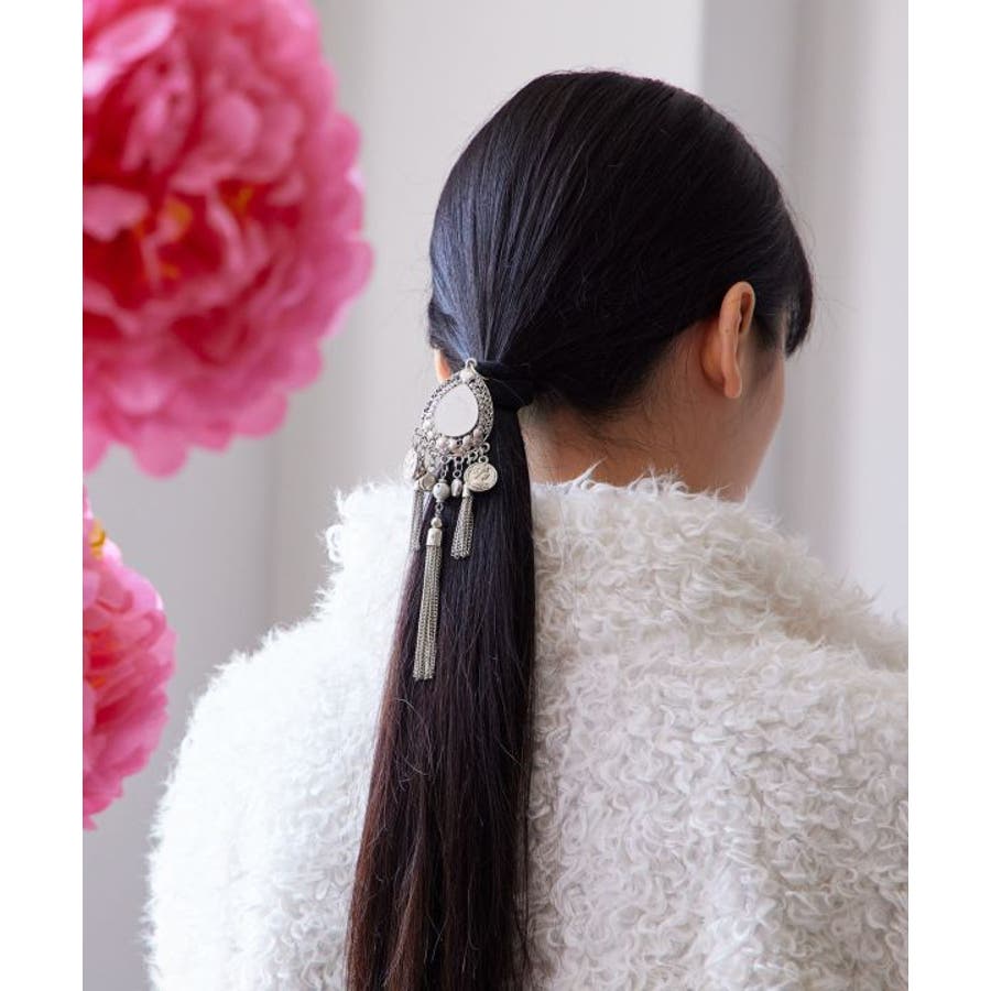 遊牧民の身に着ける飾りからインスピレーションを受けた、贅沢なチャームが目を惹くヘアゴム。ゴムの部分が太いので髪の毛に跡が付きづらくアレンジがしやすいのもポイント。ゆらゆらと揺れ動く装飾がアップスタイルに相性抜群のアイテム。