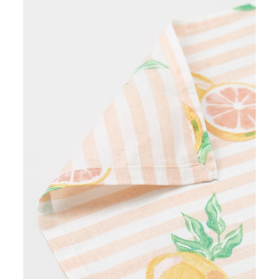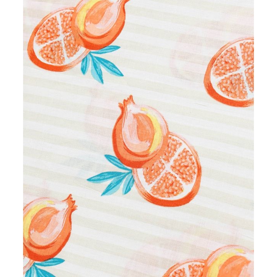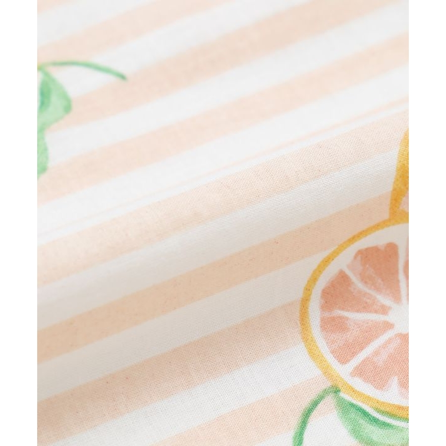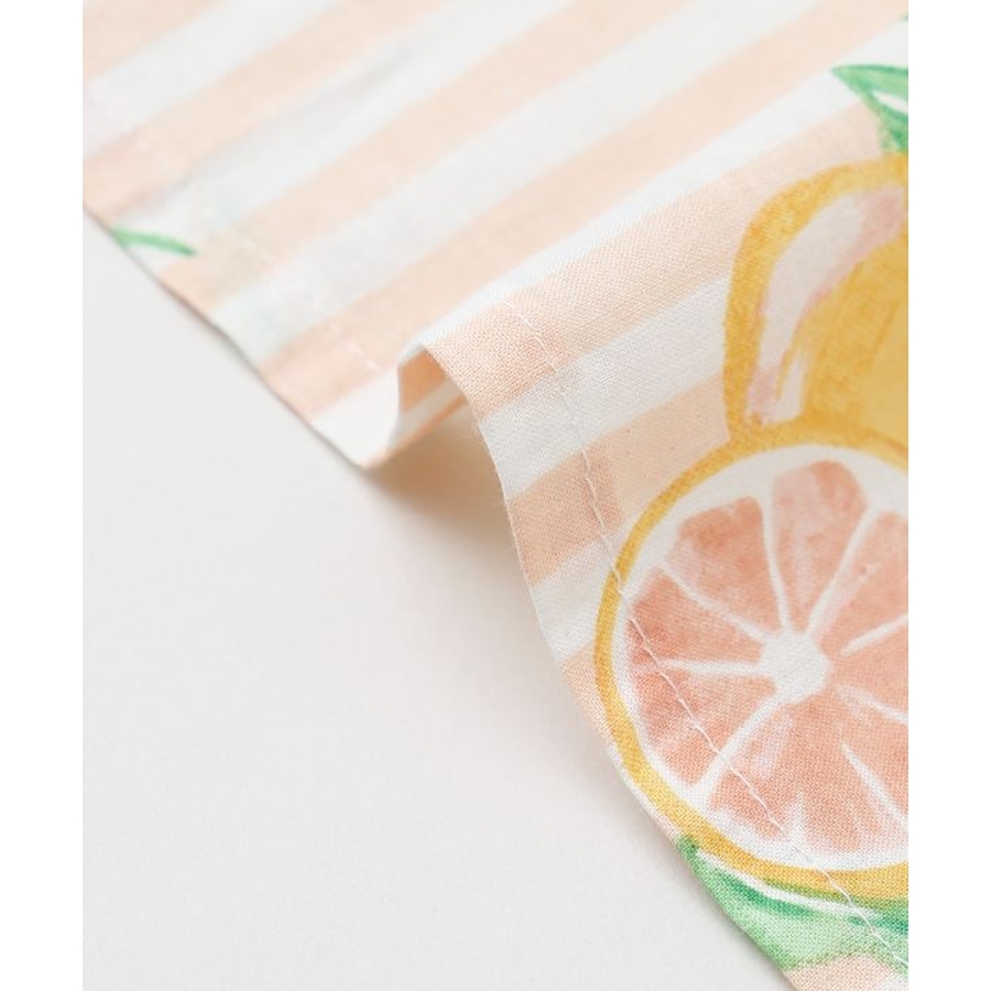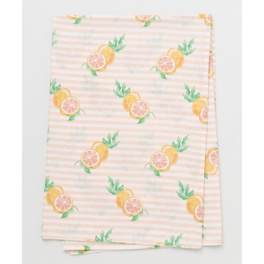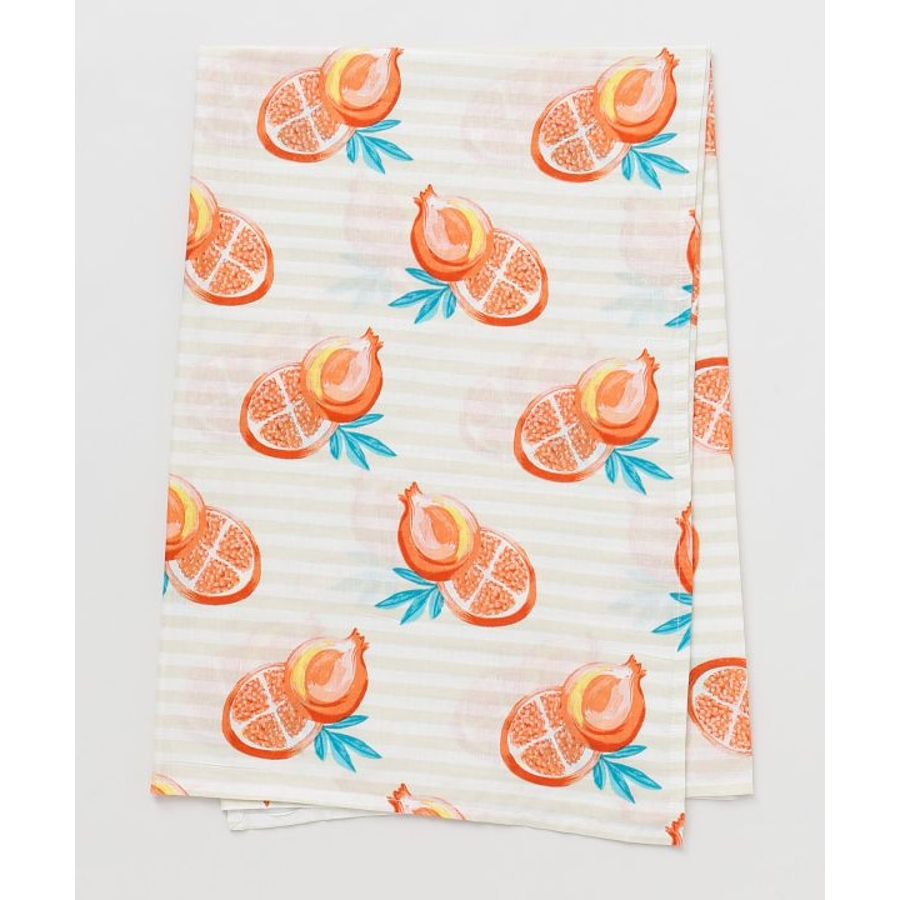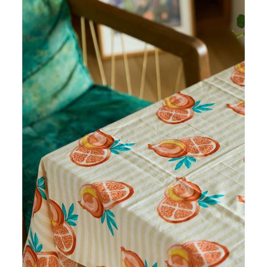 やわらかなコットン素材にフルーツ柄をのせたテーブルクロス。広げるだけで食卓がぱっと華やぎ、毎日の食事がより楽しくなる。おうち時間の気分転換にもおすすめです。