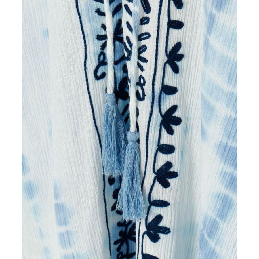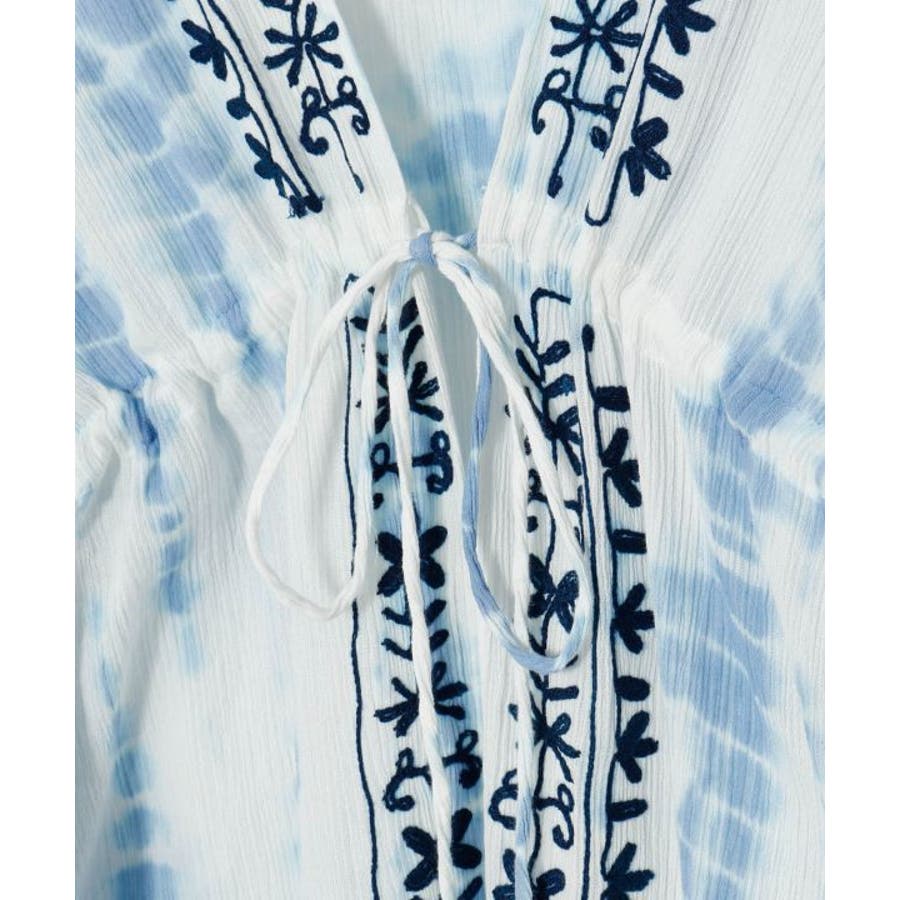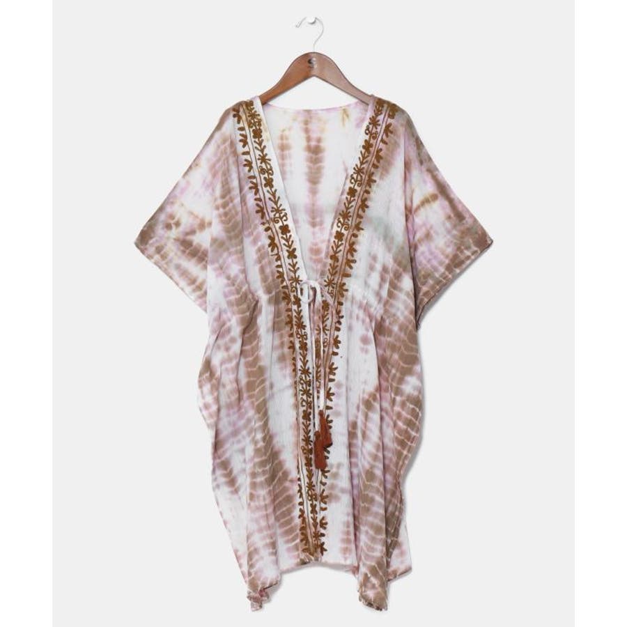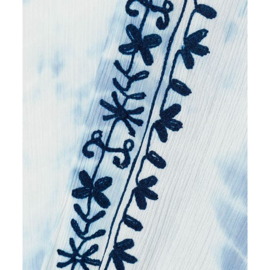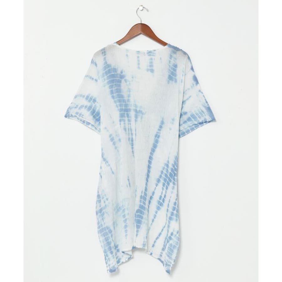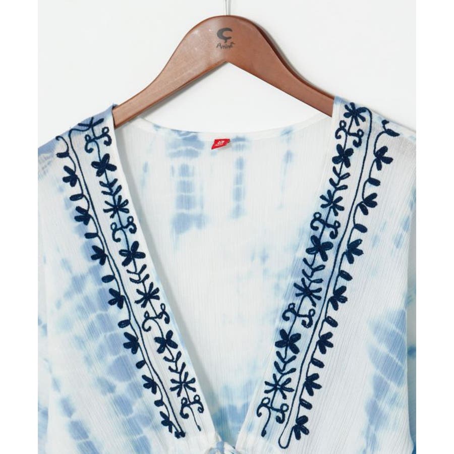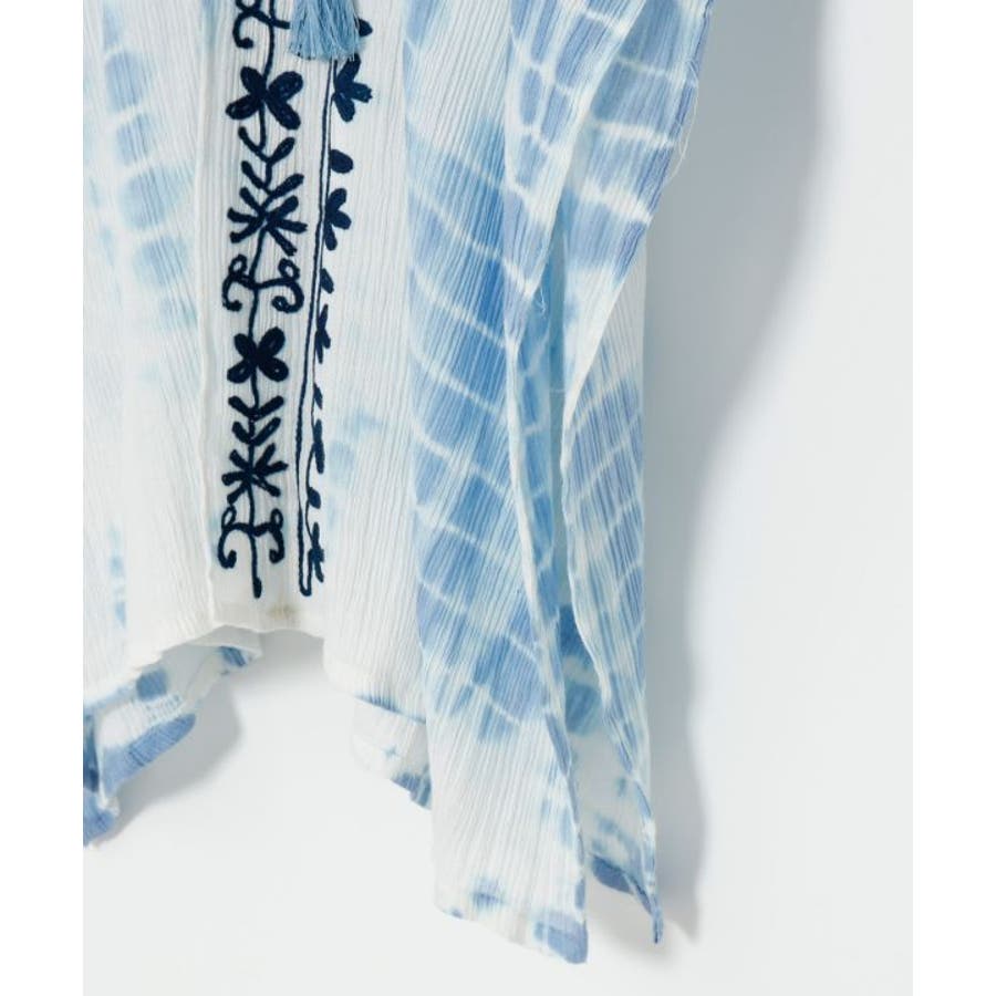 【UV加工付き】涼しげなタイダイがポイントの、軽やかなコットンクレープカーディガン。花柄のライン刺繍が大人な雰囲気をグッと上げてくれます。ゆったりと羽織れるのでノースリーブとの相性が抜群。タッセル付きの紐で、シルエットに変化を付けられます。