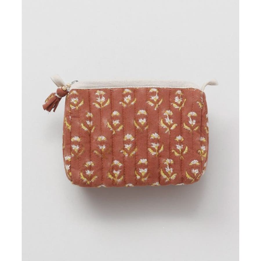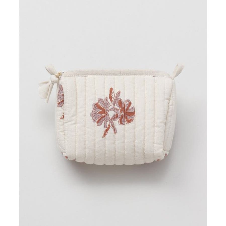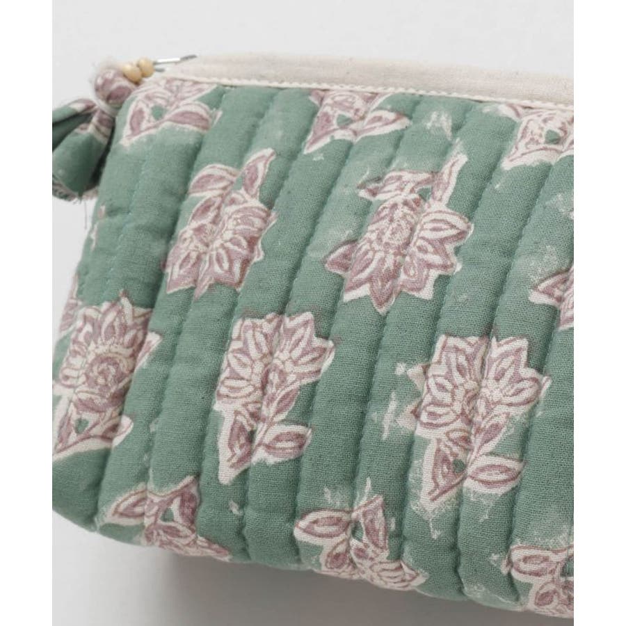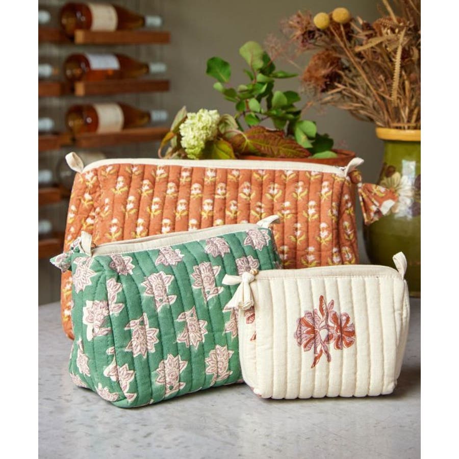 インドの伝統技法、木版ブロックプリントで柄を描いたポーチ。優しい色合いと中綿キルティングで、あなたの大事な小物を守ります。