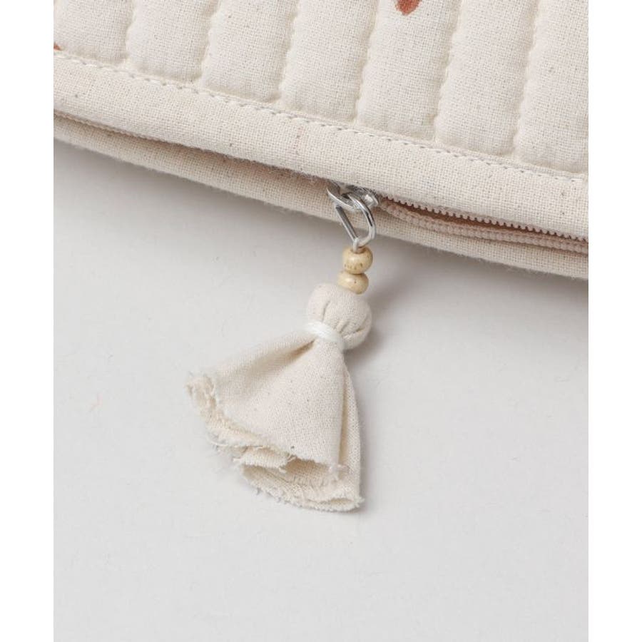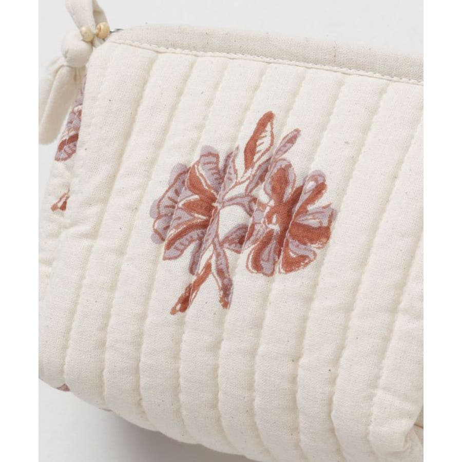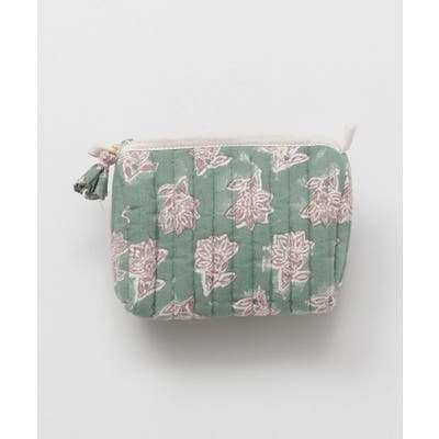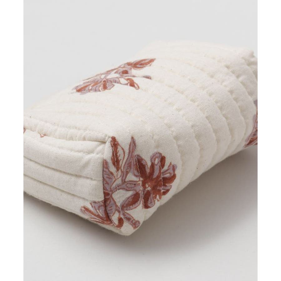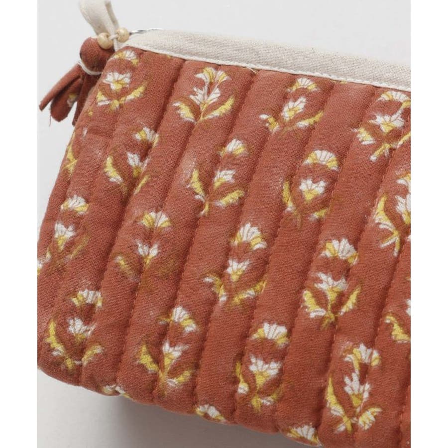 インドの伝統技法、木版ブロックプリントで柄を描いたポーチ。優しい色合いと中綿キルティングで、あなたの大事な小物を守ります。