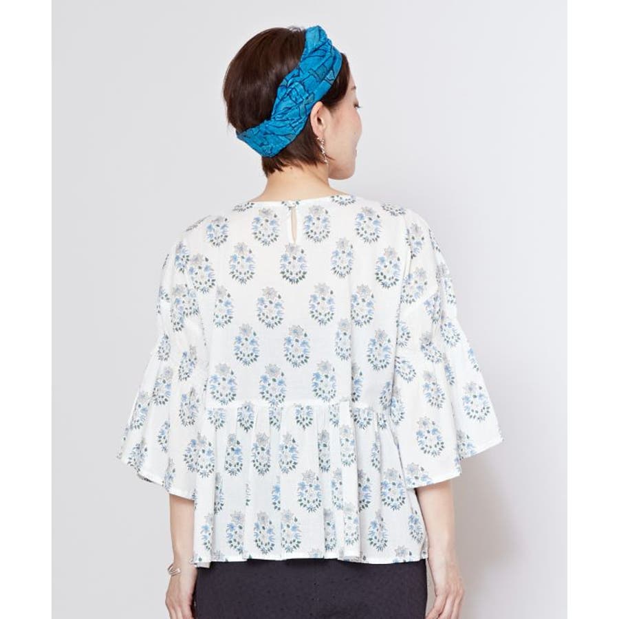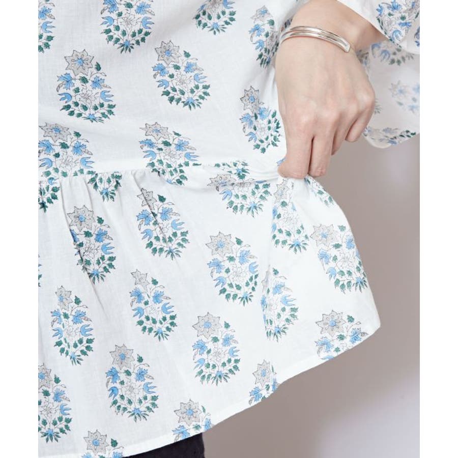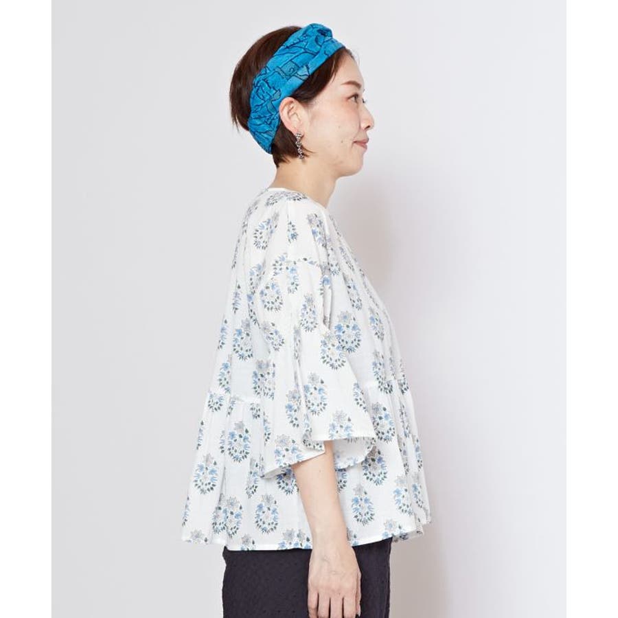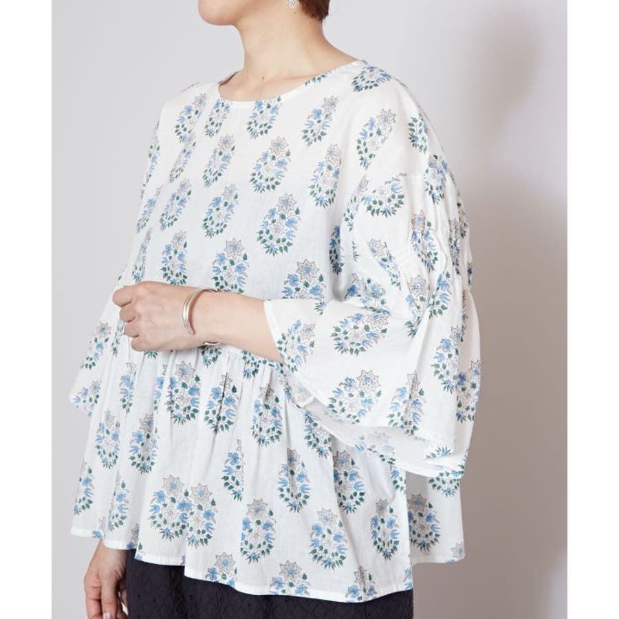 色柄ごとに異なる薄手のインド綿が涼しいブロックプリントトップス。袖のシャーリングステッチがふわっと感を演出しコーディネートを引き立たせます。長めの袖丈は強い日差しの日よけにも。