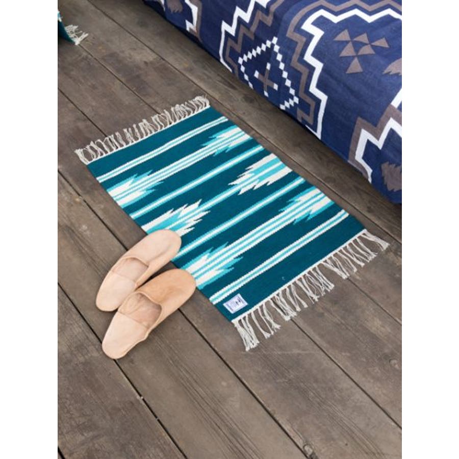 手織りならではの温かみのある風合いが魅力のラグマット。オルテガ柄を大胆に表現したデザイン。約45×65cmで手軽に使いやすいサイズ感です。