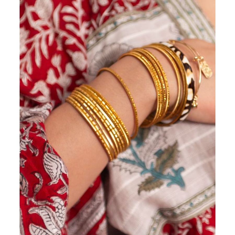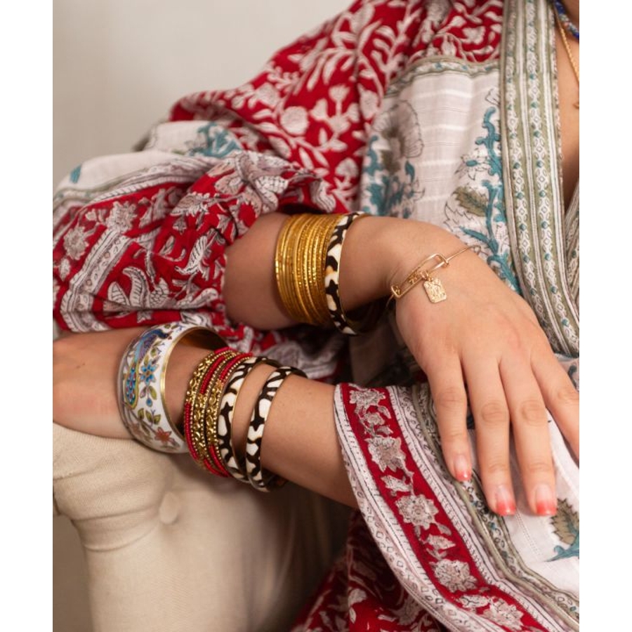インドで古くから伝わり続けているバングル。ファッションとしてだけではなく、地域の風習に基づいた普遍的なもの。複数のバングルを重ね着けすることで、こすれ合いカチカチとなる音が邪気を祓い、パワーを吸収すると言われている。自分好みの組み合わせで楽しもう。