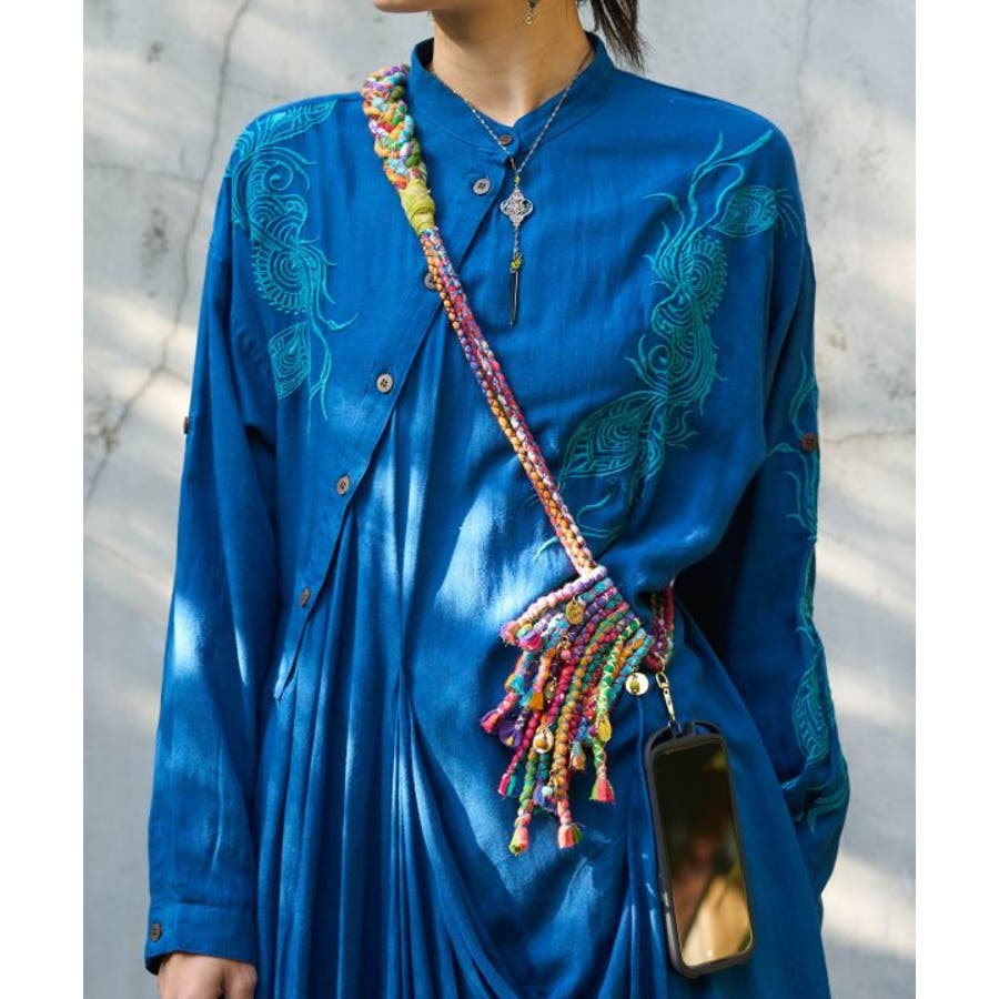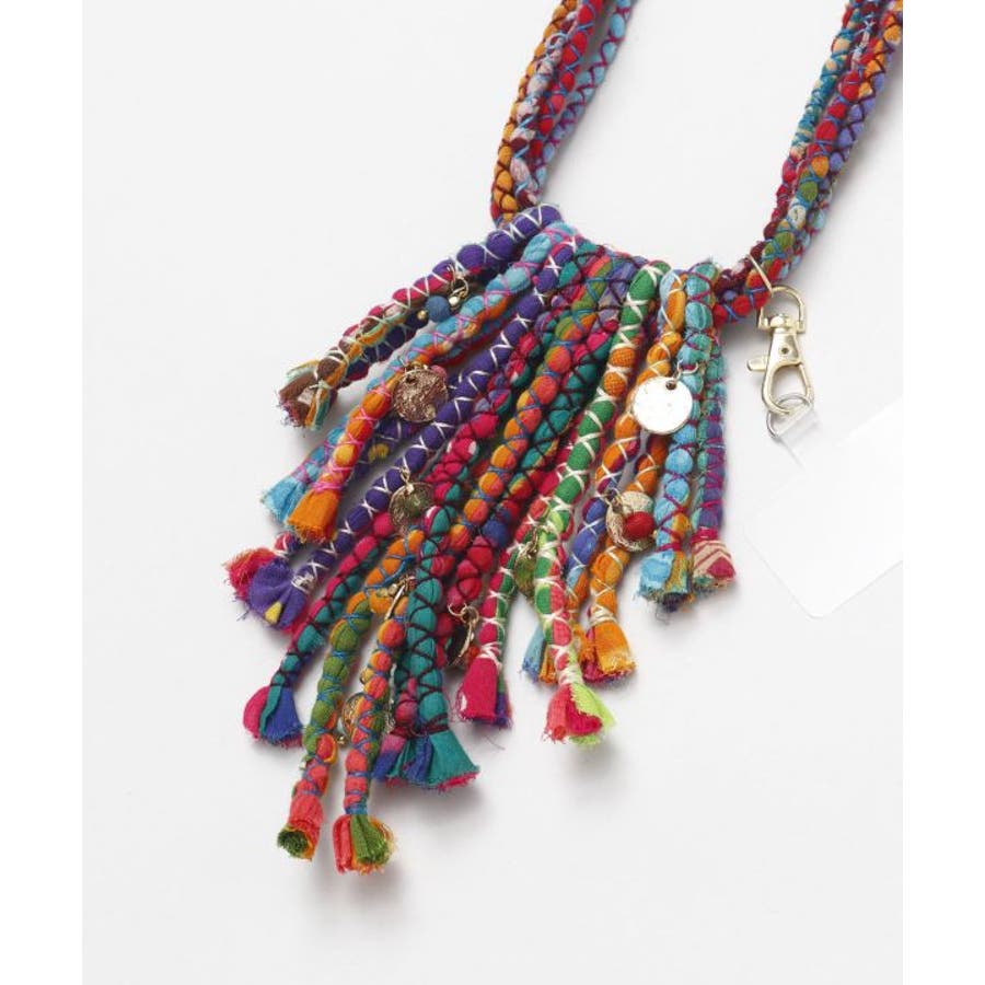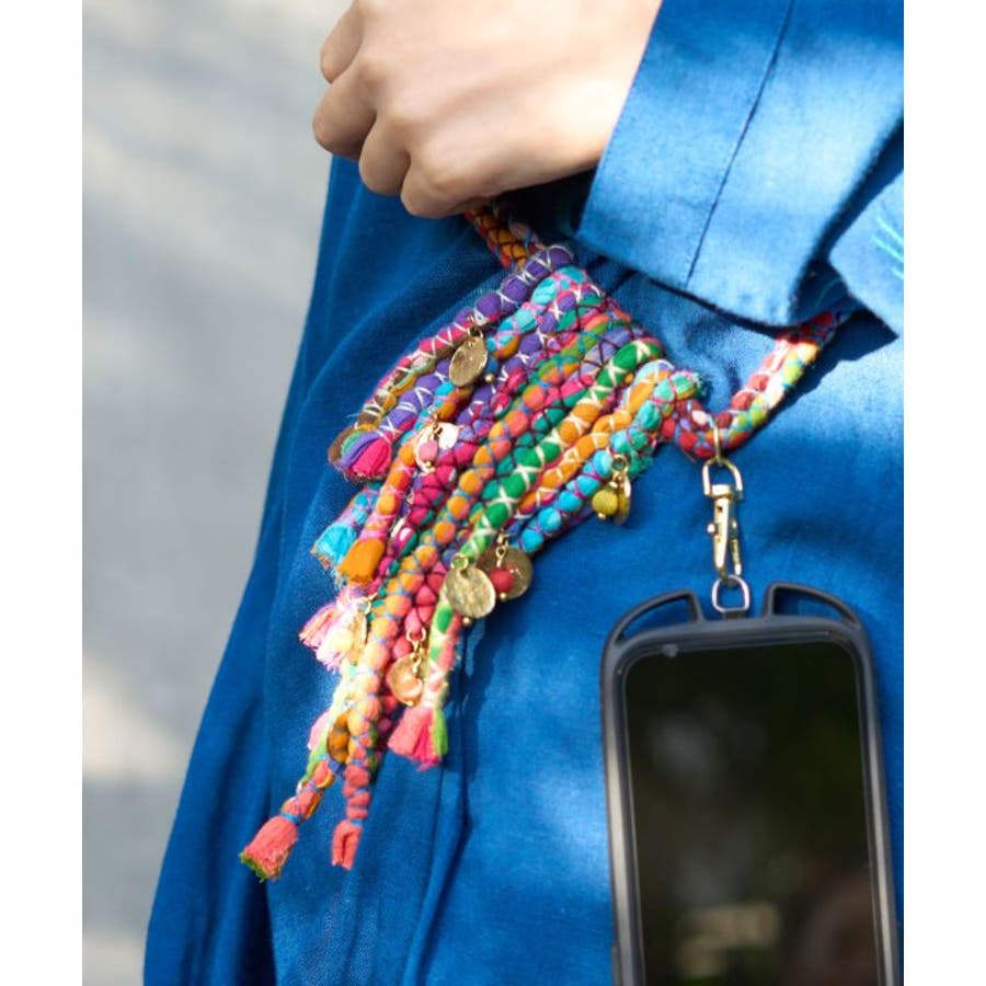 インドのリサイクルファブリックから丁寧に手作りされています。デリーで女性支援の活動の一環として商品作りを行っています。ショルダータイプのスマートフォンストラップ。付属のカードをお持ちのスマートフォンケースに挟んでご使用ください。