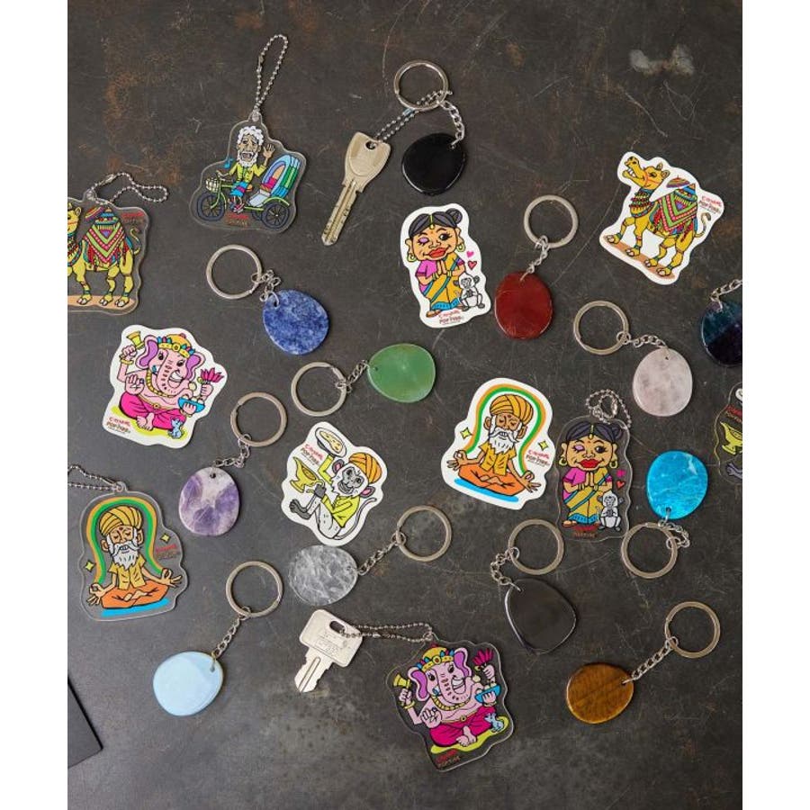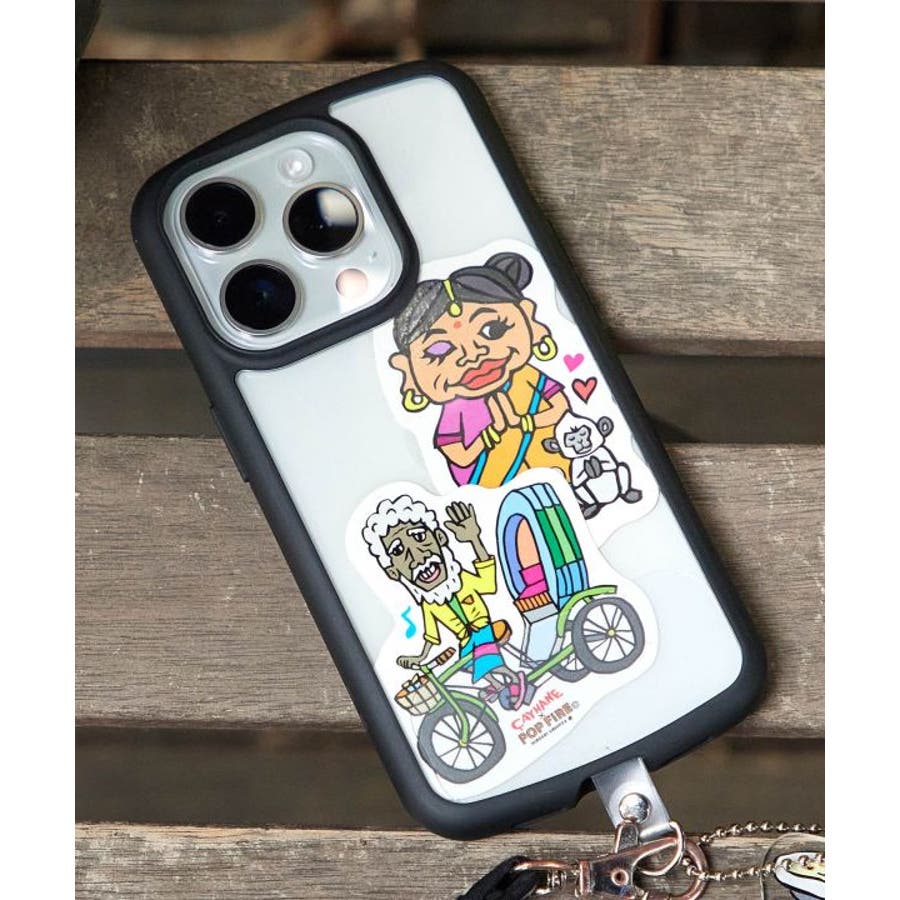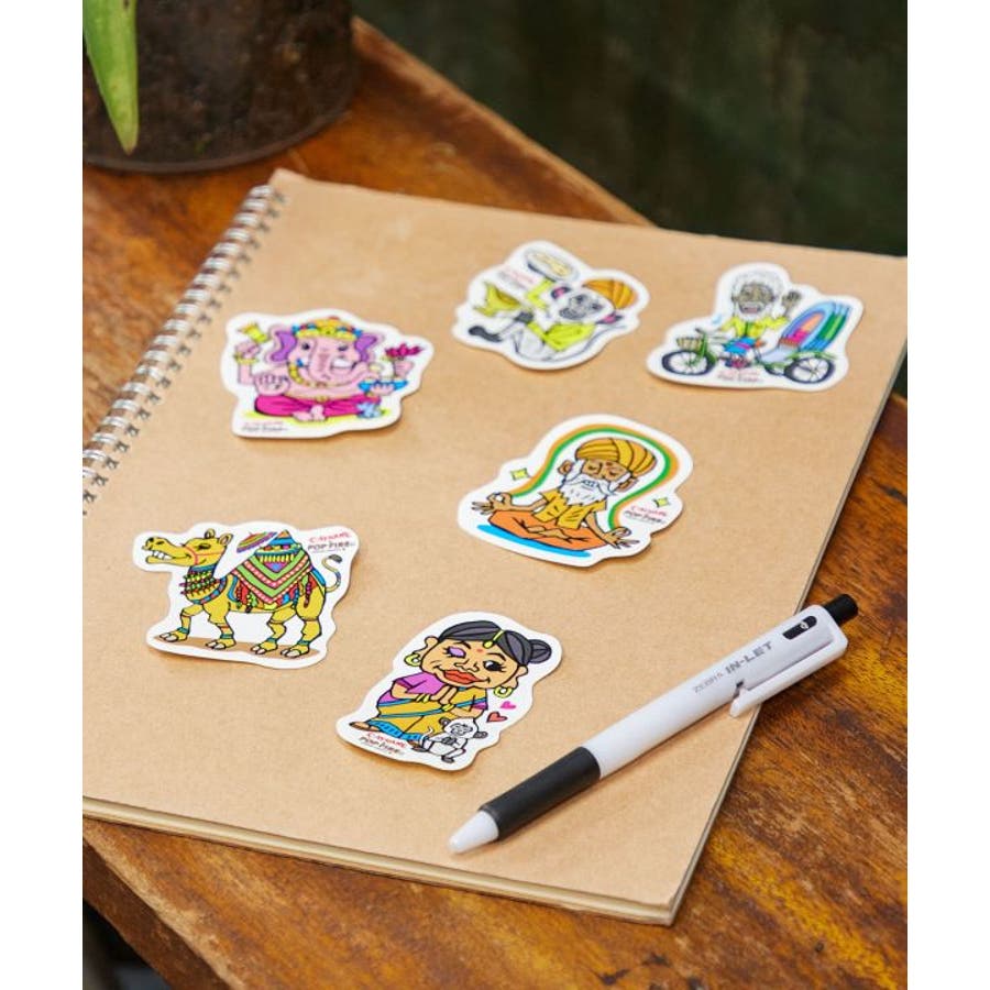 【Amina×POP FIRE】ウシオダヒロアキ氏が描きおろした「インドを象徴する仲間たち」のステッカー。インドカルチャーをポップ&カラフルに表現。日焼けや水に強い耐久性に優れた素材で、キャンプギアや車に貼って使用できる。