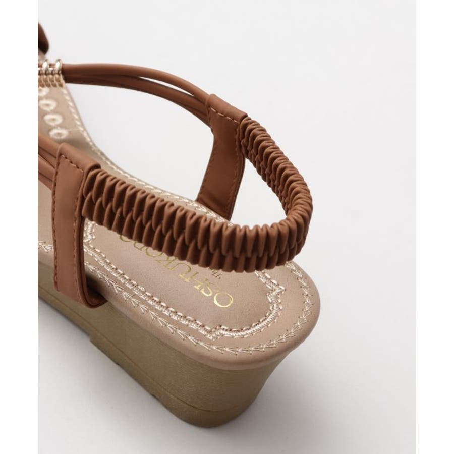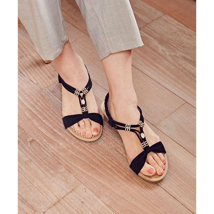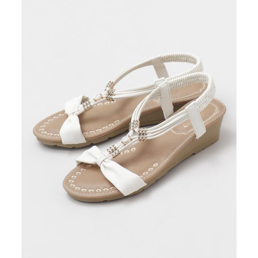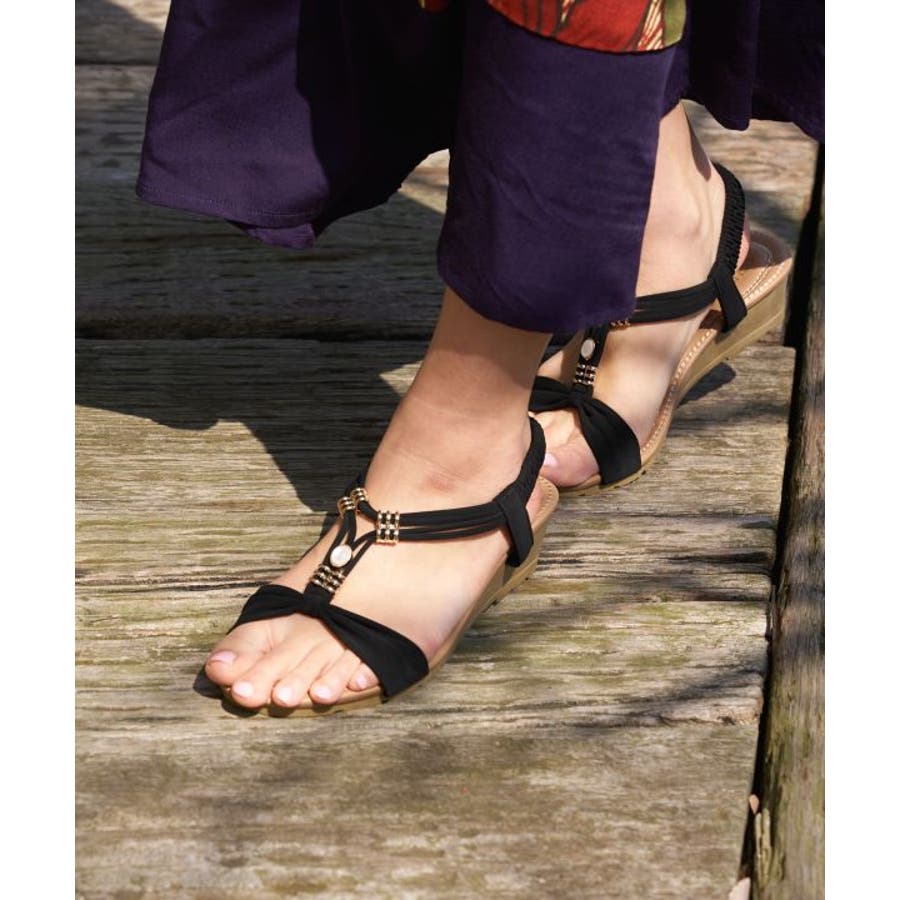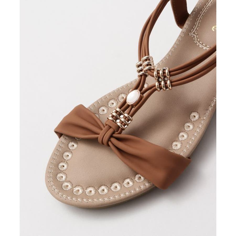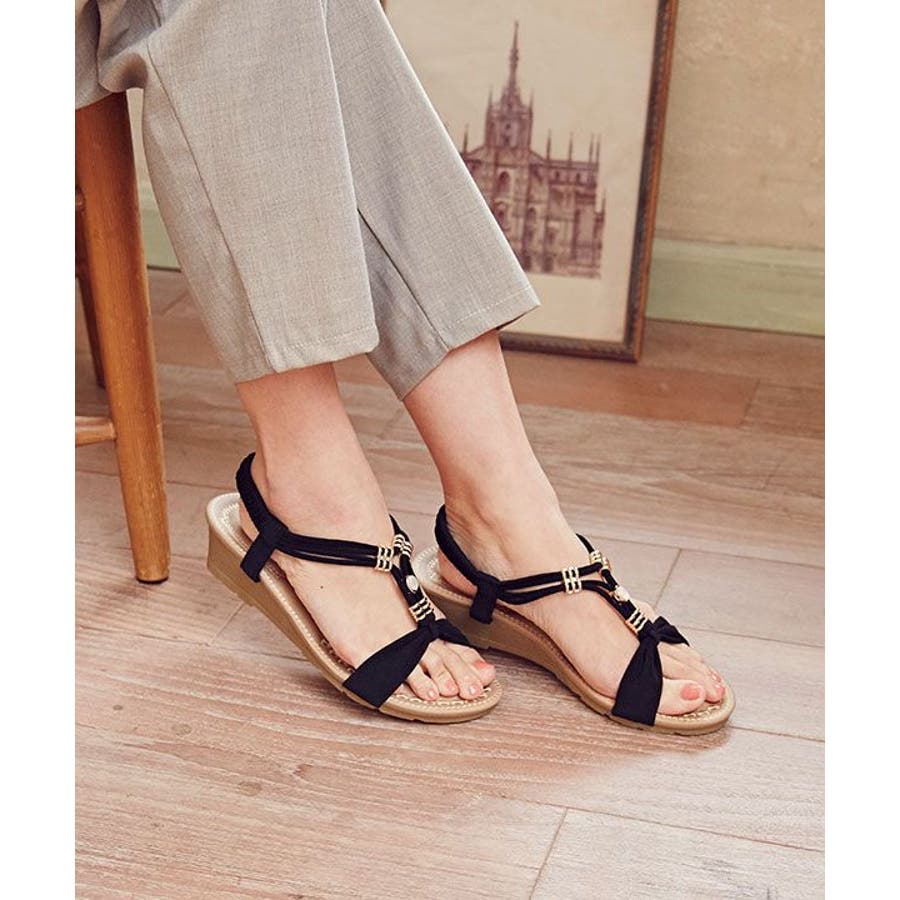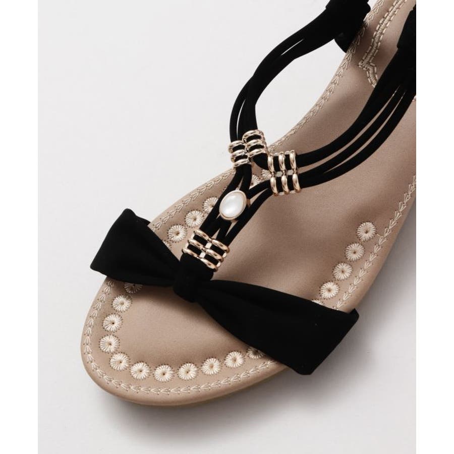 メタルパーツで美しく飾られたストラップが印象的なサンダル。バックストラップがゴム仕様で程よく足にフィット。高すぎないウェッジヒールと、クッションが効いたふかふかのインソールで履き心地が良く疲れにくいのがポイントです。ベーシックカラーなので、どんなスタイルにもマッチします。