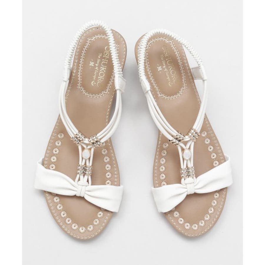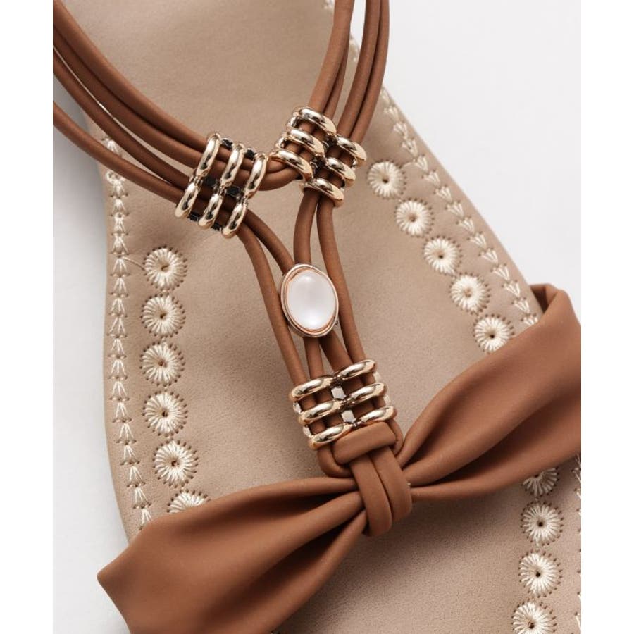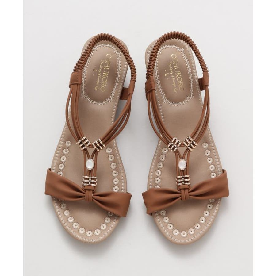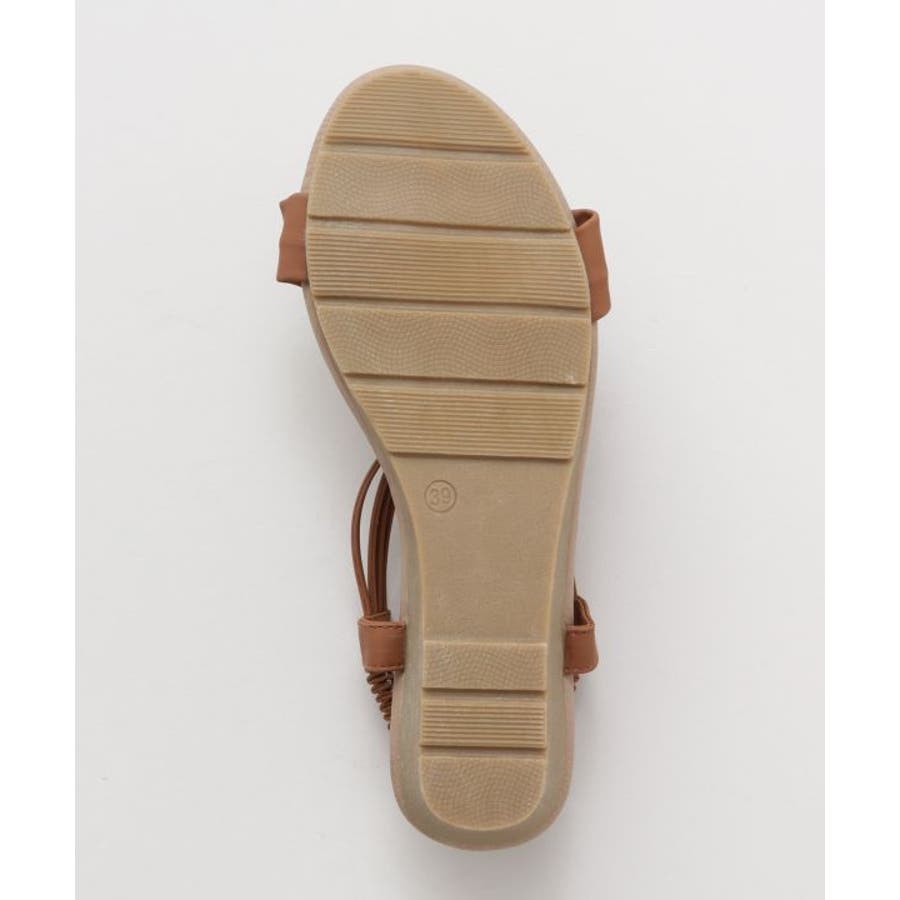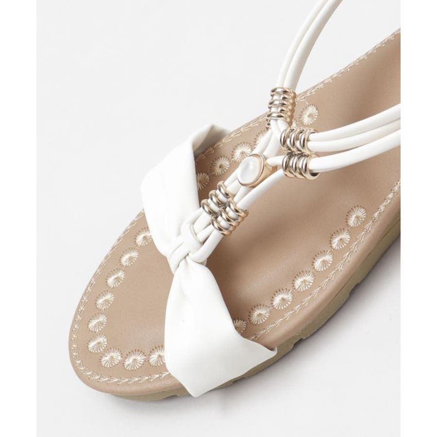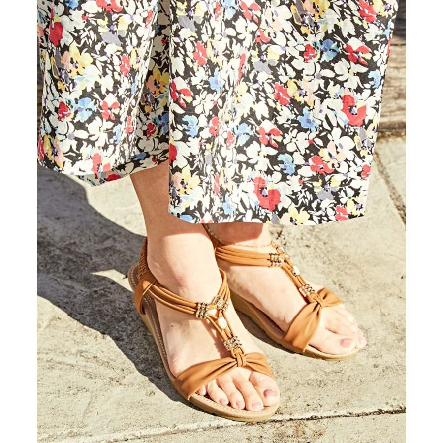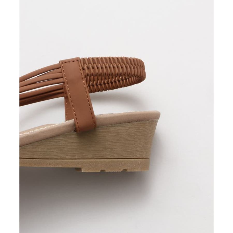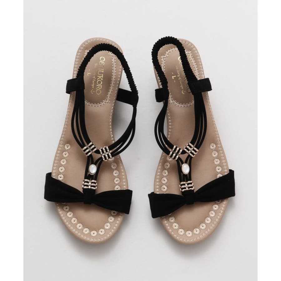 メタルパーツで美しく飾られたストラップが印象的なサンダル。バックストラップがゴム仕様で程よく足にフィット。高すぎないウェッジヒールと、クッションが効いたふかふかのインソールで履き心地が良く疲れにくいのがポイントです。ベーシックカラーなので、どんなスタイルにもマッチします。