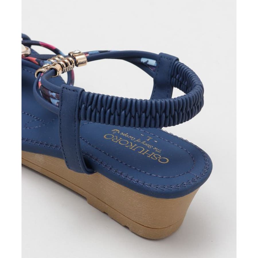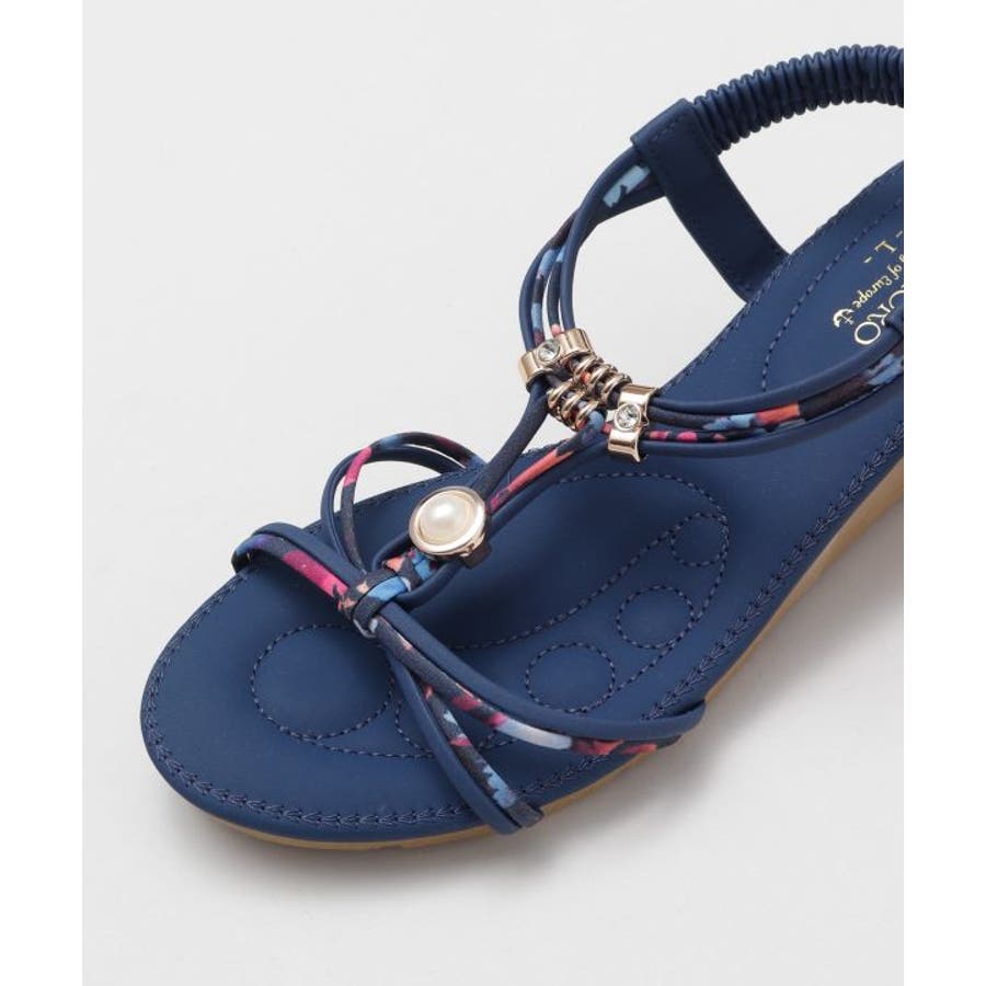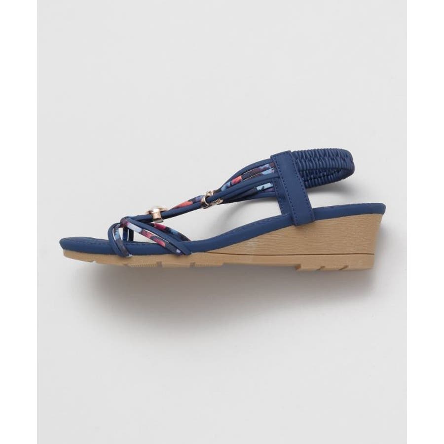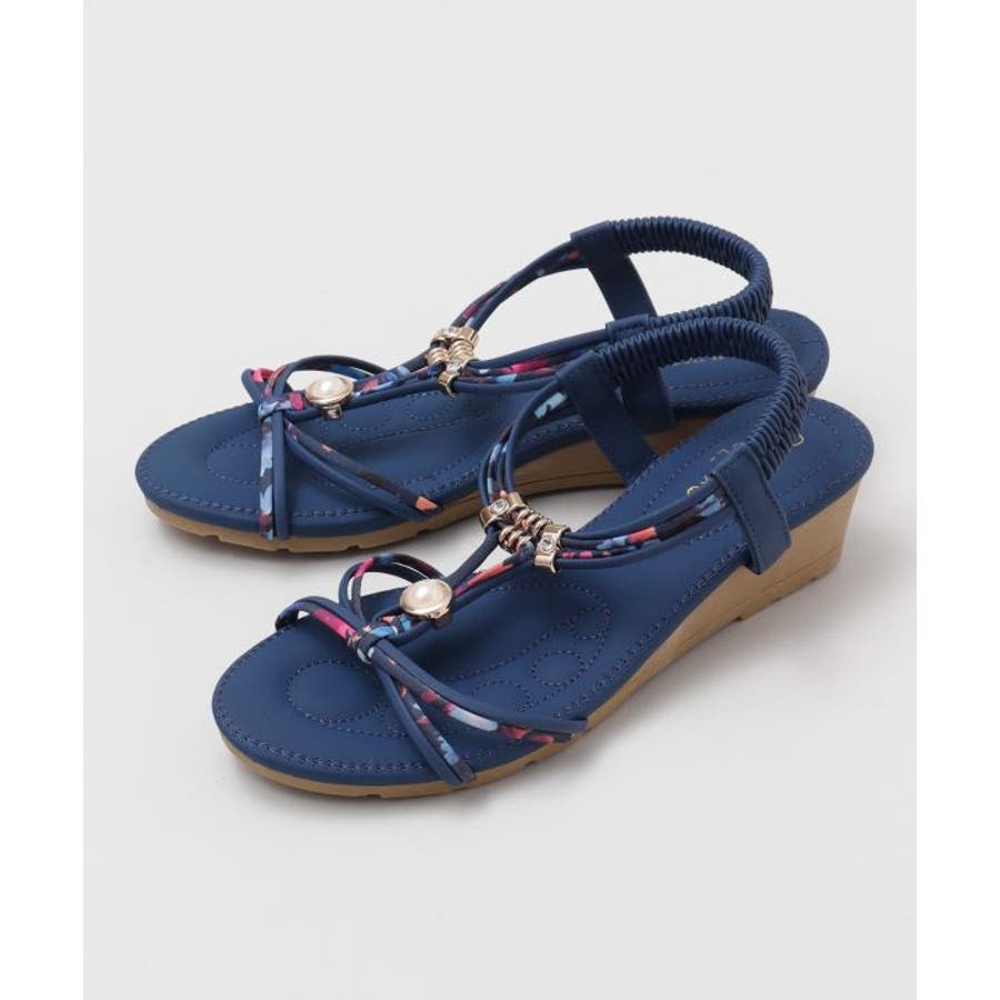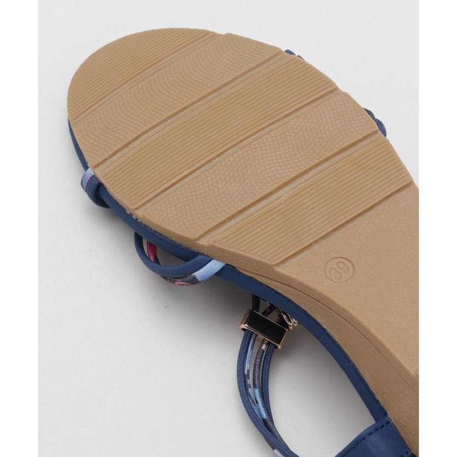 イタリア製のスカーフを使ったストラップがおしゃれなサンダル。バックストラップがゴム仕様で程よく足にフィット。高すぎないウェッジヒールと、クッションが効いたふかふかのインソールで履き心地が良く疲れにくいのがポイントです。メタルパーツで美しく飾られ、華やかな印象。