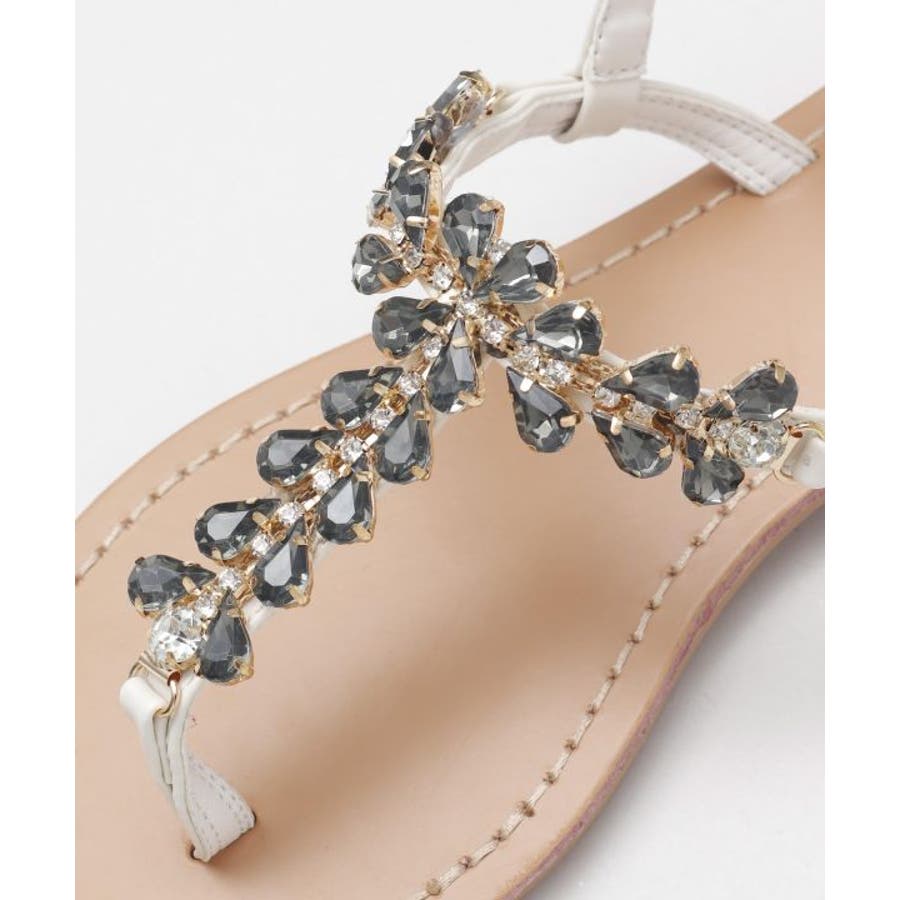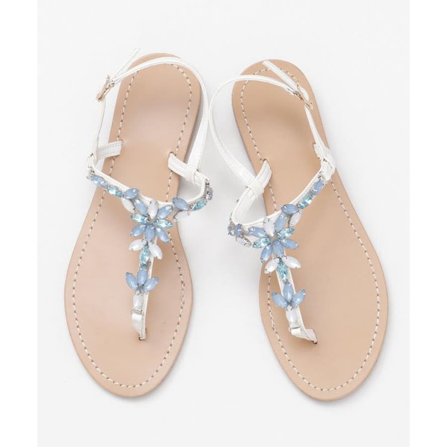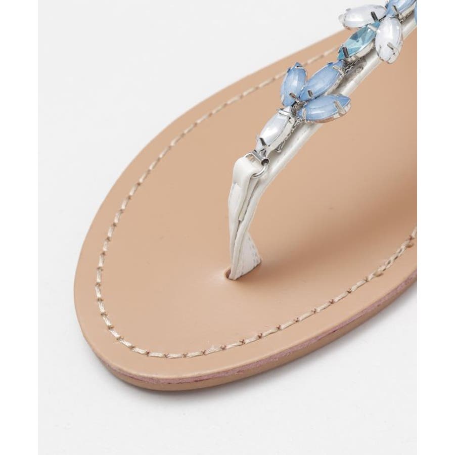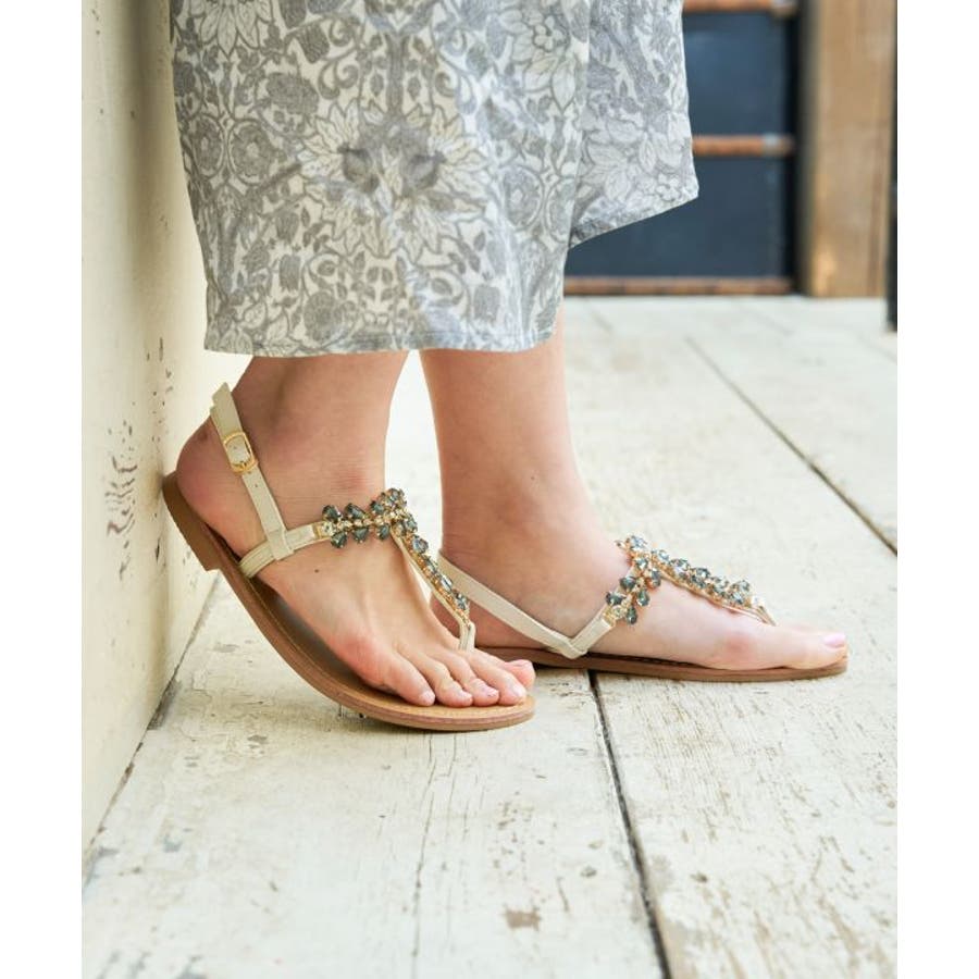 南イタリアにあるカプリ島で作られる、カプリサンダルをイメージしたサンダル。きらきらと輝くパーツが涼しげな印象。クッションなしのインソールはフラットで歩きやすく、シャープなシルエットに。