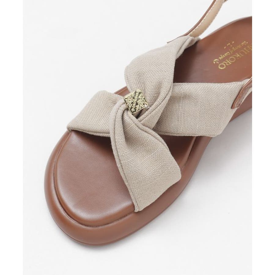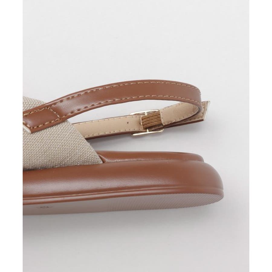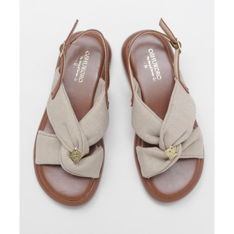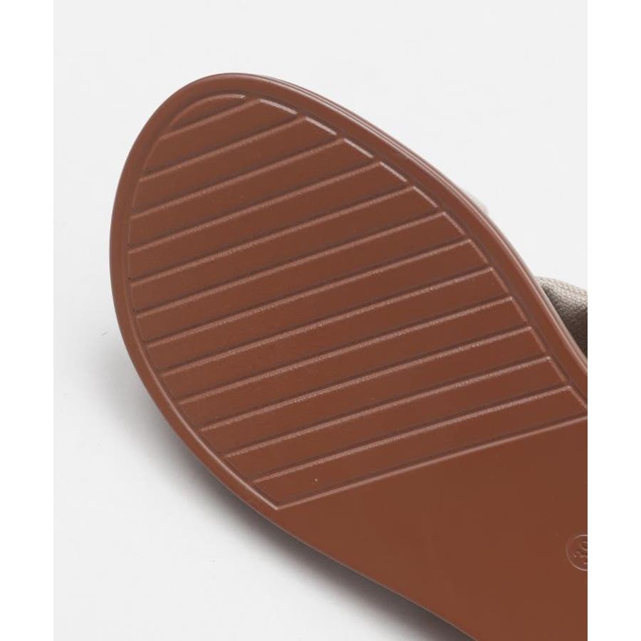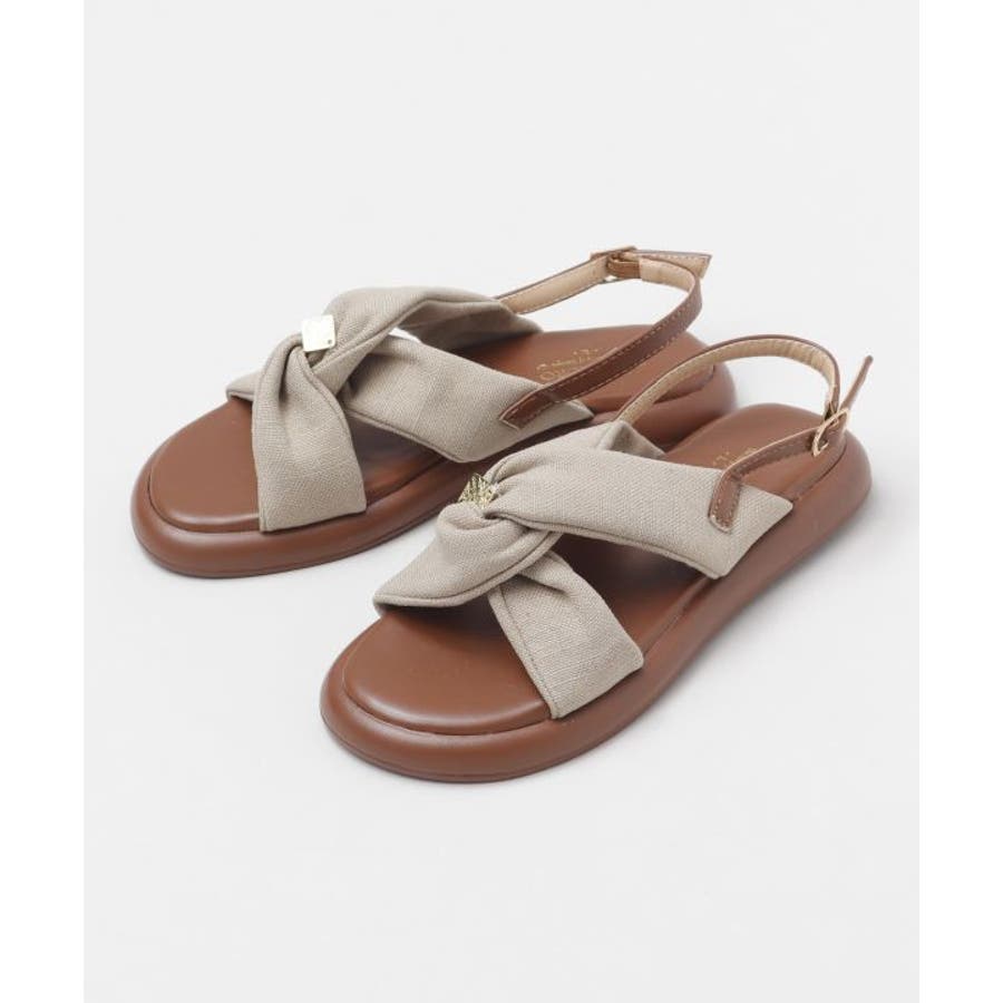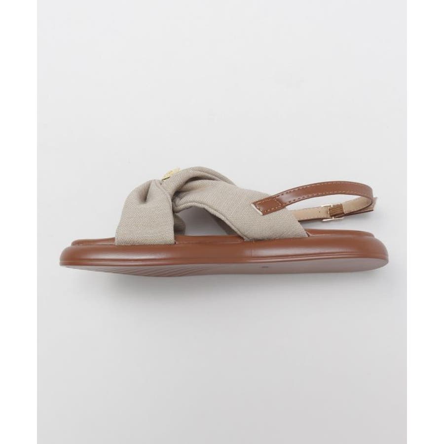 シンプルなカラーの生地を使用した、リボンの真ん中にメタルチップがついたデザインのサンダル。甲の布地はふかふかで広めなことで抜群の安定感。ソールには軽量素材を使用しており、疲れにくいのもポイント。